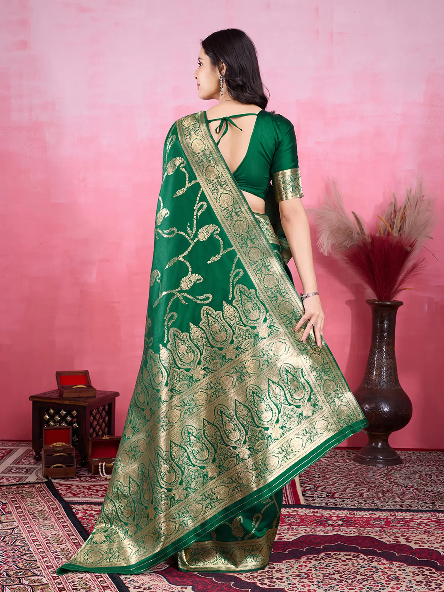The beauty of this saree lies in its elaborate weaving. Delicate, golden motifs are meticulously woven throughout the fabric, creating a mesmerizing pattern that catches the light with every movement. These traditional yet contemporary designs speak volumes of artisanal craftsmanship. The pallu, a contrasting element that adds a dramatic flair, is equally embellished, drawing the eye with its rich detail and vibrant sheen. The combination of the deep green body and the ornate golden pallu creates a striking visual appeal, making this saree a true statement piece.