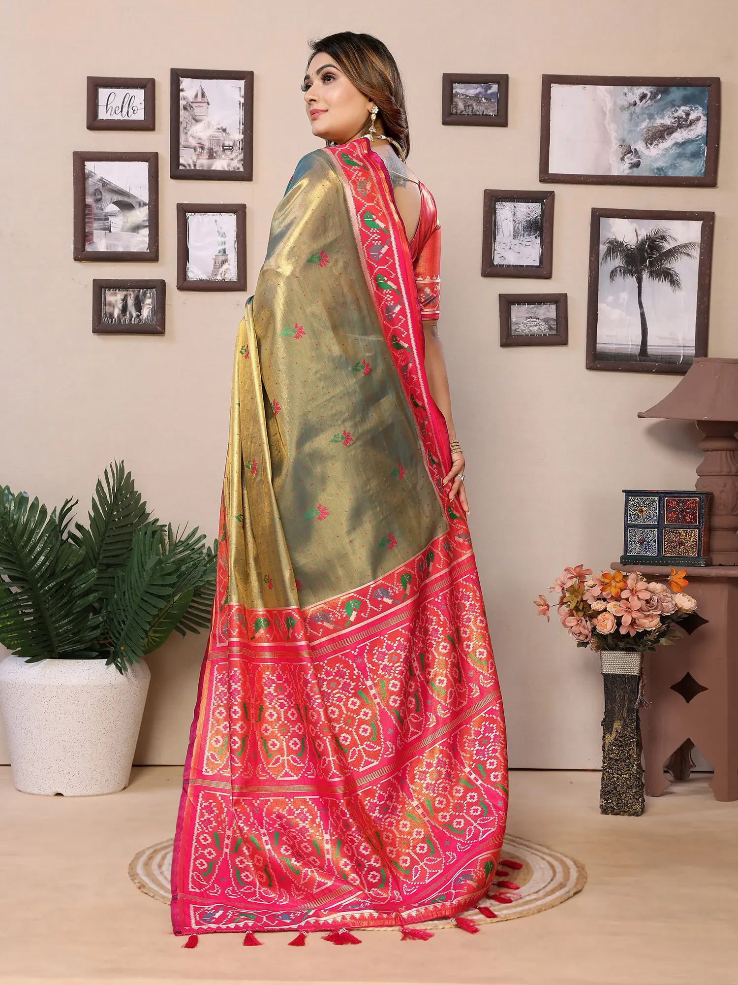 The interplay of colors and textures in this saree is designed to be visually arresting. The primary hue of the saree provides a sophisticated backdrop for the vibrant details of the border and pallu. The Tissue Silk itself possesses an inherent luminescence, which is beautifully complemented by the rich, intricate patterns woven into its fabric. This saree is more than just an outfit; it's an expression of refined taste and a celebration of Indian tradition, designed to make you feel radiant and confident. Perfect for those who appreciate the finer things in life and wish to make a memorable style statement.