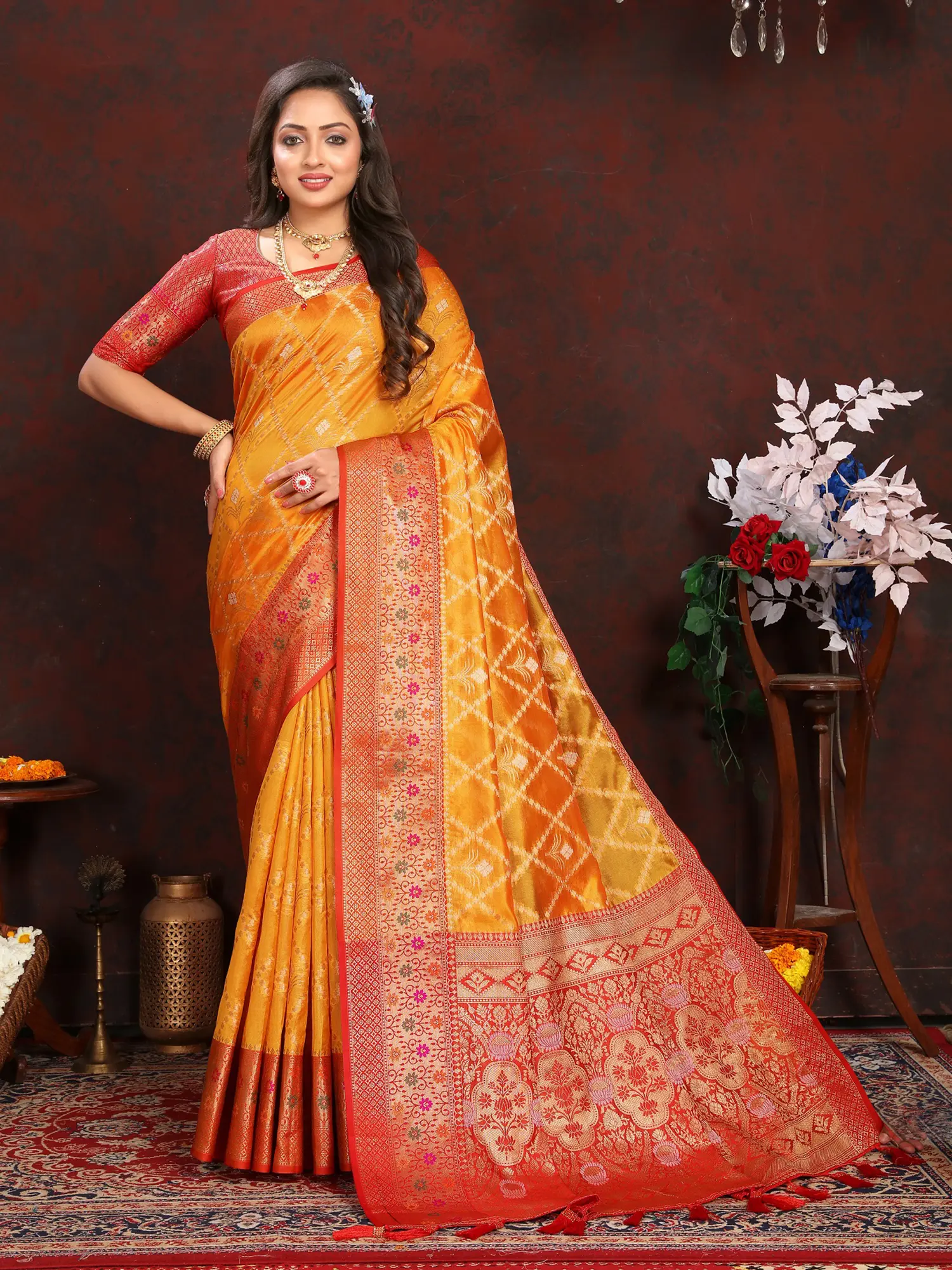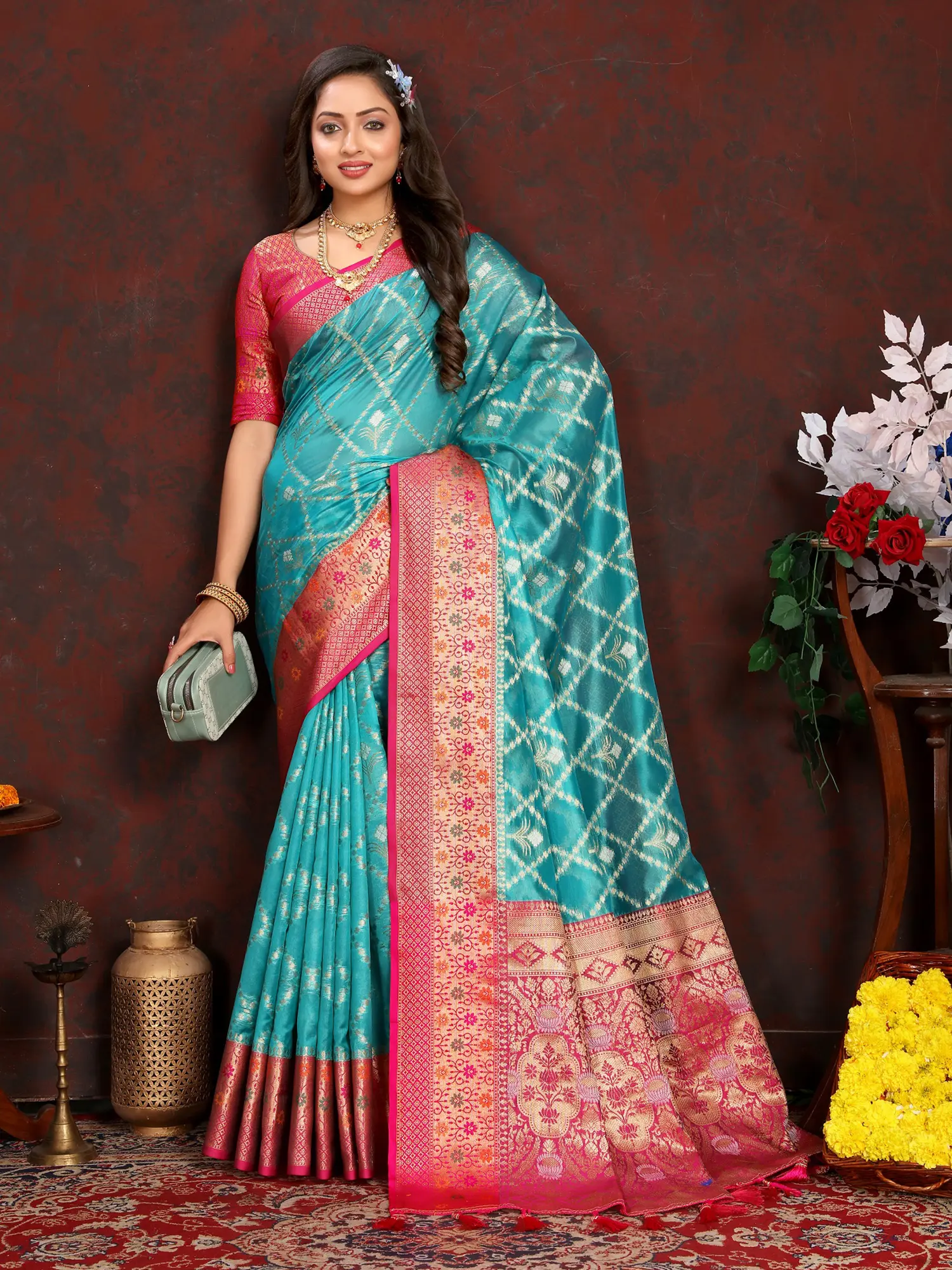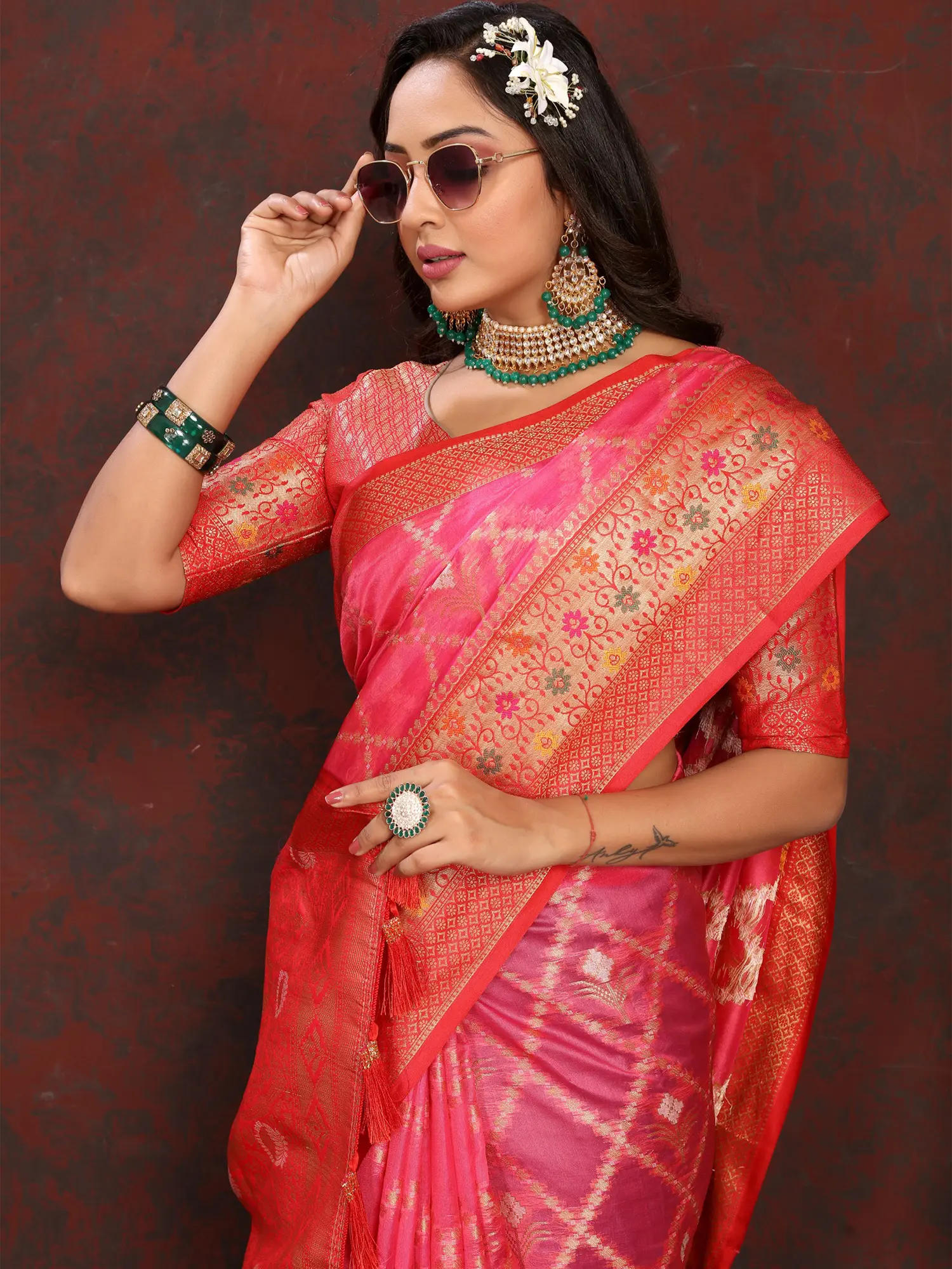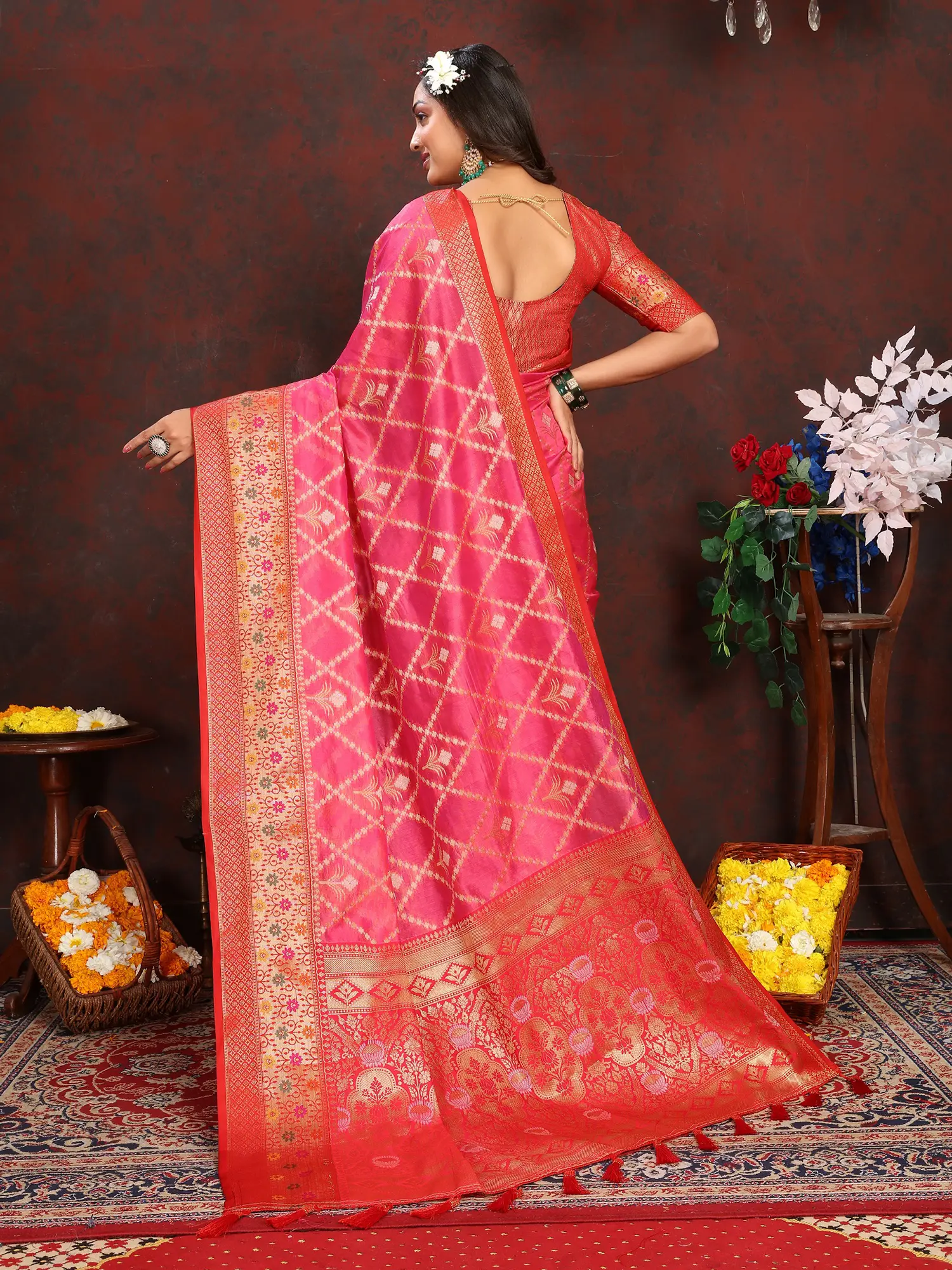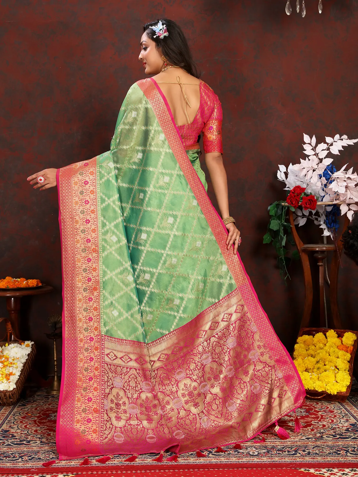 Traditional Banarasi Silk Wide Border Attractive Festive Wear Saree With Contrast Tassels Pallu