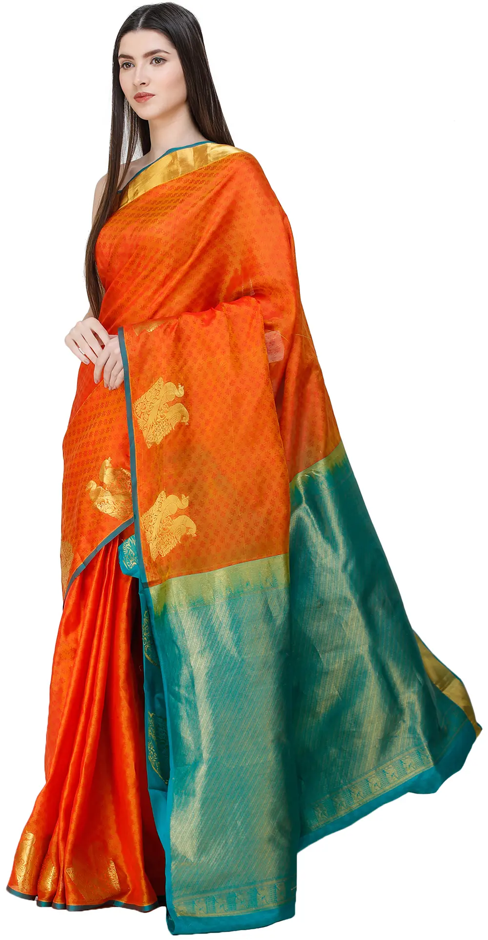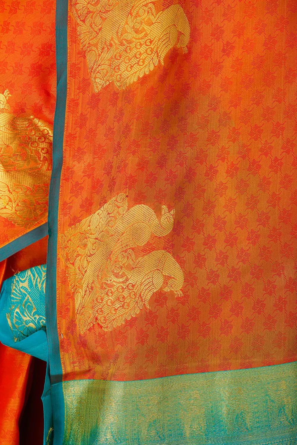 The true magic of this saree lies in its intricately designed borders. Here, a striking contrast is created with a deep teal blue, a hue that complements the autumnal orange beautifully. The border is adorned with stunning brocade work, featuring motifs of majestic peacocks rendered in lustrous gold thread. These regal birds, symbols of beauty, grace, and prosperity, are depicted with intricate detail, their plumes and forms gracefully woven into the fabric. The gold zari work not only highlights the peacock motifs but also creates a dazzling border that frames the entire saree, adding a touch of regal opulence. The pallu, the decorative end piece of the saree, showcases this border design prominently, creating a breathtaking display of artistry as it drapes.