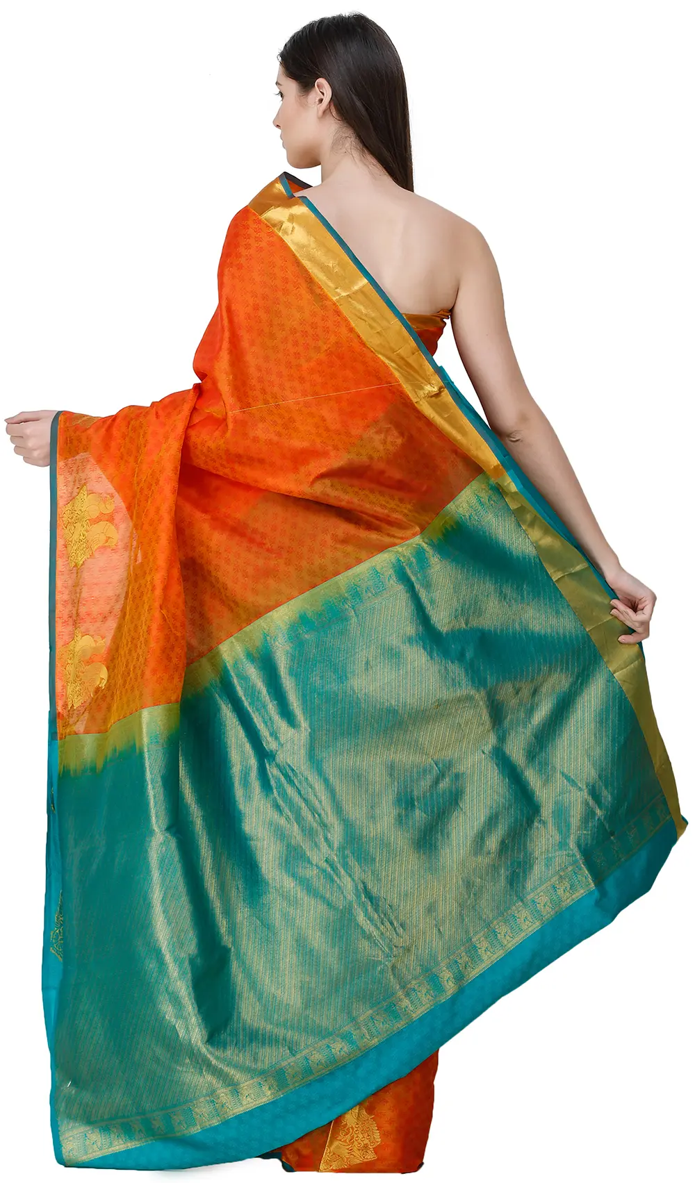 Immerse yourself in the rich tapestry of Indian craftsmanship with this exquisite pure silk saree, a masterpiece originating from the esteemed weaving traditions of Bangalore. The vibrant "Autumn-Maple" hue, a captivating shade of deep orange, evokes the warmth and splendor of the fall season, making it a perfect choice for festive occasions, celebratory gatherings, or moments when you wish to command attention with understated grace. The fabric itself is a testament to meticulous artistry, featuring a self-woven pattern that adds subtle texture and depth, catching the light with every movement.