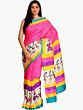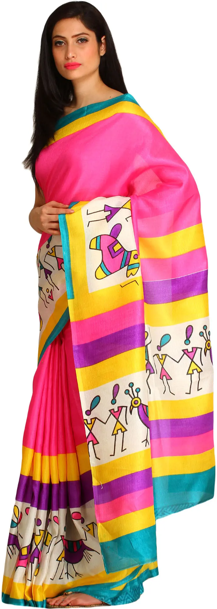 Azalea-Pink Bhagalpuri Saree with Printed Warli Folk Motifs and Striped Border