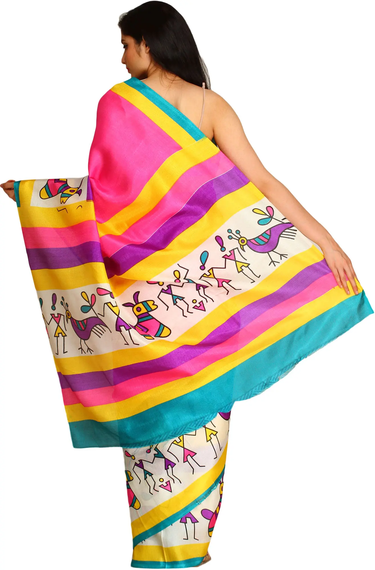 Adding a unique dimension to this already captivating piece are the intricately printed Warli folk motifs. These charming depictions of human figures, animals, and daily life are rendered in a classic black outline with pops of color – including the same energetic shades found in the border. The Warli art style, originating from the indigenous tribes of Maharashtra, is renowned for its simplicity and storytelling power. Here, it breathes life into the fabric, transforming the saree into a wearable piece of art that tells a tale of tradition and community. The motifs are strategically placed, appearing along the pallu and the lower edge of the saree, ensuring that your style makes a statement from every angle.