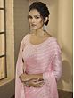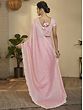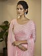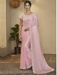 Contemporary style and traditional appeal meet on the drape of this taffeta silk saree. With a graceful baby pink tone, the saree is delicately beautiful, a feel which is amplified by the wavey pattern all over, inspired by the traditional leheriya sarees of Rajasthan. A tinge of glimmer is added to the spread with tiny sequins and exquisite floral embroidery on the scalloped border of the saree. Gorgeous floral embroidery on the matching blouse completes your look for the galas and festive occasions, where you wish to carry an understated, queenly vibe.