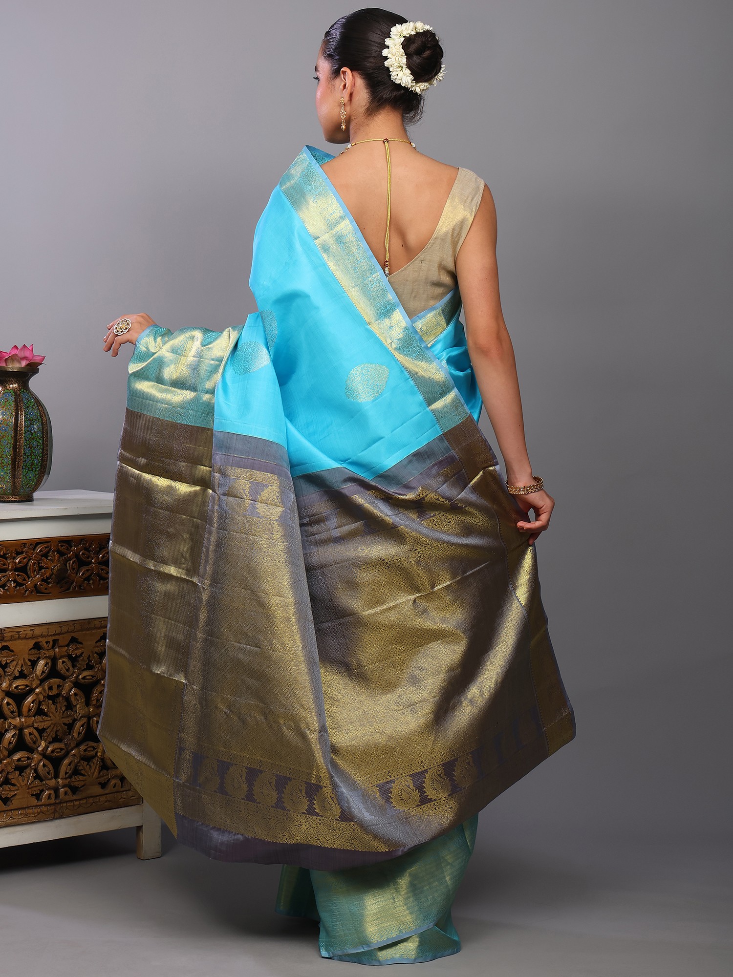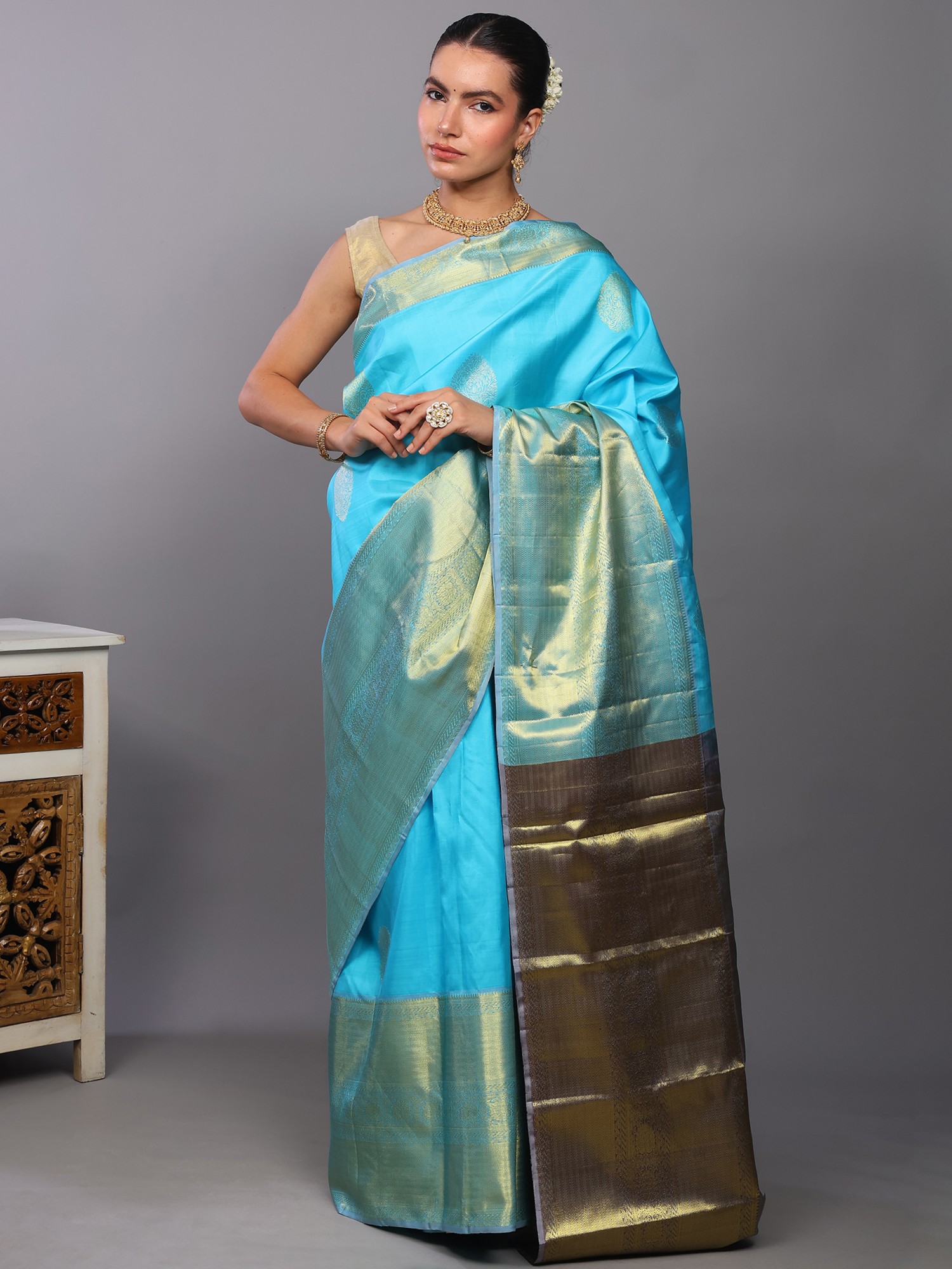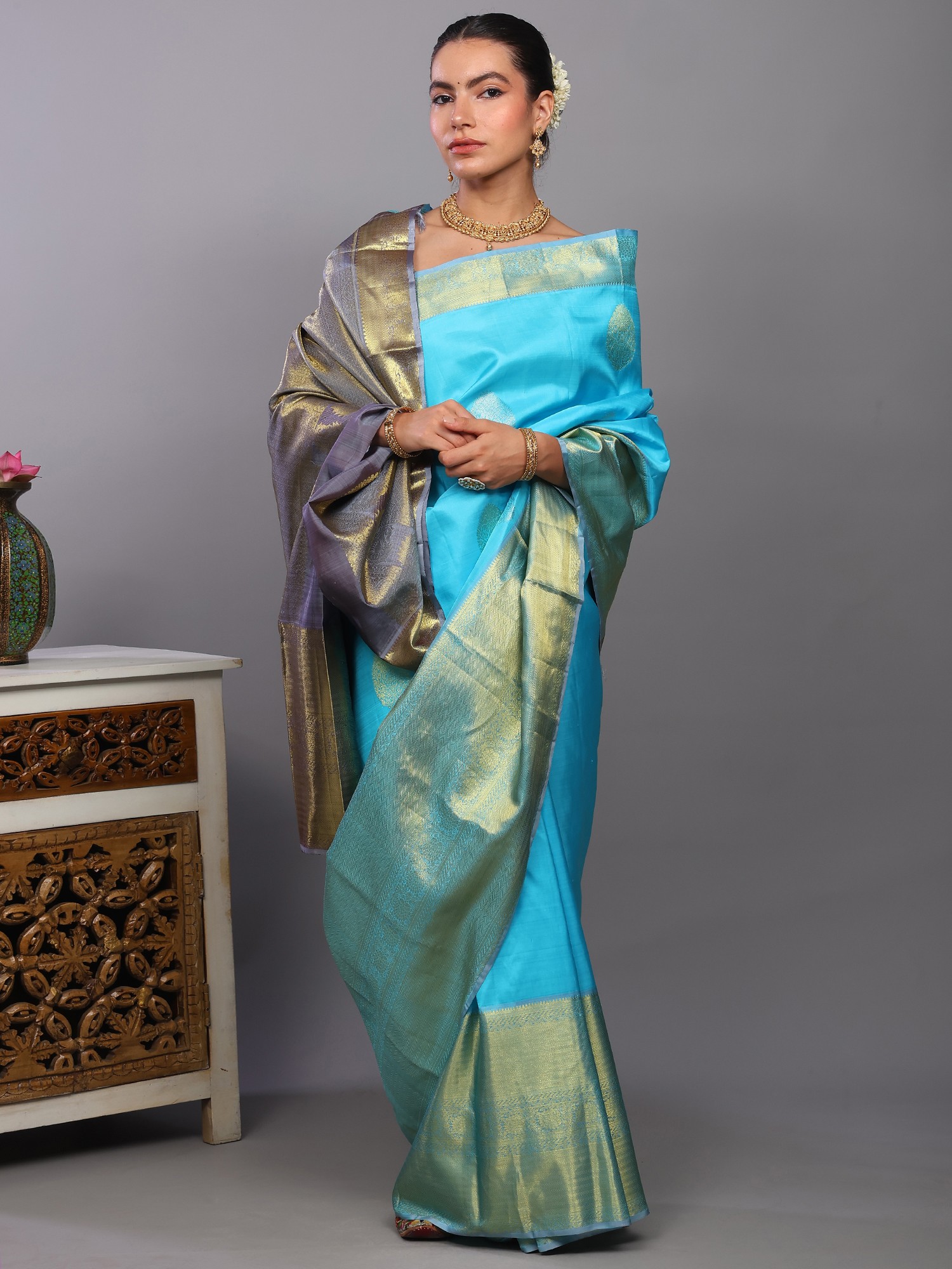 Bachelor-Blue Pure Silk Kanjivaram Handloom Saree with Zari woven Floral Bootis and Extra Wide Chevron Border from Bangalore