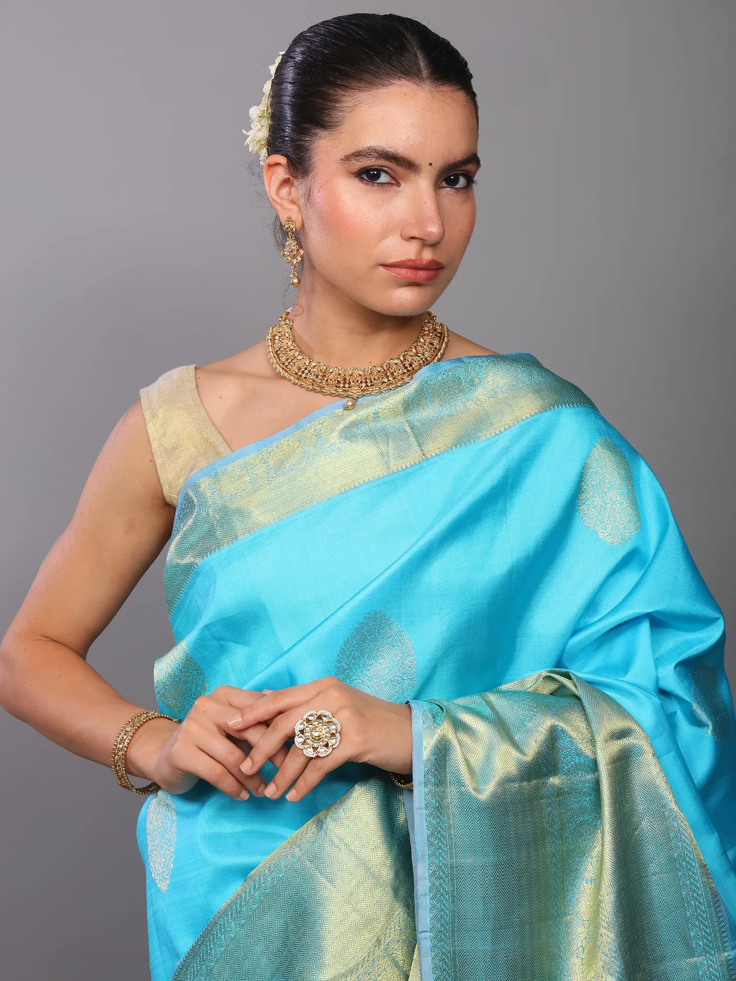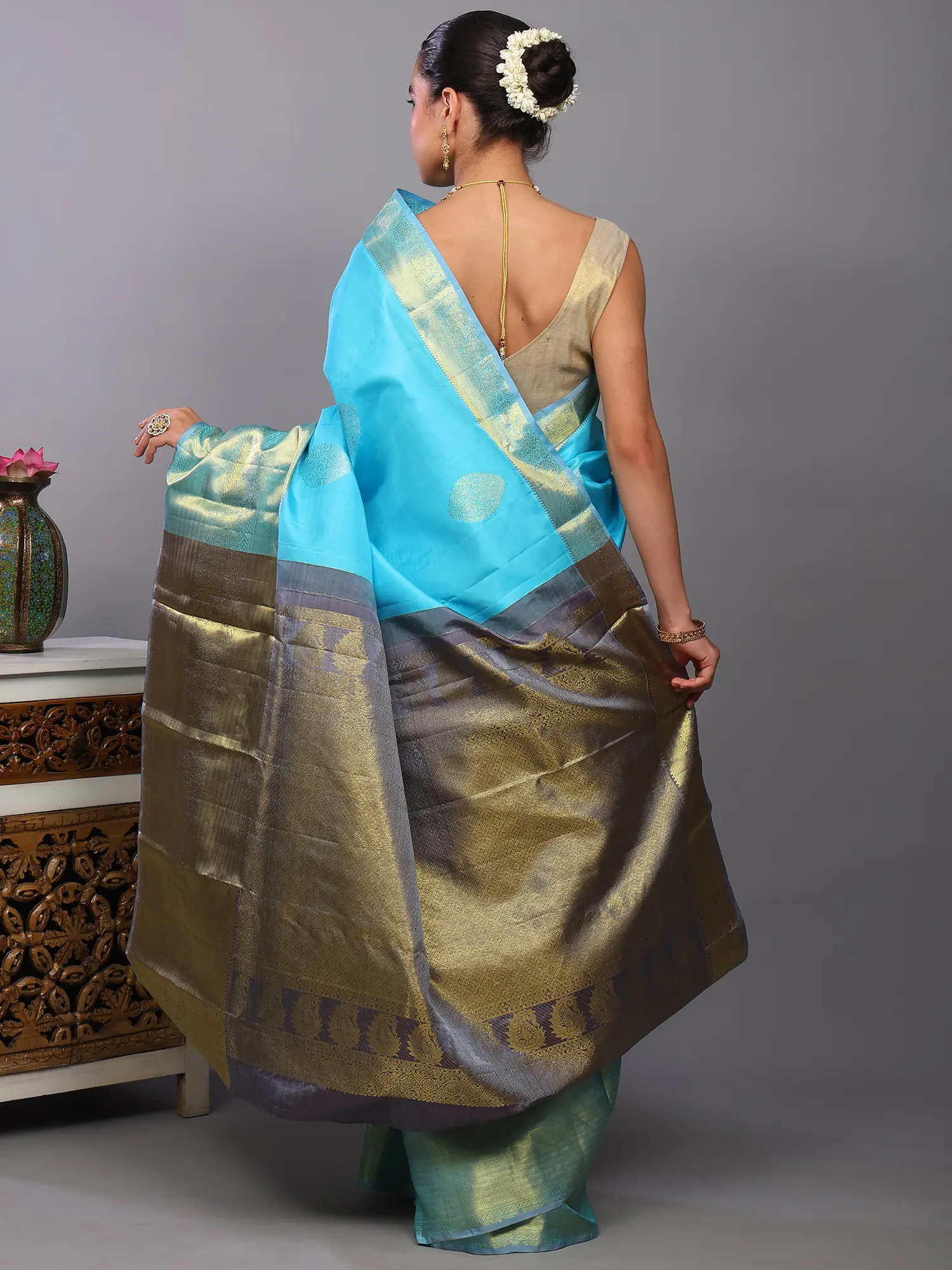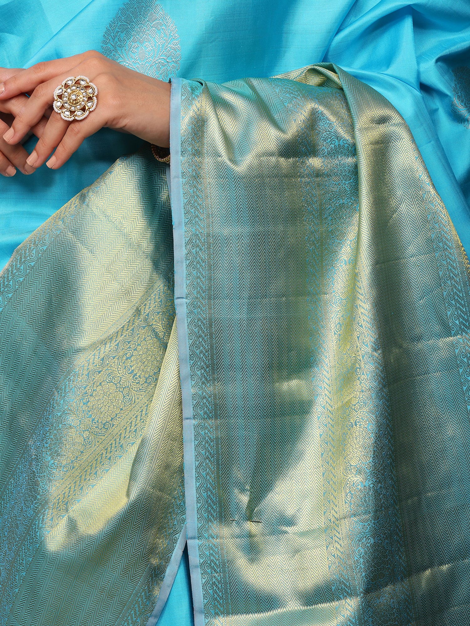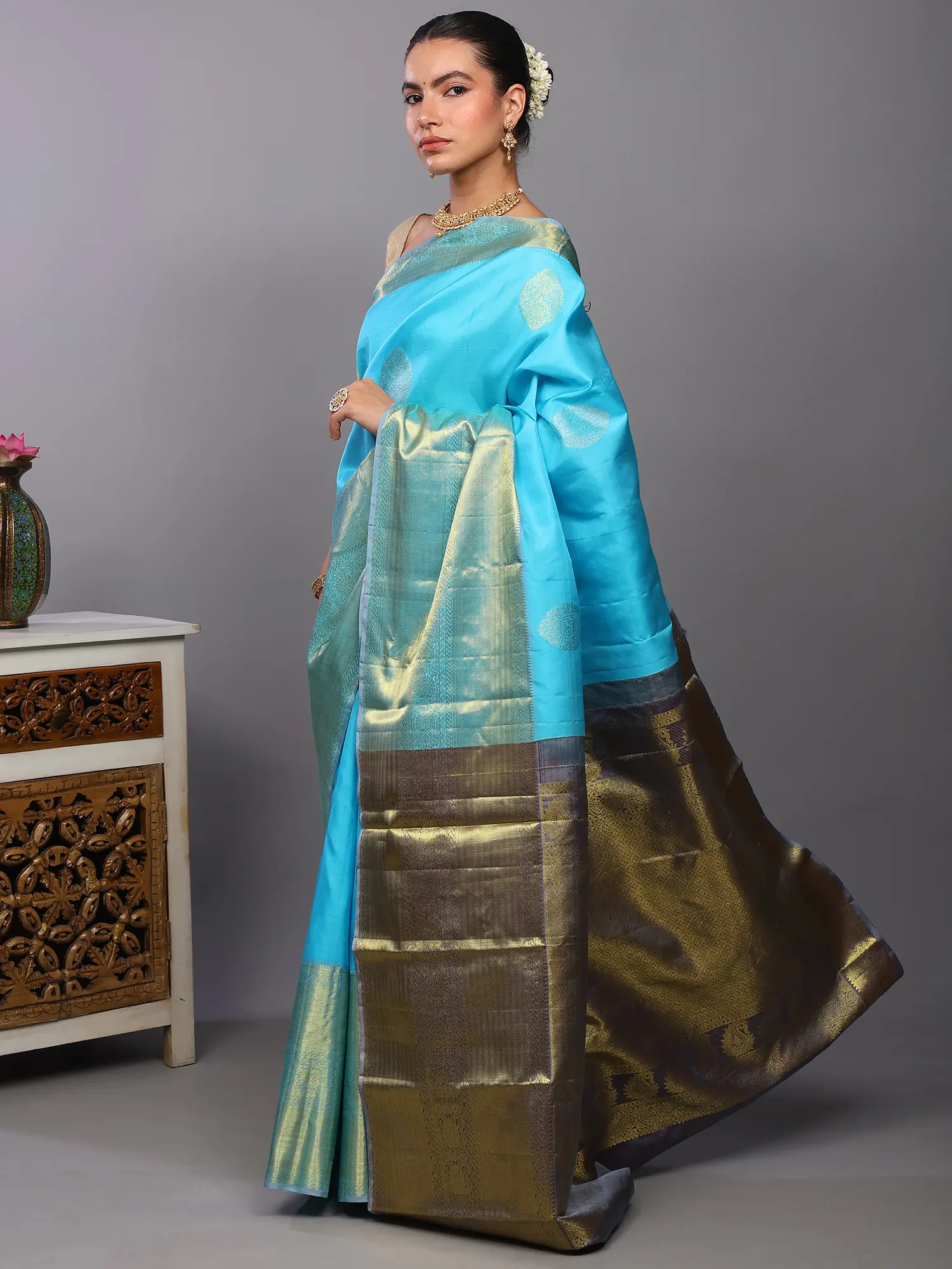 Bachelor-Blue Pure Silk Kanjivaram Handloom Saree with Zari woven Floral Bootis and Extra Wide Chevron Border from Bangalore