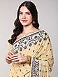 The base hue, reminiscent of sun-kissed banana crepe, serves as a perfect canvas for the rich, indigo and muted green motifs that dance across its expanse. Tiny, scattered bootis add a playful charm, while the broader border unfolds a narrative of stylized flora and geometric precision. The pallu, finished with a graceful fringe of tassels, offers a final flourish of understated elegance. The accompanying blouse fabric is designed to complement, ensuring a harmonious ensemble that speaks volumes through its refined details.