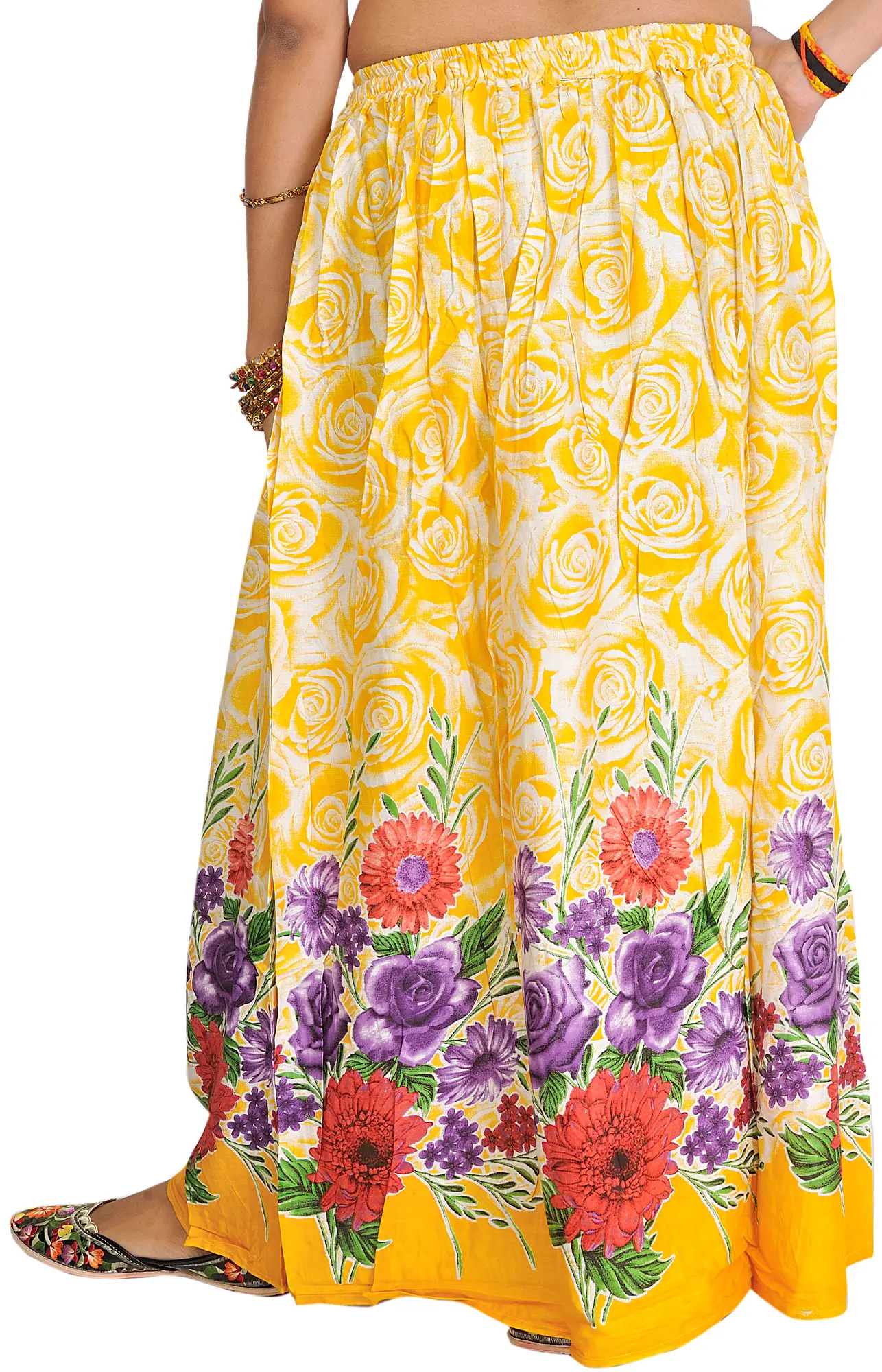 Adding a touch of bohemian charm, a lively border of colorful flowers graces the hemline. Deep purples, vibrant oranges, and rich reds burst forth in a beautiful floral arrangement, accented by lush green leaves. This thoughtfully designed border adds a captivating contrast and draws the eye downwards, enhancing the skirt's graceful flow. Crafted from pure cotton, this skirt promises breathability and comfort, making it an ideal choice for warm weather or for lounging in style. The elastic waistband ensures a flexible and comfortable fit, accommodating various sizes with ease.