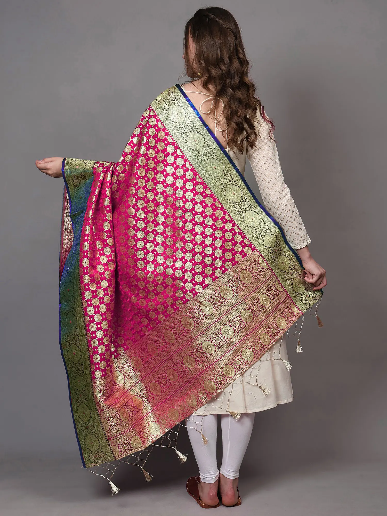 Elevate your ethnic ensemble with this stunning Banarasi art silk dupatta, a masterpiece of traditional Indian craftsmanship. This luxurious dupatta is more than just an accessory; it's a statement piece that radiates elegance and sophistication. The rich, vibrant magenta hue is beautifully complemented by intricate zari woven golden floral bootis scattered across the body, creating a captivating visual tapestry. The contrast border, a striking combination of silver and emerald green, adds a touch of modern flair to this timeless design. The delicate fringe at the bottom provides a beautiful finishing touch, enhancing the overall luxurious feel. Imagine the compliments you'll receive draped over a simple salwar kameez, or adding a touch of regal splendor to a wedding guest outfit. This piece is versatile enough to be styled in countless ways, making it a true wardrobe staple.