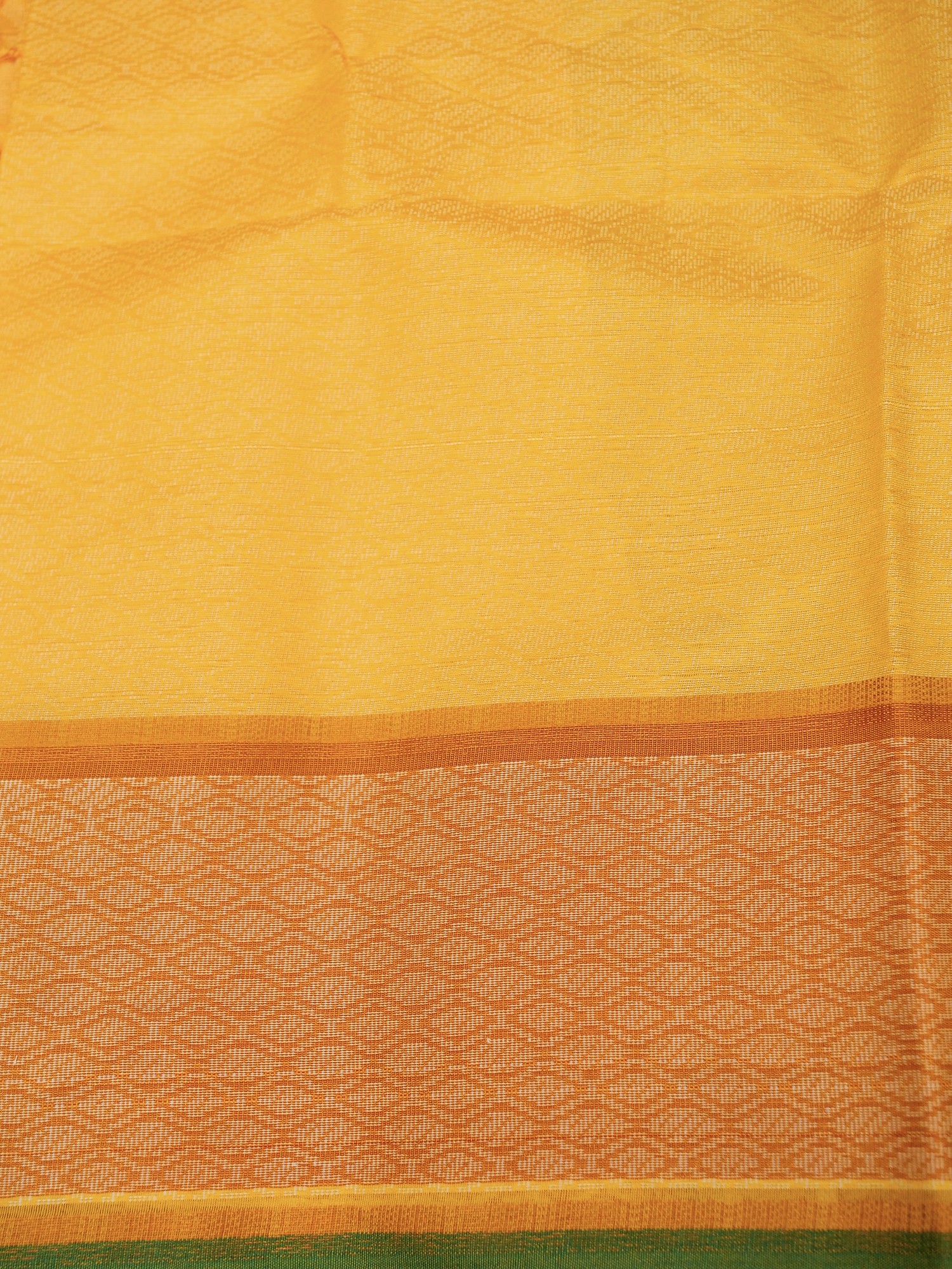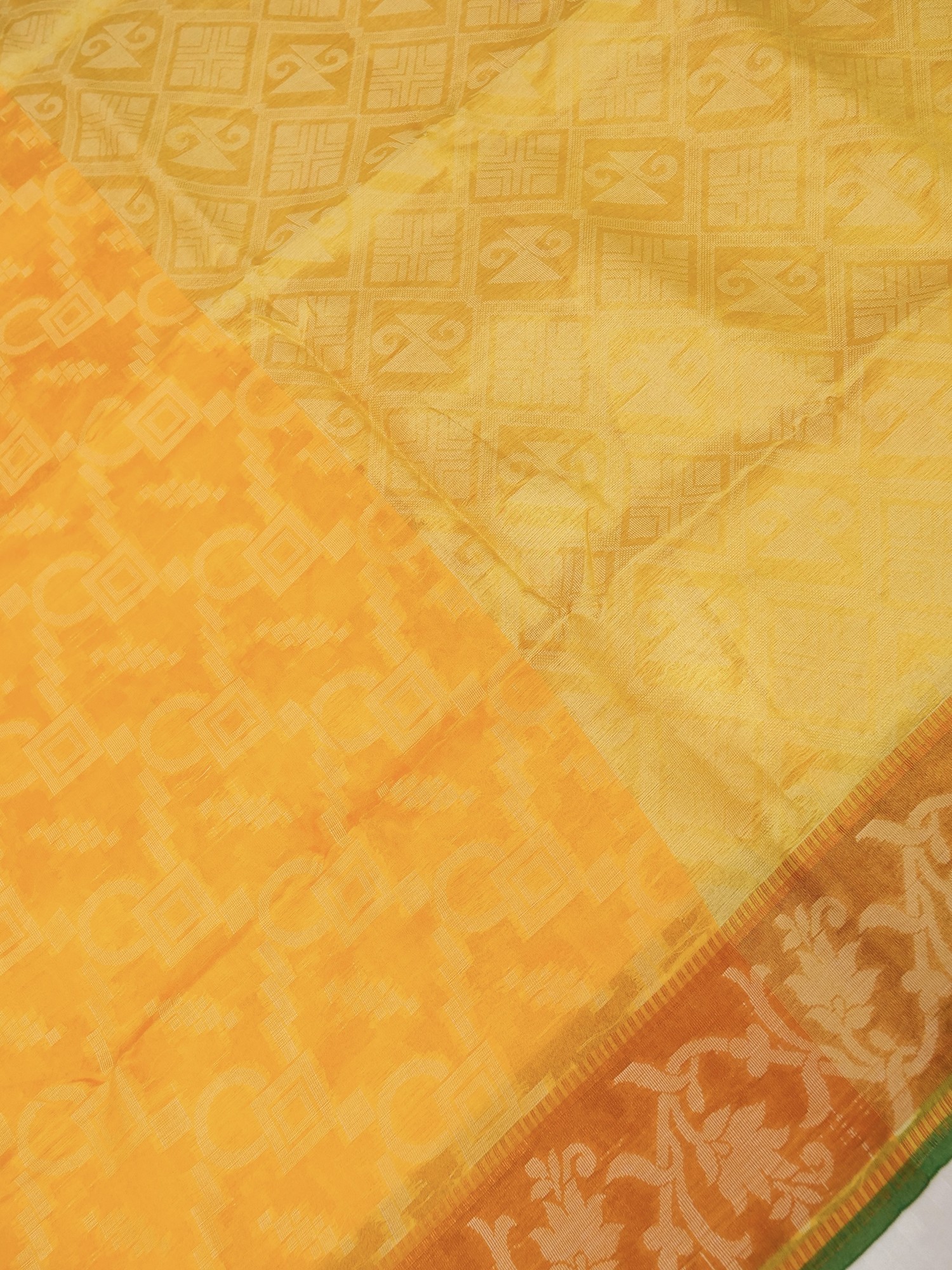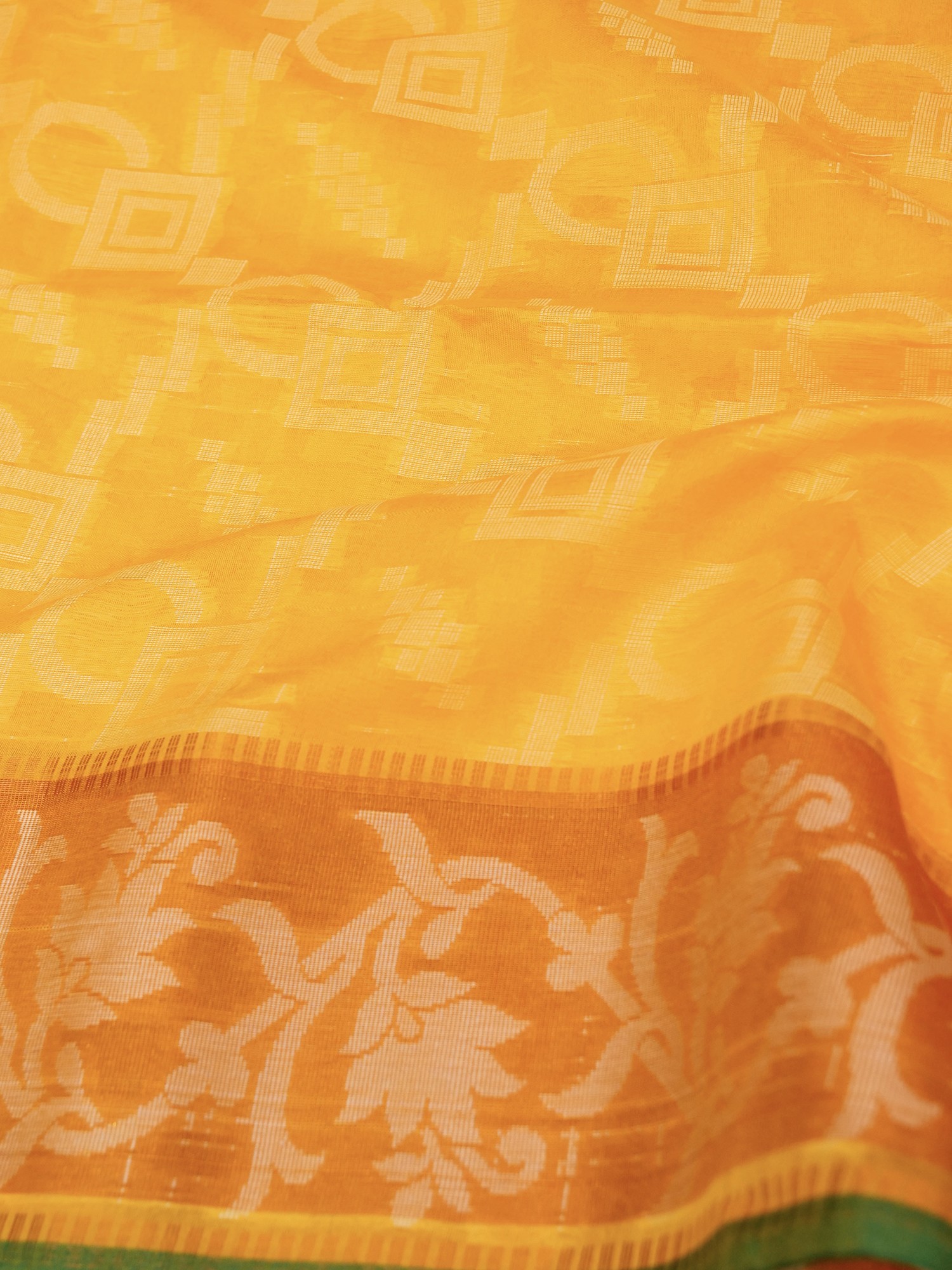 The body of the saree has a neatly woven geometric pattern covering the soft cotton fabric. The border has a contrasting color and a modern rendering of Phool bel or floral creeper pattern woven into it.