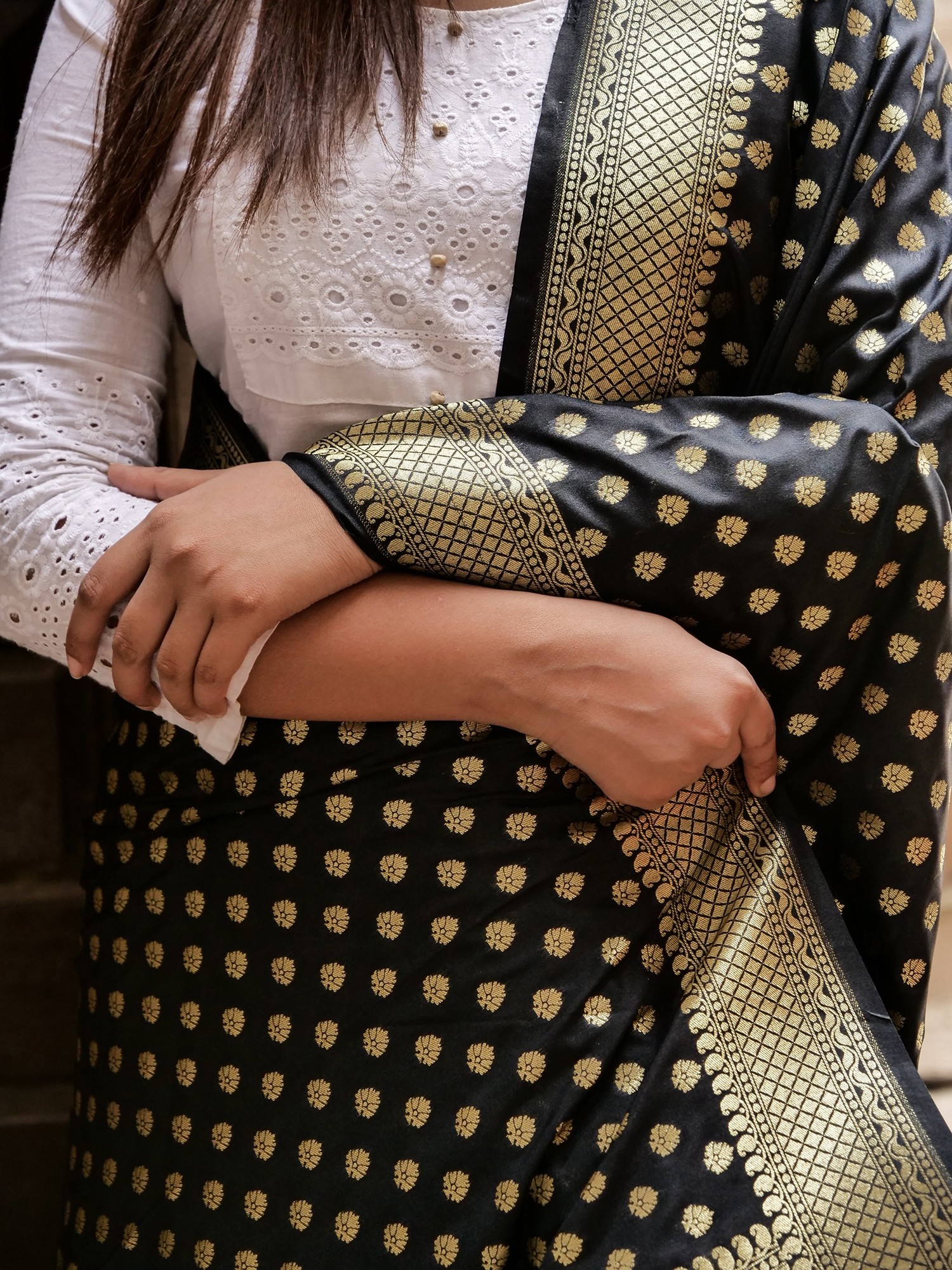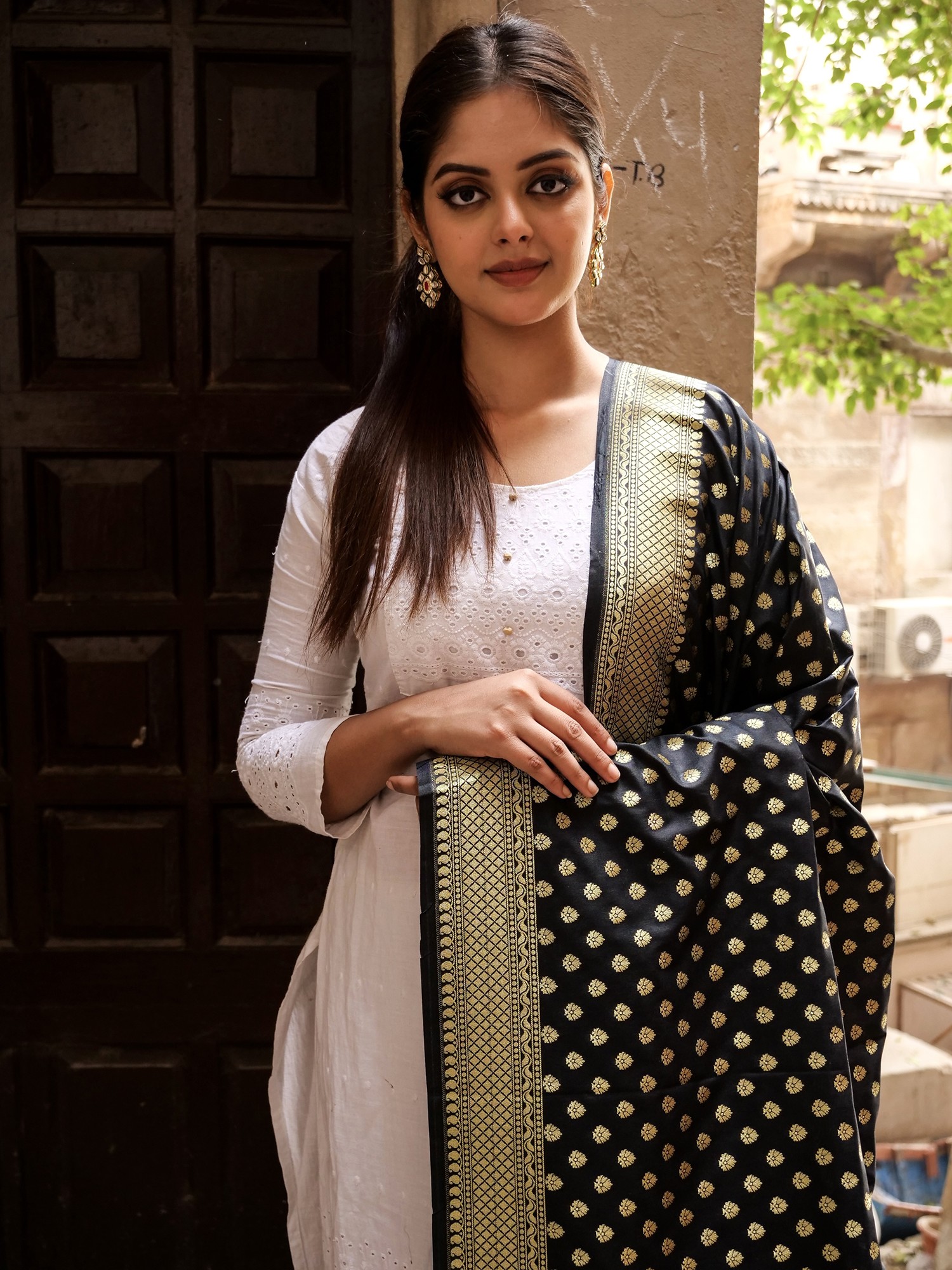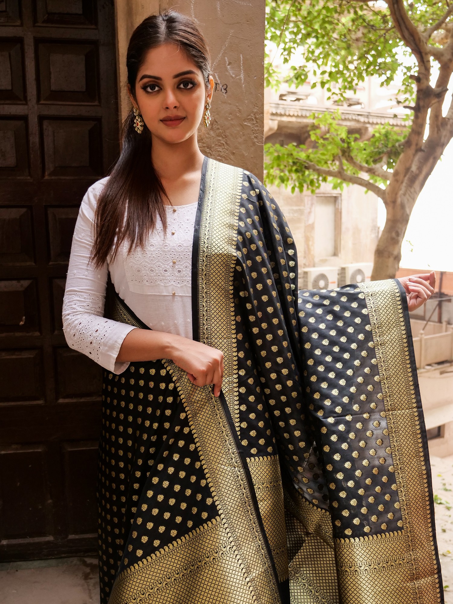 In the heart of Banaras' timeless craftsmanship, the Banarasi dupatta woven with zari and foulard intricate with booti patterns is a treasure trove of artistry. It's as if a piece of history has been woven into every inch of this elegant fabric. Meanwhile, the golden zari weave along the border adds a touch of opulence and grandeur, turning this dupatta into a regal masterpiece. It's not just an accessory; it's a window to the past and a testament to the enduring allure of Banarasi craftsmanship, ready to grace every outfit with timeless elegance.