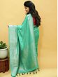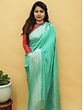 The border of the saree is adorned with ethnic geometric and natural patterns and the pallu of the saree is embellished with a series of paisley motifs placed in a visual balance on the vibrant silk fabric. This Banarasi Saree's pallu is tasseled, giving the attire a gorgeous feel.