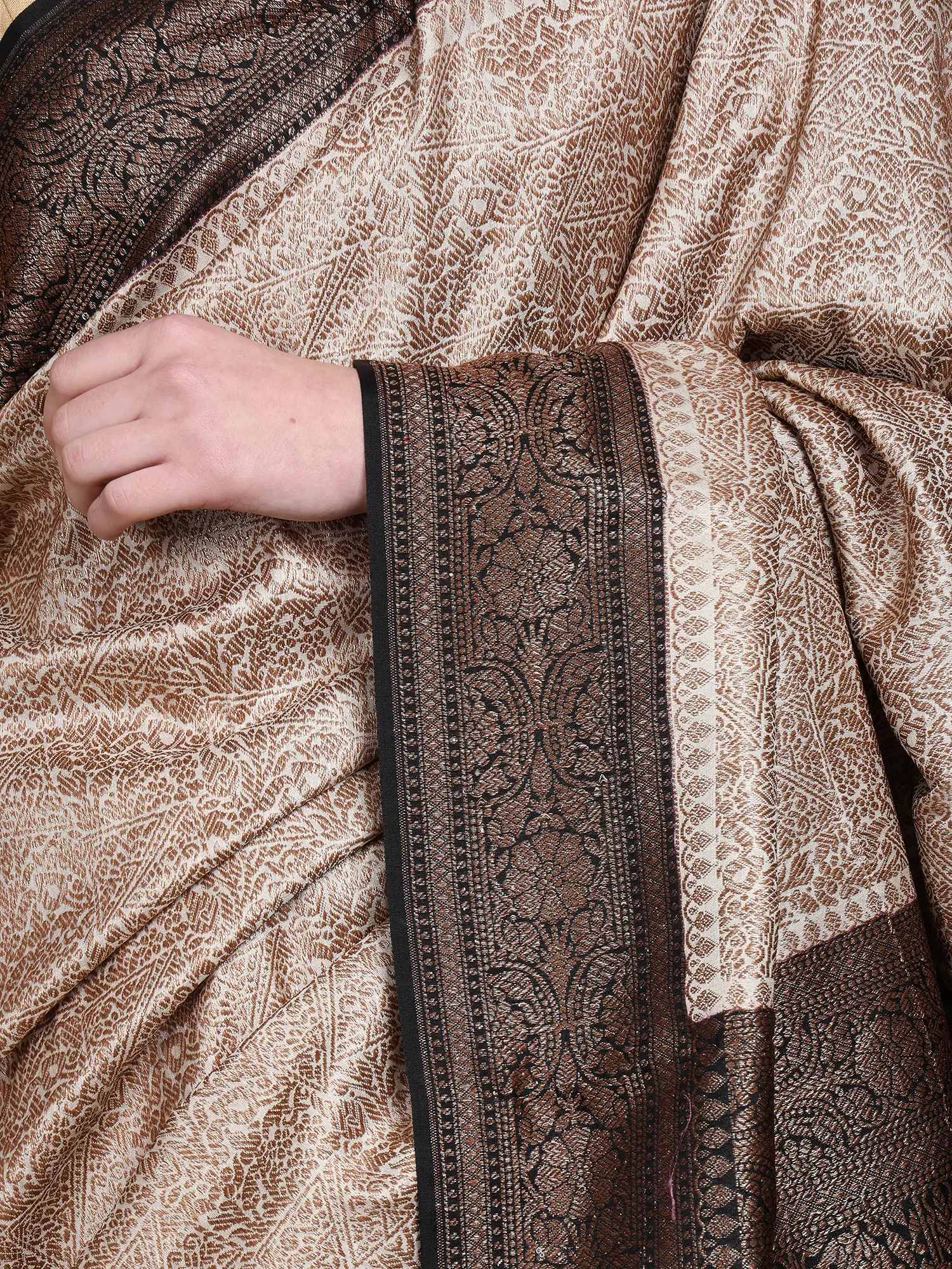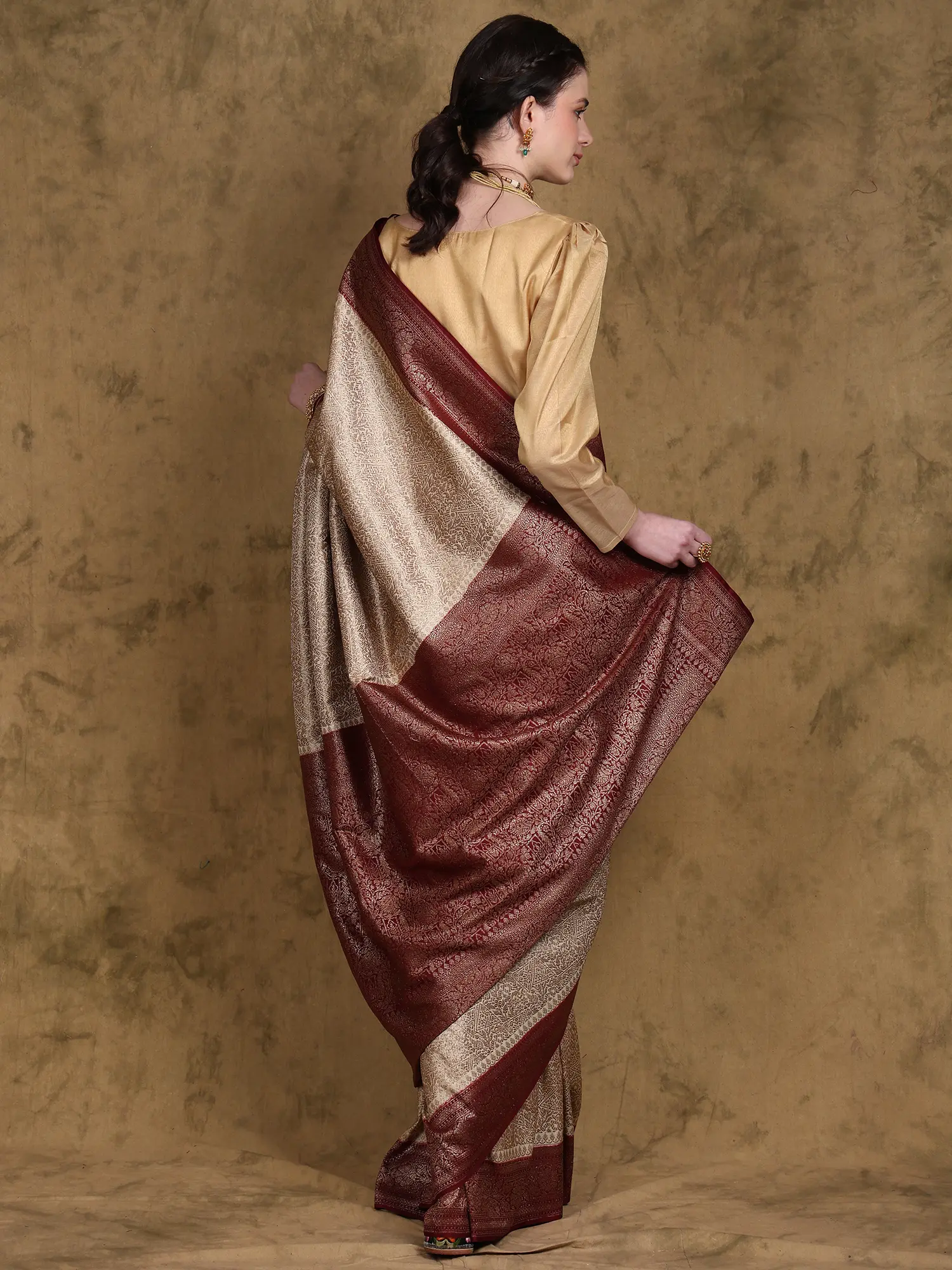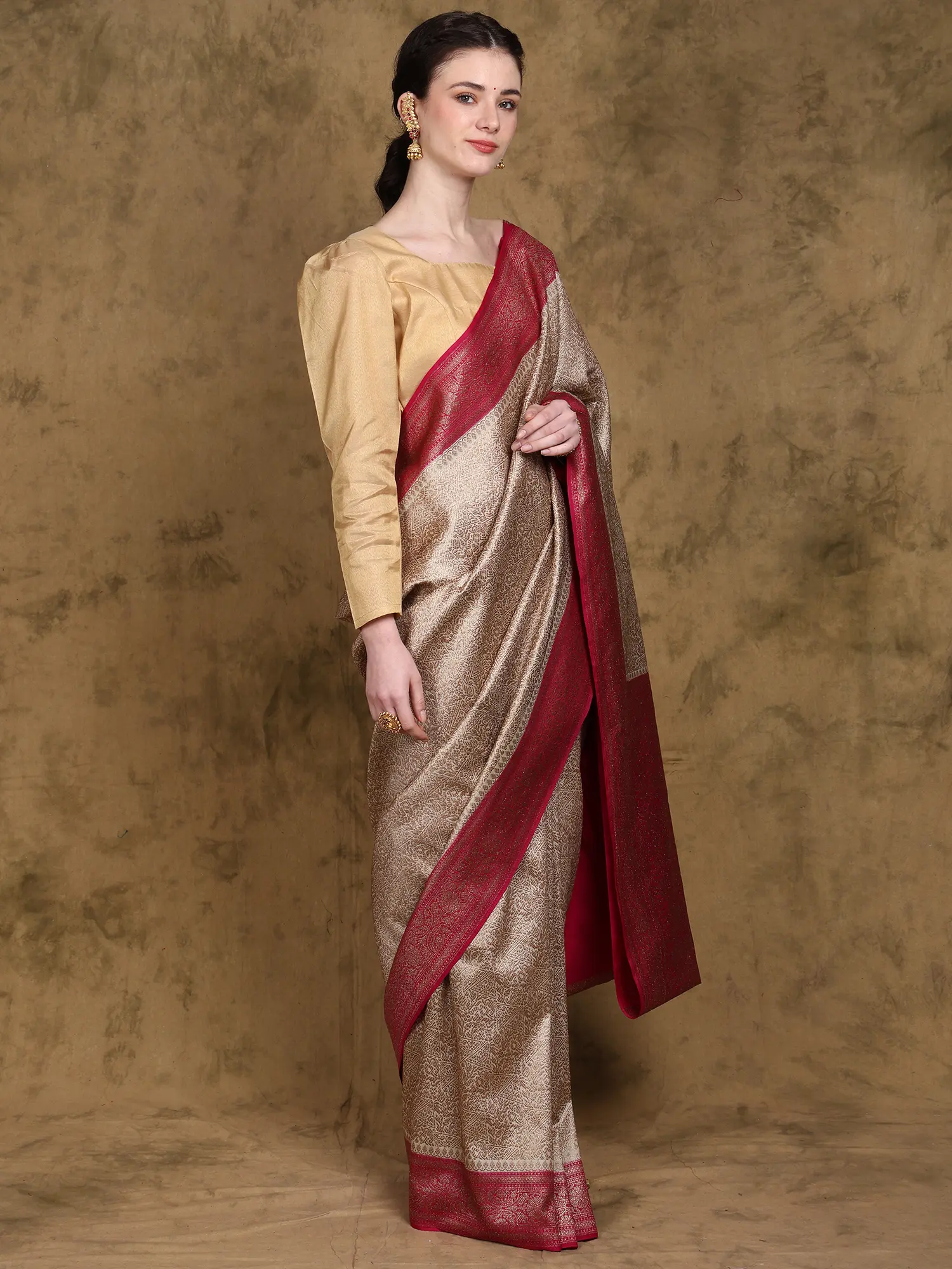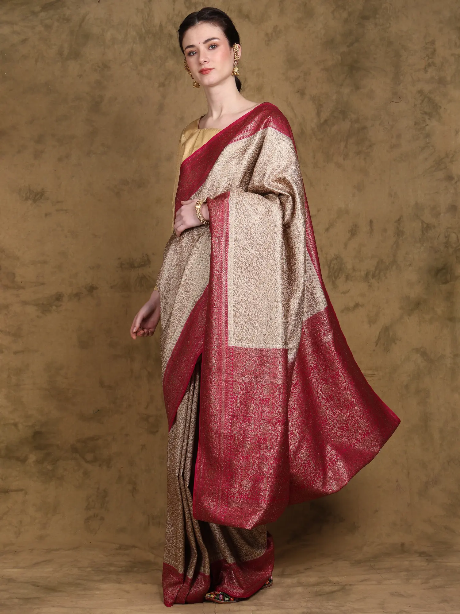 This Banarasi saree seamlessly blends traditional weaving techniques with a contemporary design aesthetic. The classic floral motifs are rendered in a fresh and modern way, appealing to both traditionalists and those seeking a more contemporary style. The combination of the elegant beige and striking red is eternally chic, ensuring this saree will remain stylish for years to come. Whether you pair it with traditional gold jewelry or more modern accessories, this saree is incredibly versatile and can be adapted to suit your personal style.