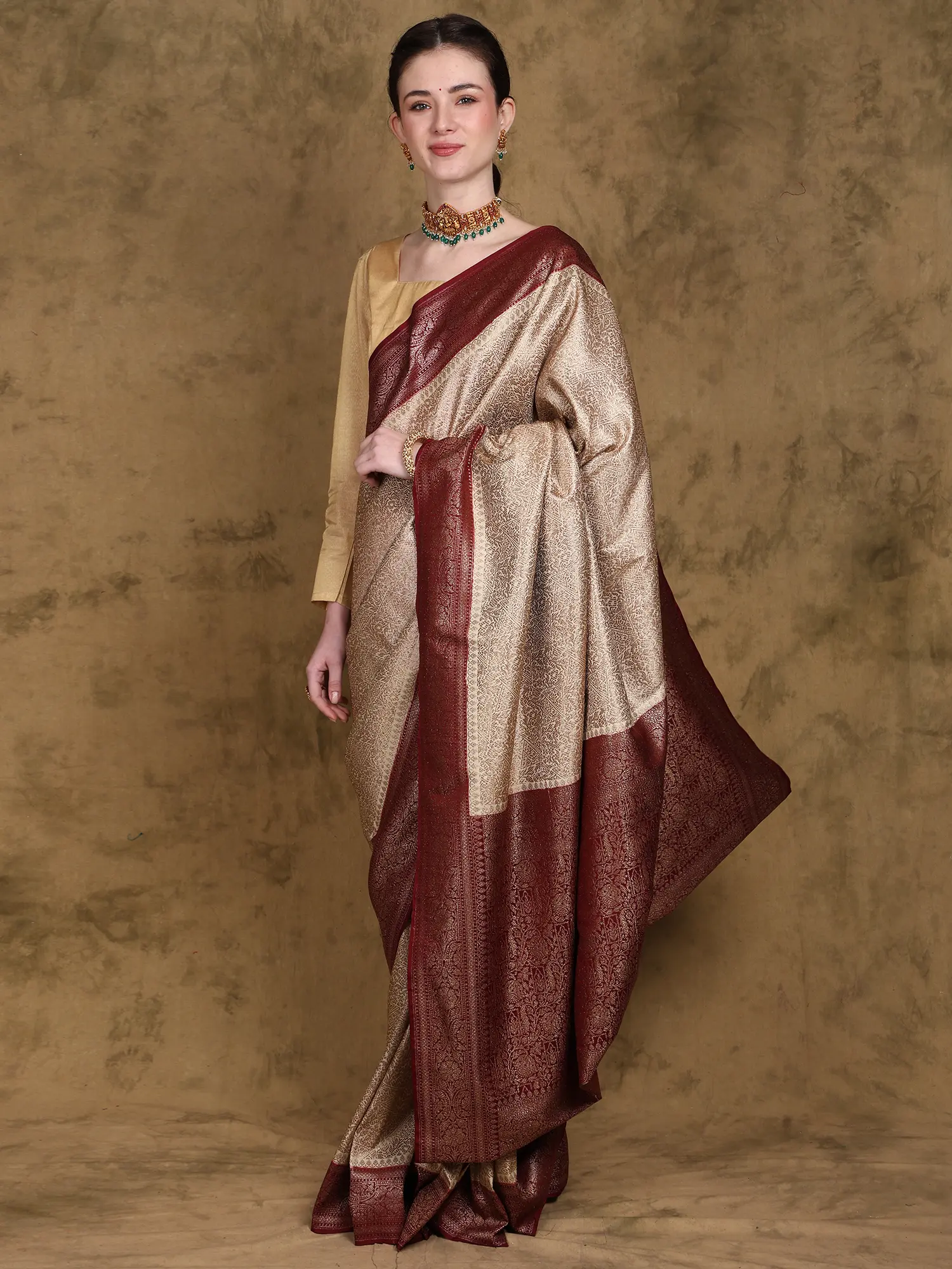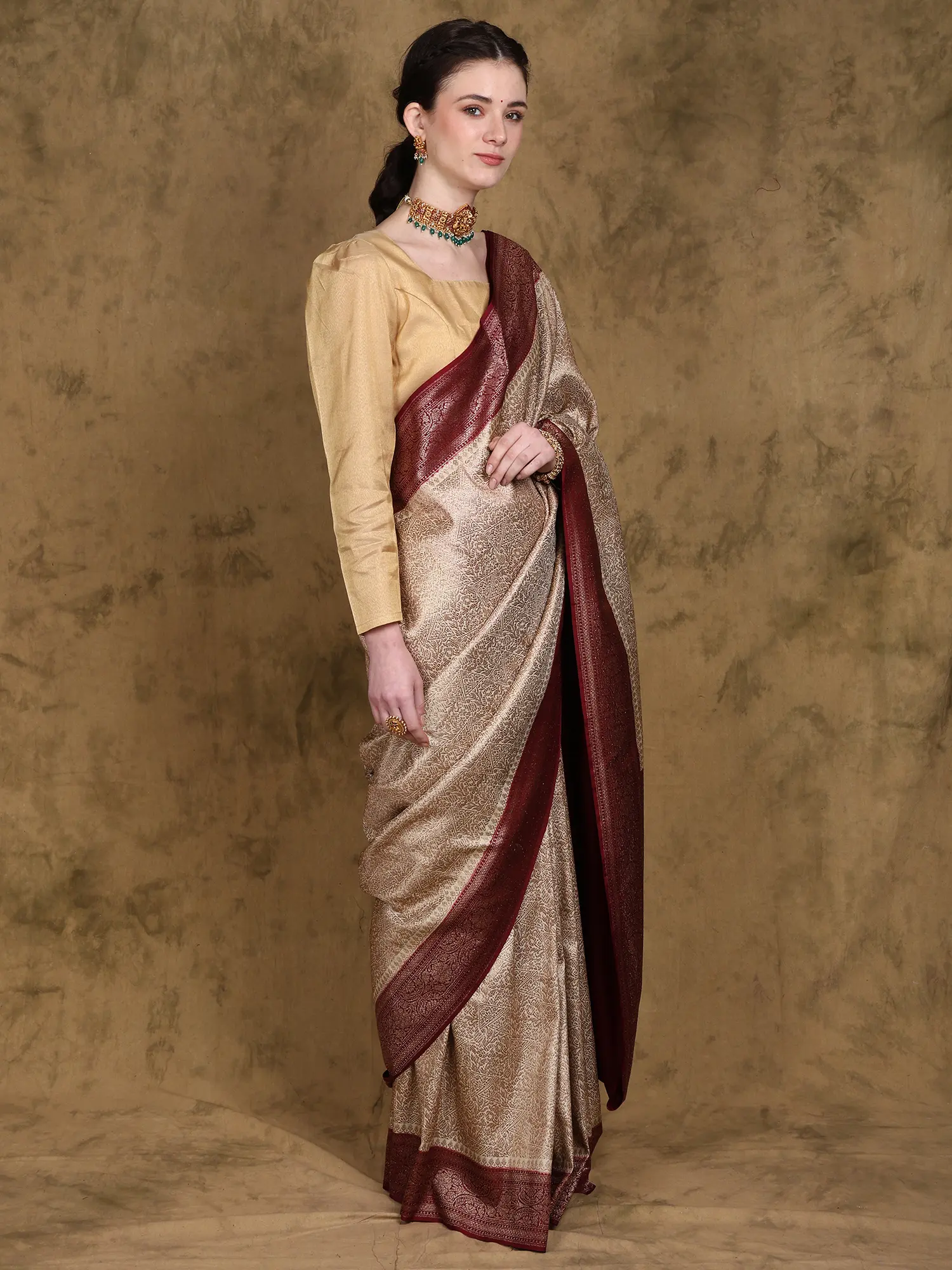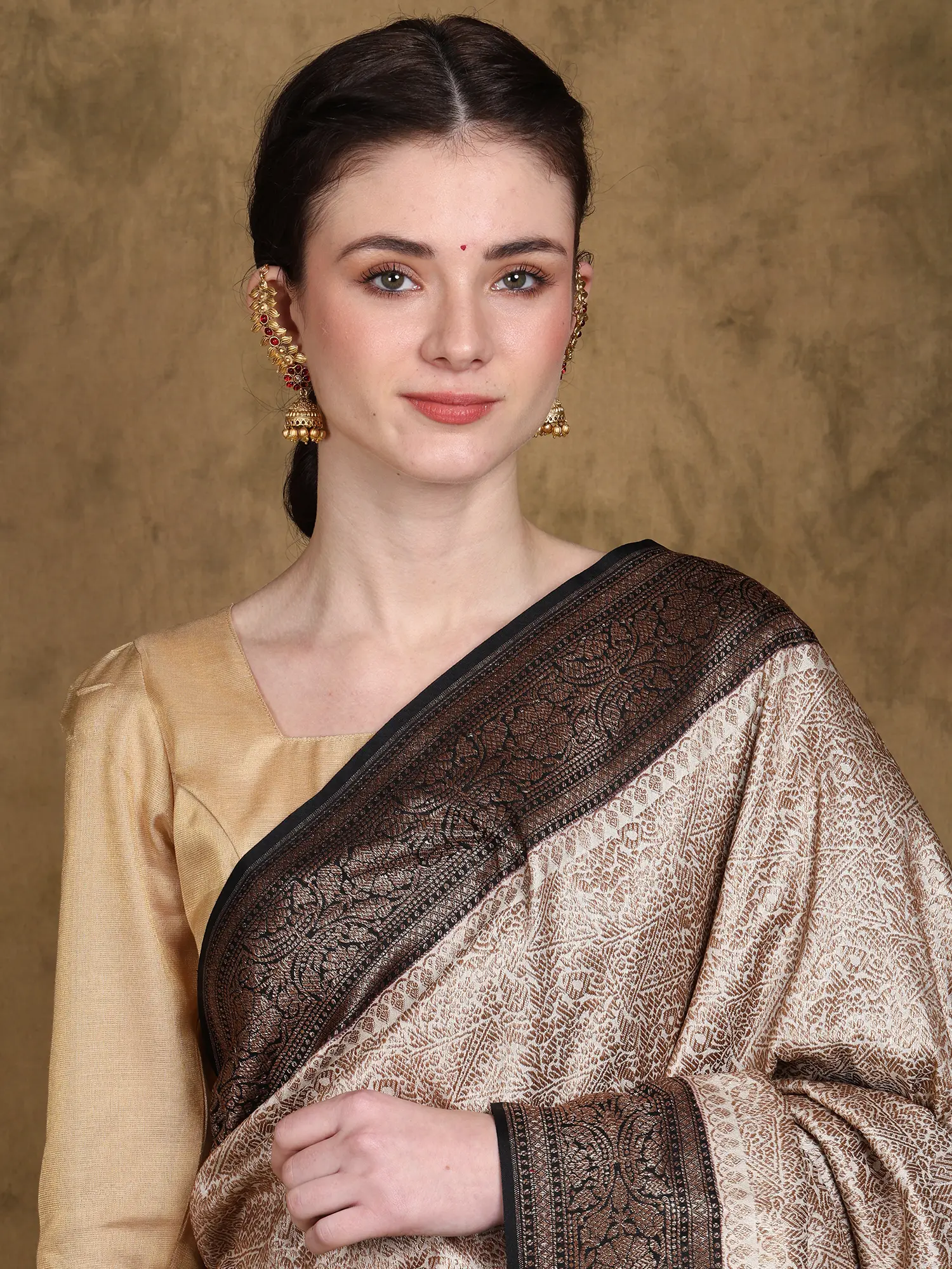 Cloud-Cream Handloom Pure Silk Banarasi Sari with Kadhwa Woven Flowers All-over