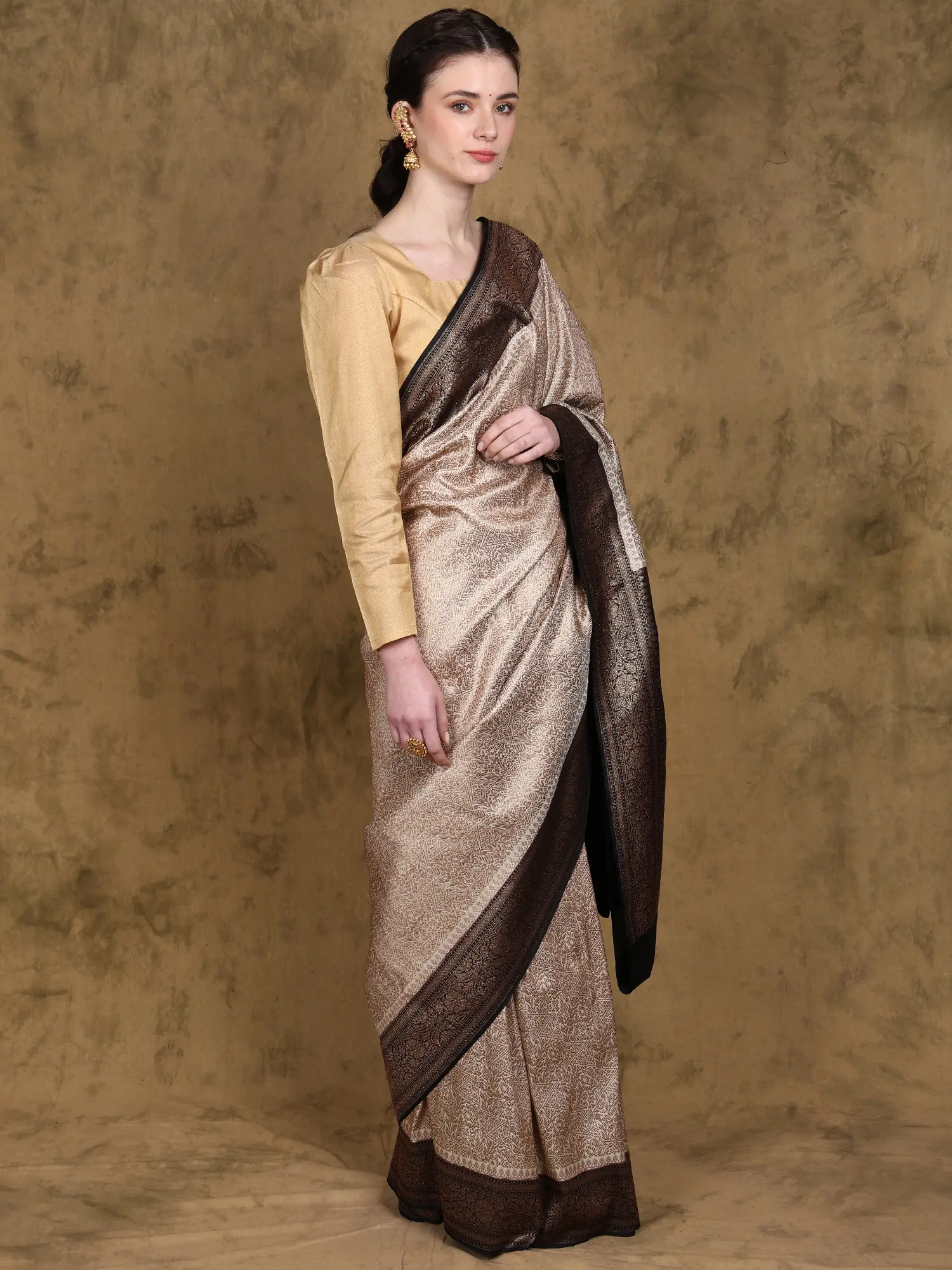 Banarasi Saree with All-over Zari Woven Bootis and Floral Vine Contrast Border-Pallu