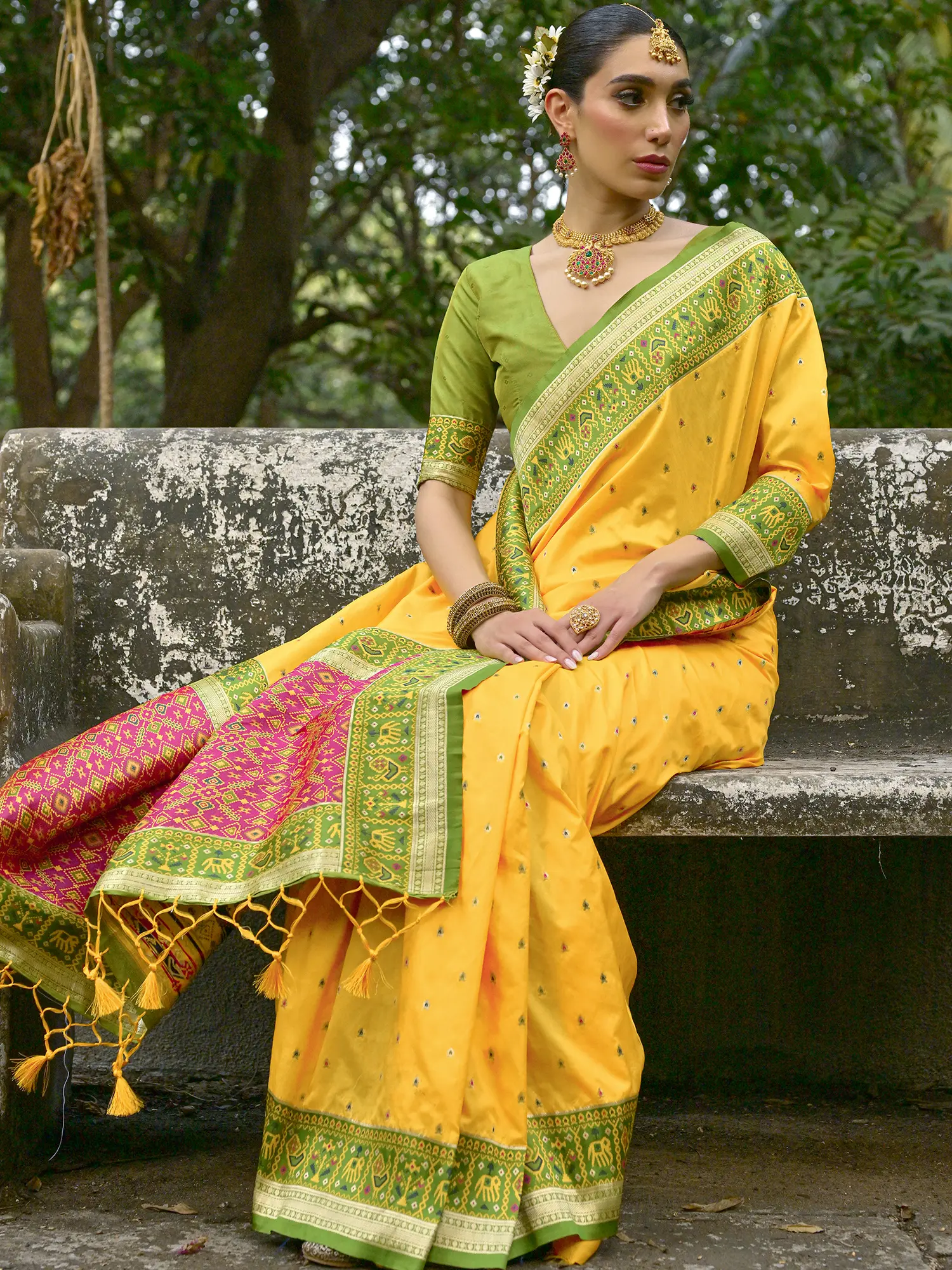 Flower Pattern Banarasi Silk Saree with Blouse and Tassels Pallu