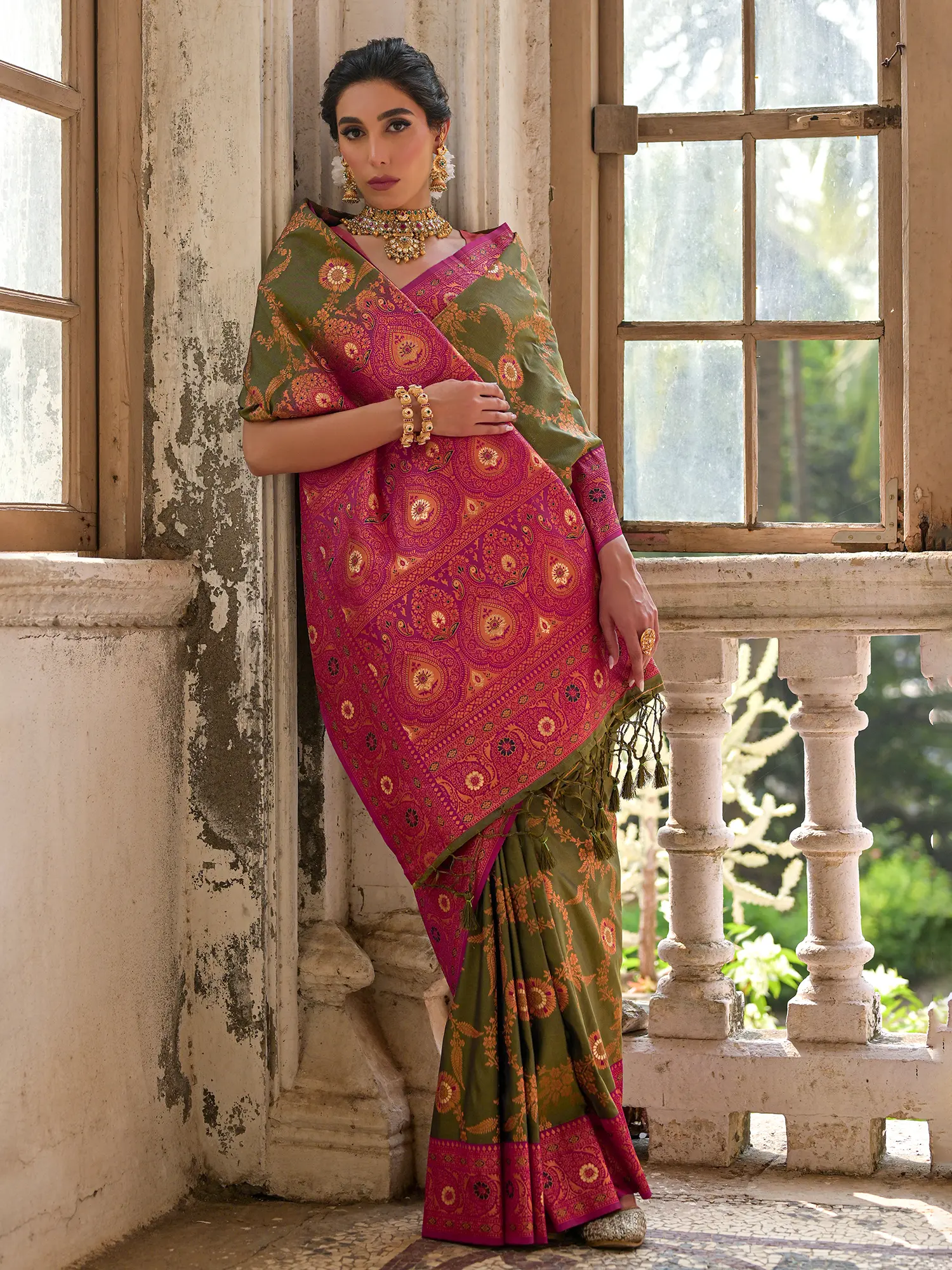 Banarasi Saree with All-over Zari Woven Bootis and Floral Vine Contrast Border-Pallu