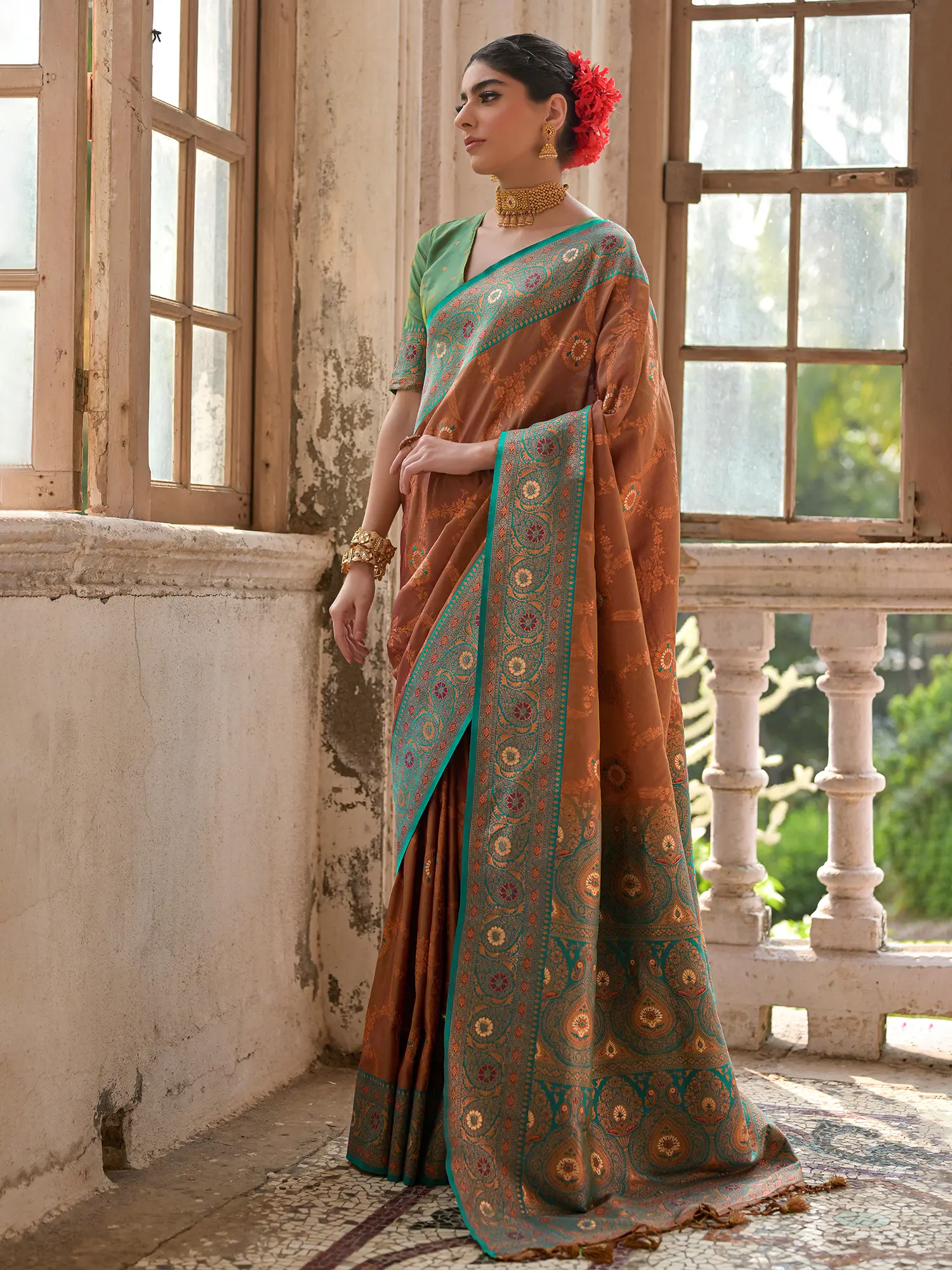 Banarasi Silk Flower Printed And Zari Woven Work Saree With Contrast Tassels Pallu