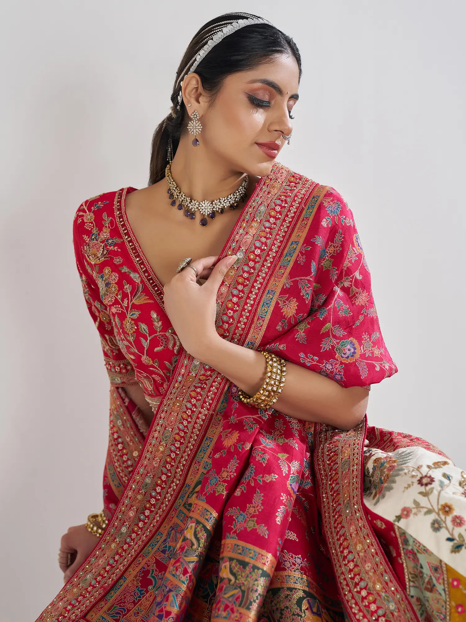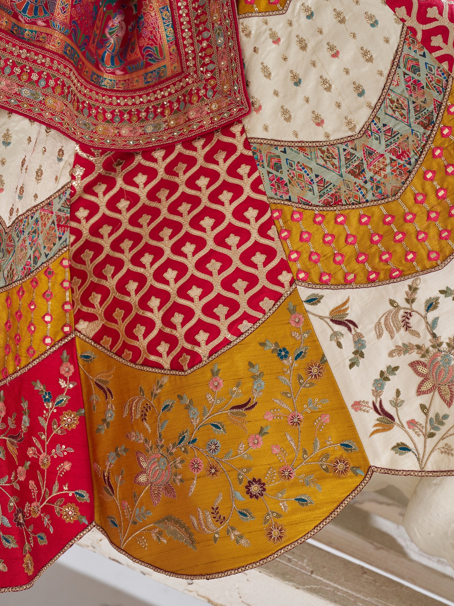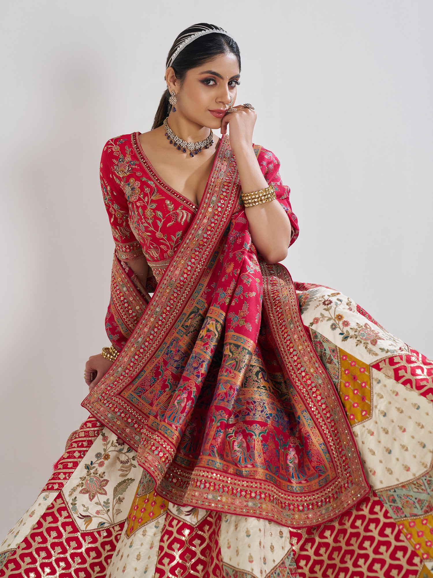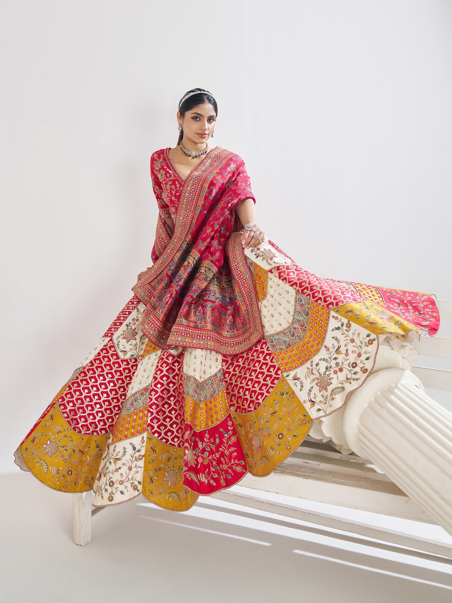 The lehenga and choli are crafted from luxurious Banarasi silk, renowned for its opulent texture and subtle sheen. This premium fabric drapes beautifully, accentuating your silhouette with an elegant flow. The natural breathability of silk ensures comfort, allowing you to enjoy long hours of festivities without feeling restricted. Every thread speaks of skilled artisans who have dedicated generations to perfecting this craft.