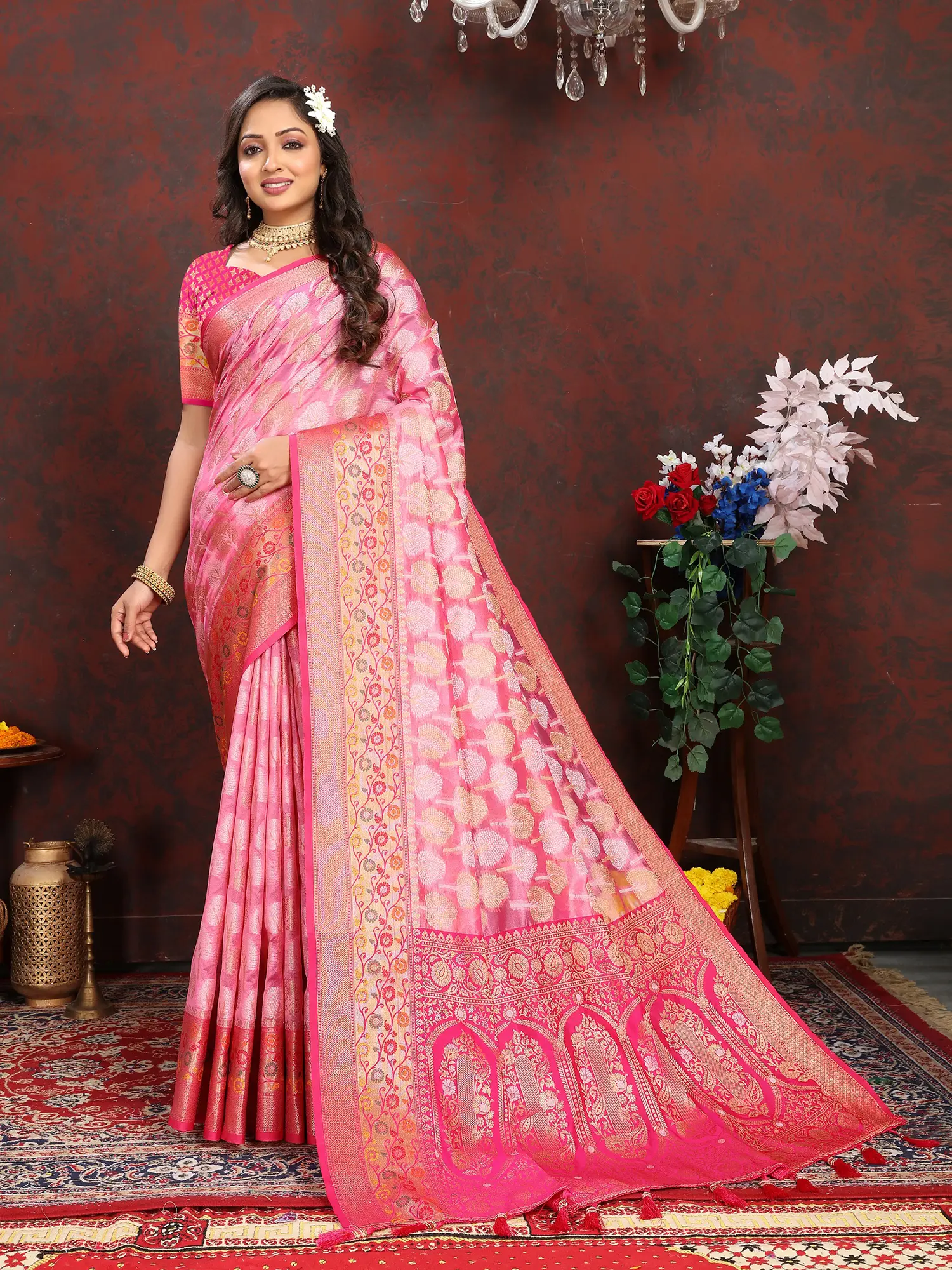 Drape yourself in the exquisite charm of this Banarasi silk saree, a testament to India's rich weaving heritage. Crafted from the finest silk, this saree promises a luxurious feel and a graceful drape, making it an ideal choice for any celebratory occasion. The soft pink hue is both elegant and vibrant, exuding a sense of joyous festivity.