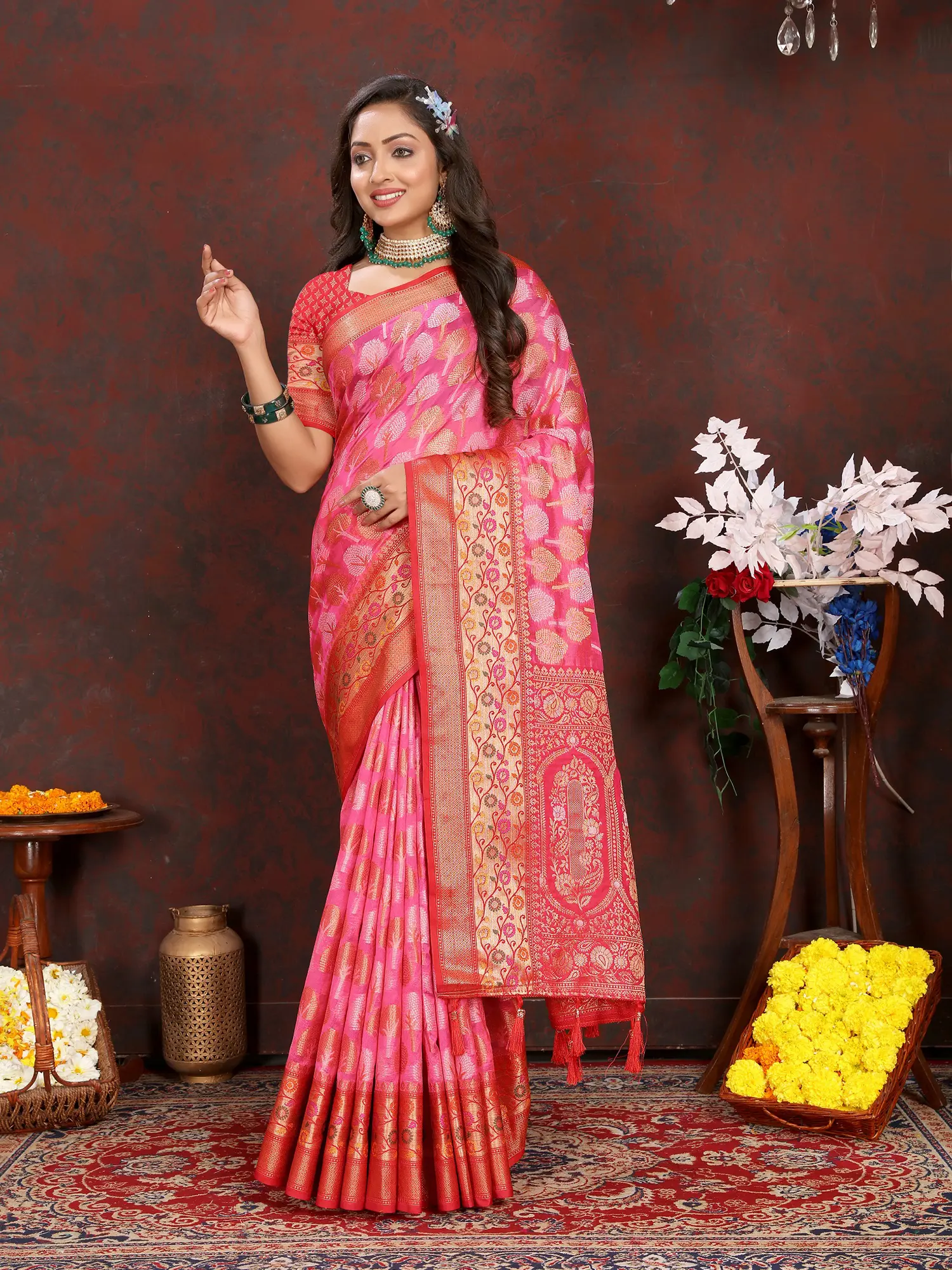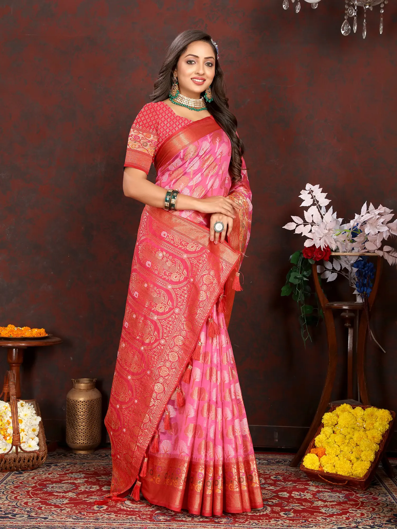 Woven Floral Motifs Attractive Silk Saree With Lotus Flower Tassels Pallu