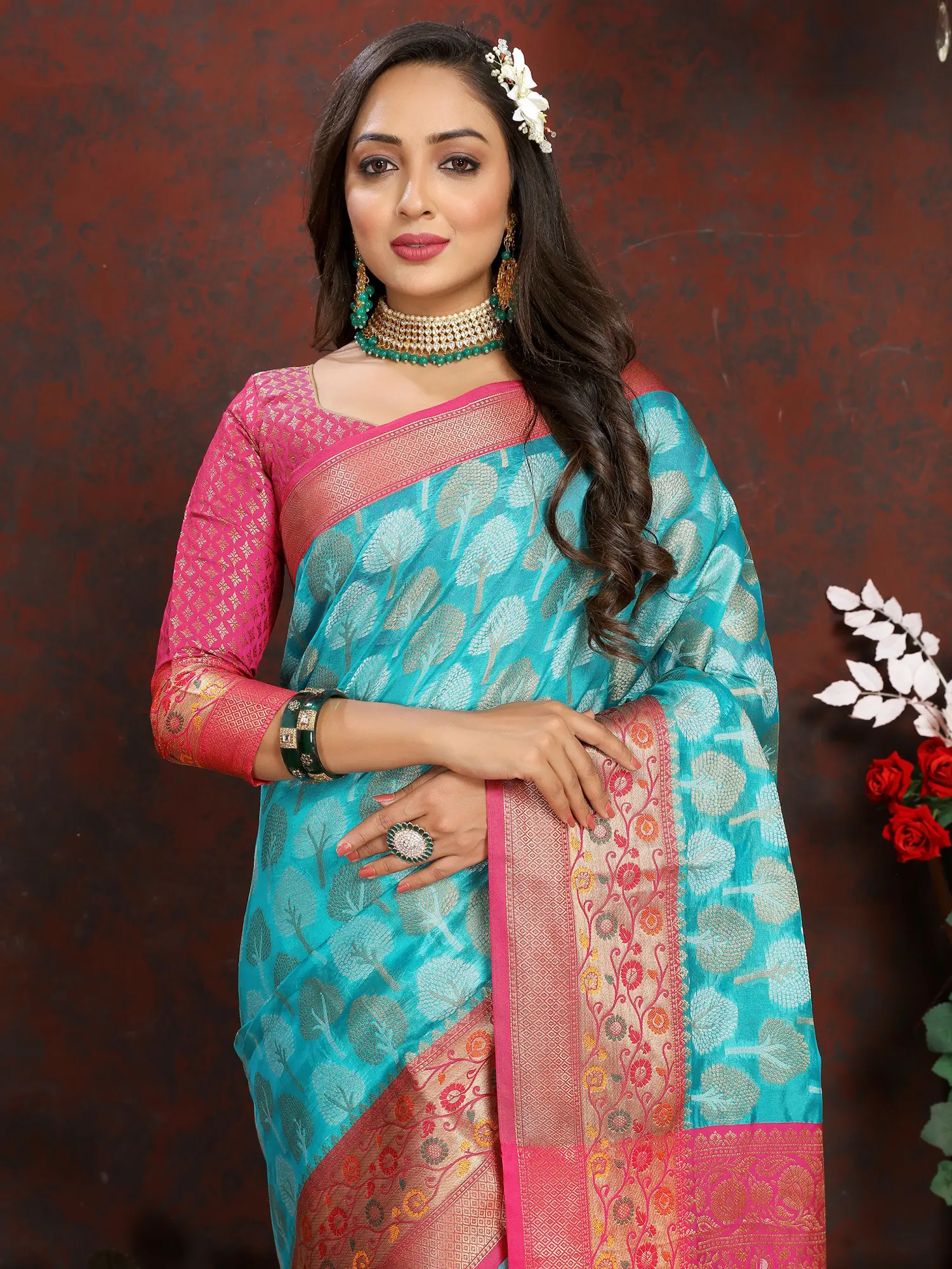 The body of the saree is adorned with delicate and mesmerizing tree motifs, intricately woven into the silk. These detailed patterns evoke a sense of natural beauty and timeless elegance. Complementing the graceful motifs is an attractive, wide border that runs along the length of the saree. This substantial border is richly embellished, adding a regal touch and ensuring the saree makes a striking statement. The interplay of the motifs and the grand border creates a visually captivating piece that is both traditional and undeniably glamorous.