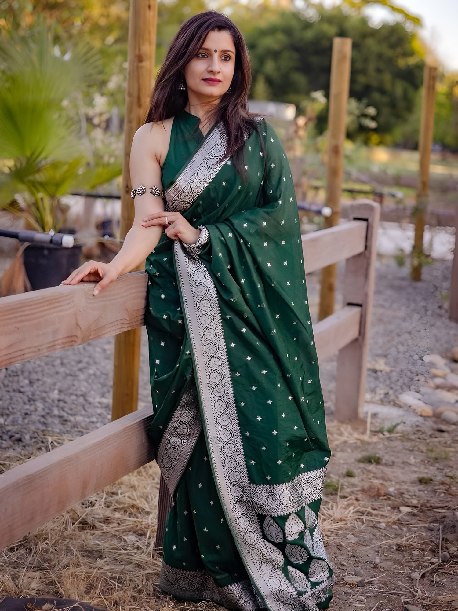 Banarasi Saree with All-over Zari Woven Bootis and Floral Vine Contrast Border-Pallu