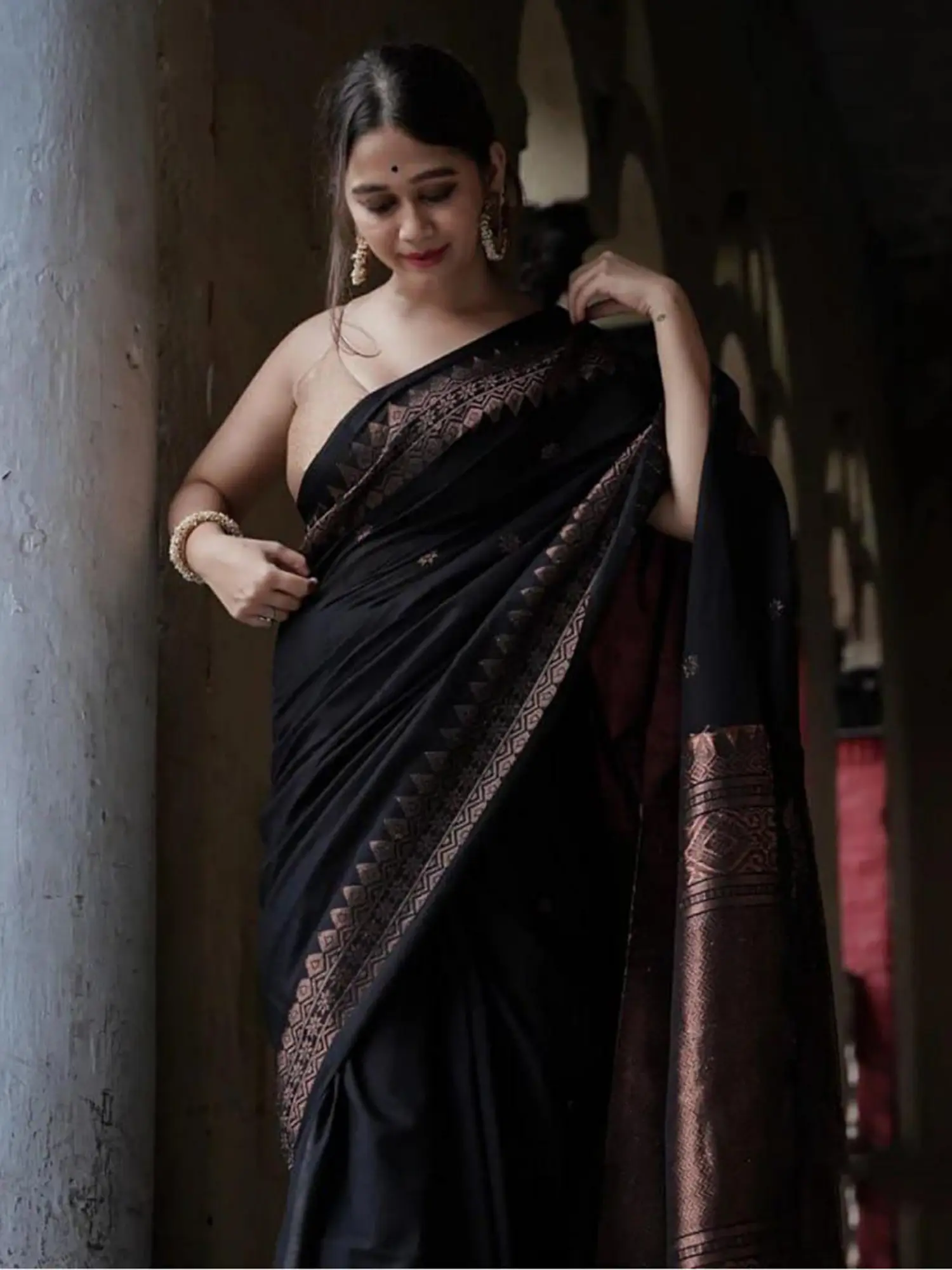 Drape yourself in the epitome of Indian tradition and craftsmanship with this exquisite Banarasi soft lichi silk saree. Crafted from the finest silk, renowned for its lustrous sheen and incredibly soft texture, this saree promises unparalleled comfort and a graceful fall that will make heads turn. The deep, classic black hue serves as a perfect canvas for the intricate detailing, exuding an aura of sophisticated allure.