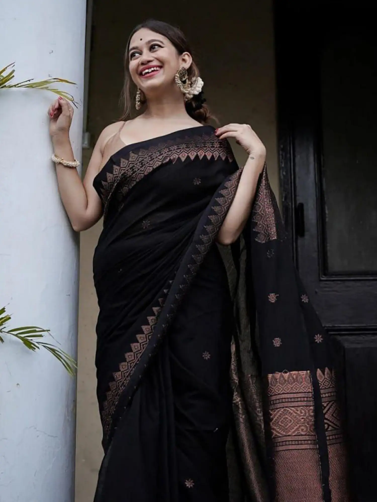 The true artistry of this Banarasi creation lies in its richly woven pallu and meticulously detailed jacquard weaving. The pallu, the most prominent part of the saree, is adorned with elaborate motifs that speak volumes of the weaver's skill and dedication. These designs are not merely printed but are intricately woven into the fabric, creating a stunning three-dimensional effect. The delicate jacquard patterns extend across the body of the saree, adding subtle yet captivating texture and visual interest. These patterns often feature traditional Indian motifs, such as paisleys, floral designs, and geometric shapes, all rendered with remarkable precision. The interplay of the black silk with the complementary bronzed thread creates a striking contrast that is both opulent and understated.