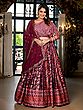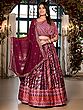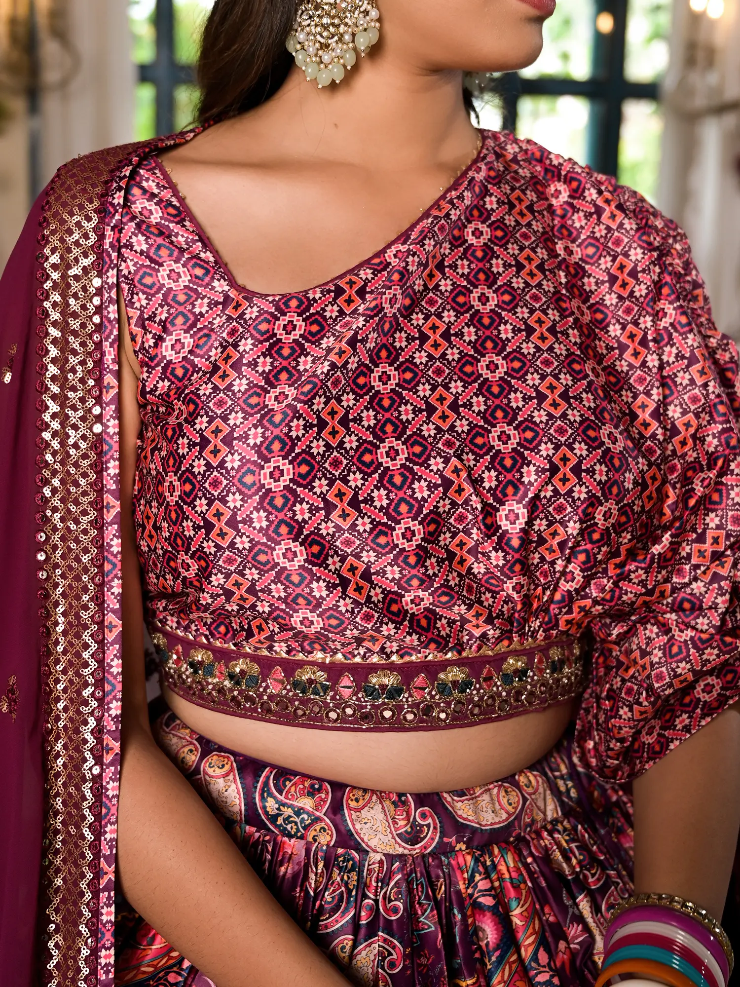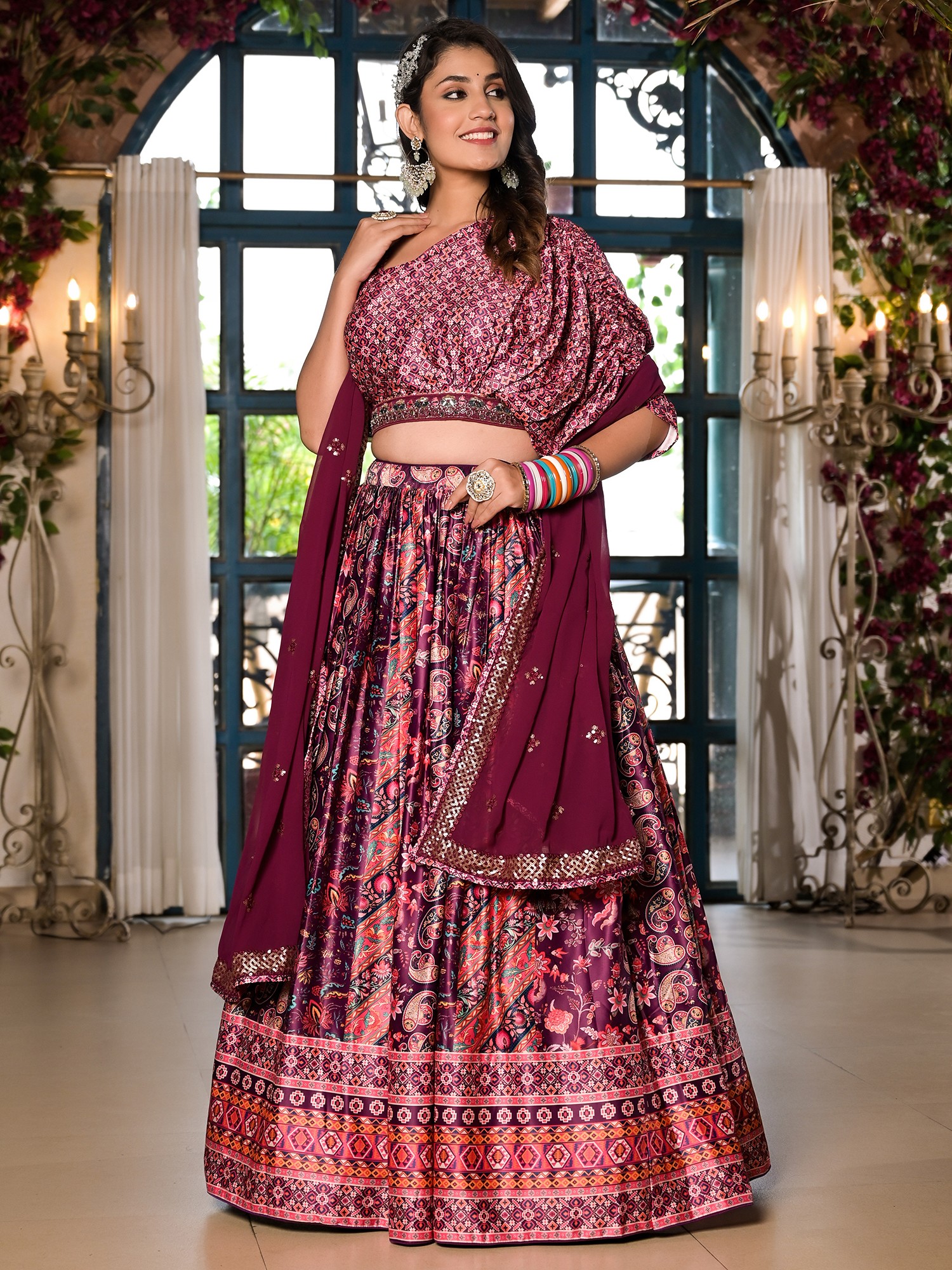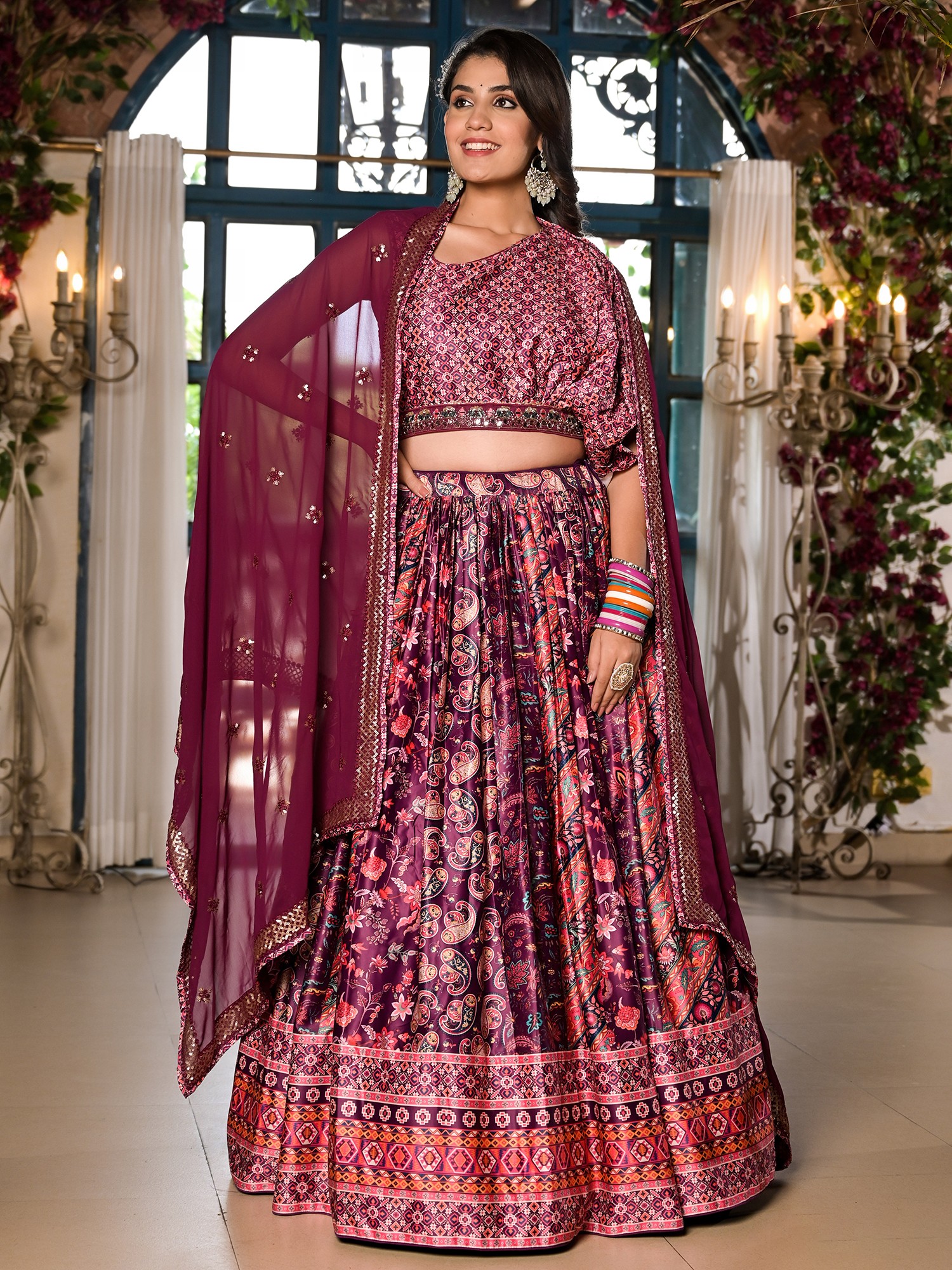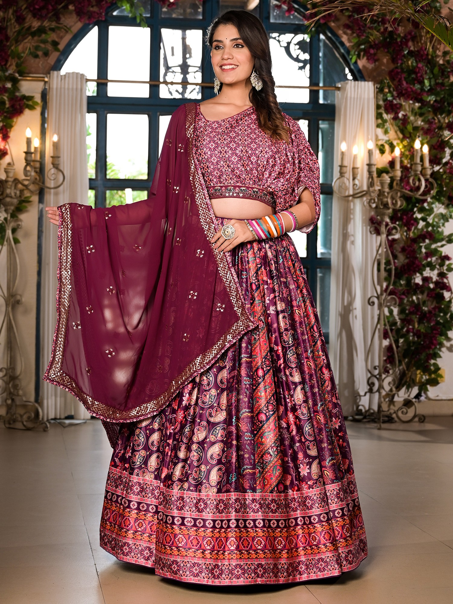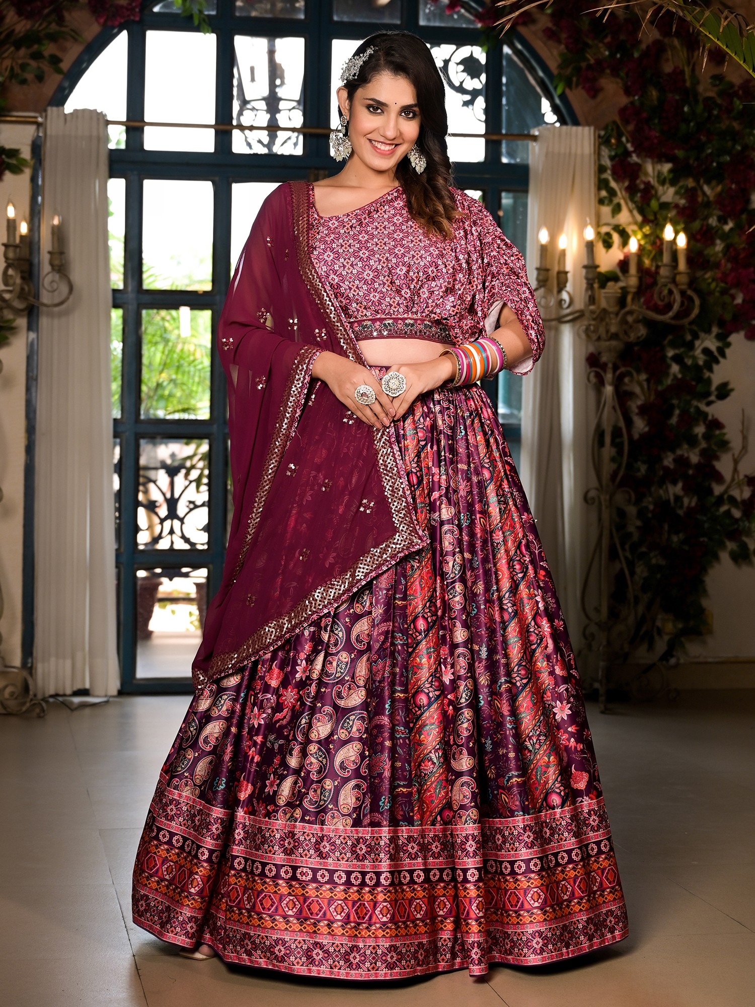 Step into the spotlight with this stunning lehenga choli, a true masterpiece of traditional design infused with contemporary flair. The rich, deep color palette immediately captures the eye, creating a sense of regal elegance that is perfect for special occasions and festive celebrations. The ensemble is designed to make you feel confident and beautiful, ensuring you leave a lasting impression. The luxurious fabric drapes beautifully, creating a flattering silhouette. The intricate print, featuring a delightful combination of classic motifs, adds depth and visual interest to the overall design. This is a piece that will be treasured for years to come, a testament to timeless style and exquisite craftsmanship. Whether you're attending a wedding, a party, or any other grand event, this lehenga choli is guaranteed to make you the center of attention.