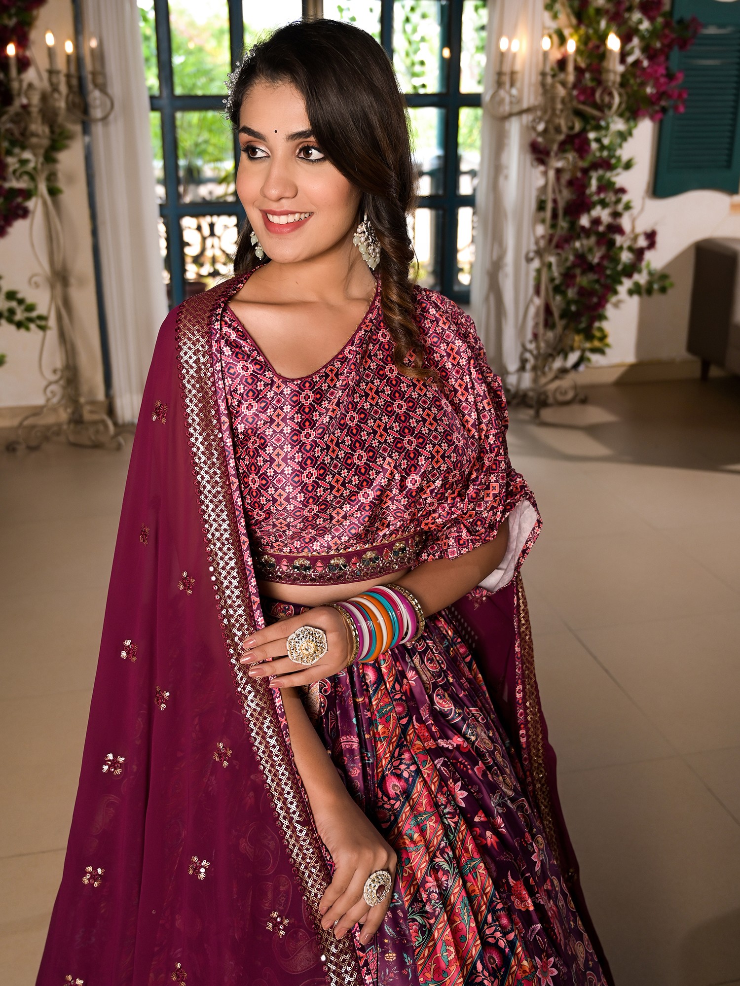 Bandhani And Paisleys Motifs Printed Satin Elegant Lehenga Choli With Attractive Sequins Work Dupatta