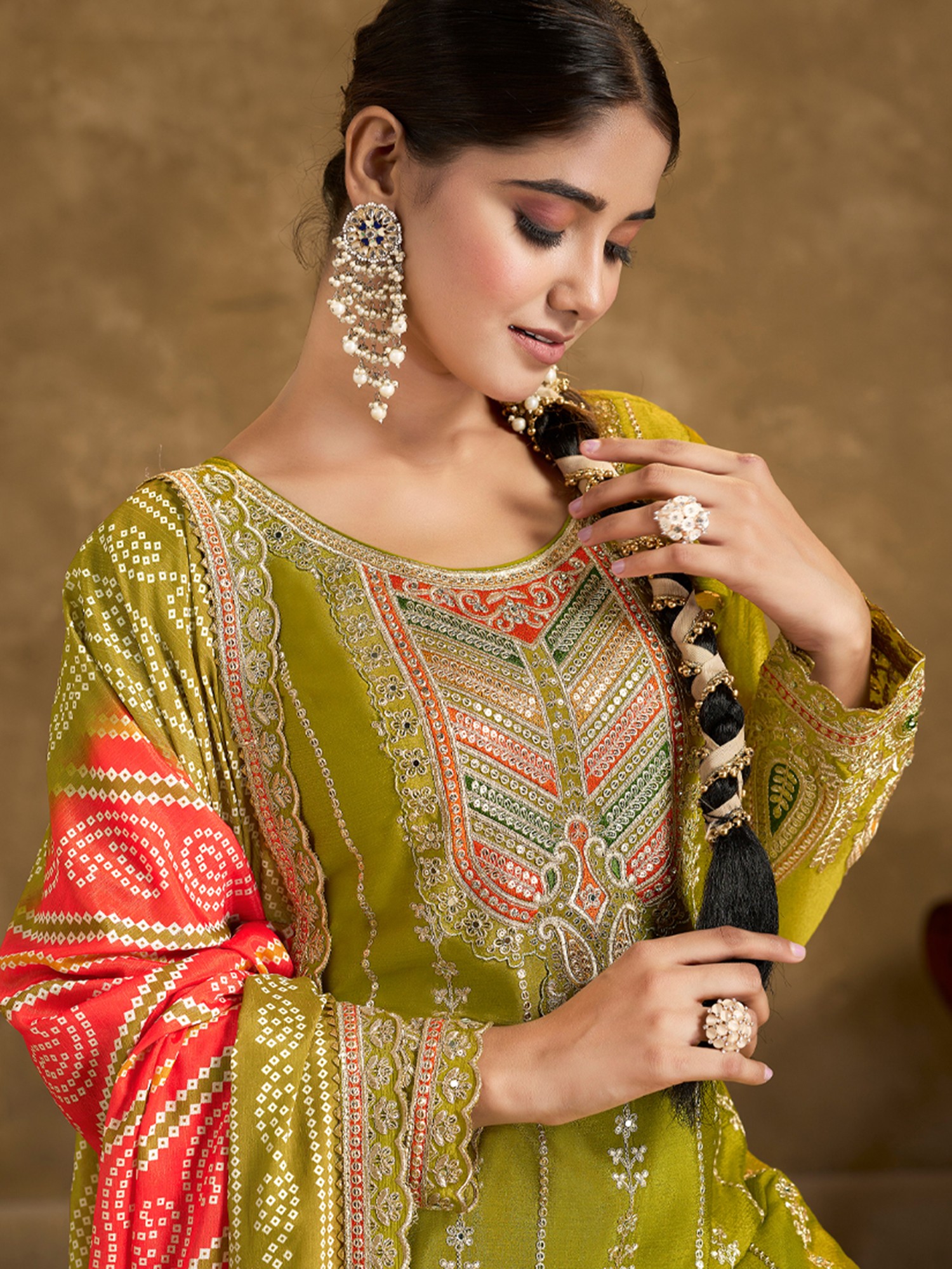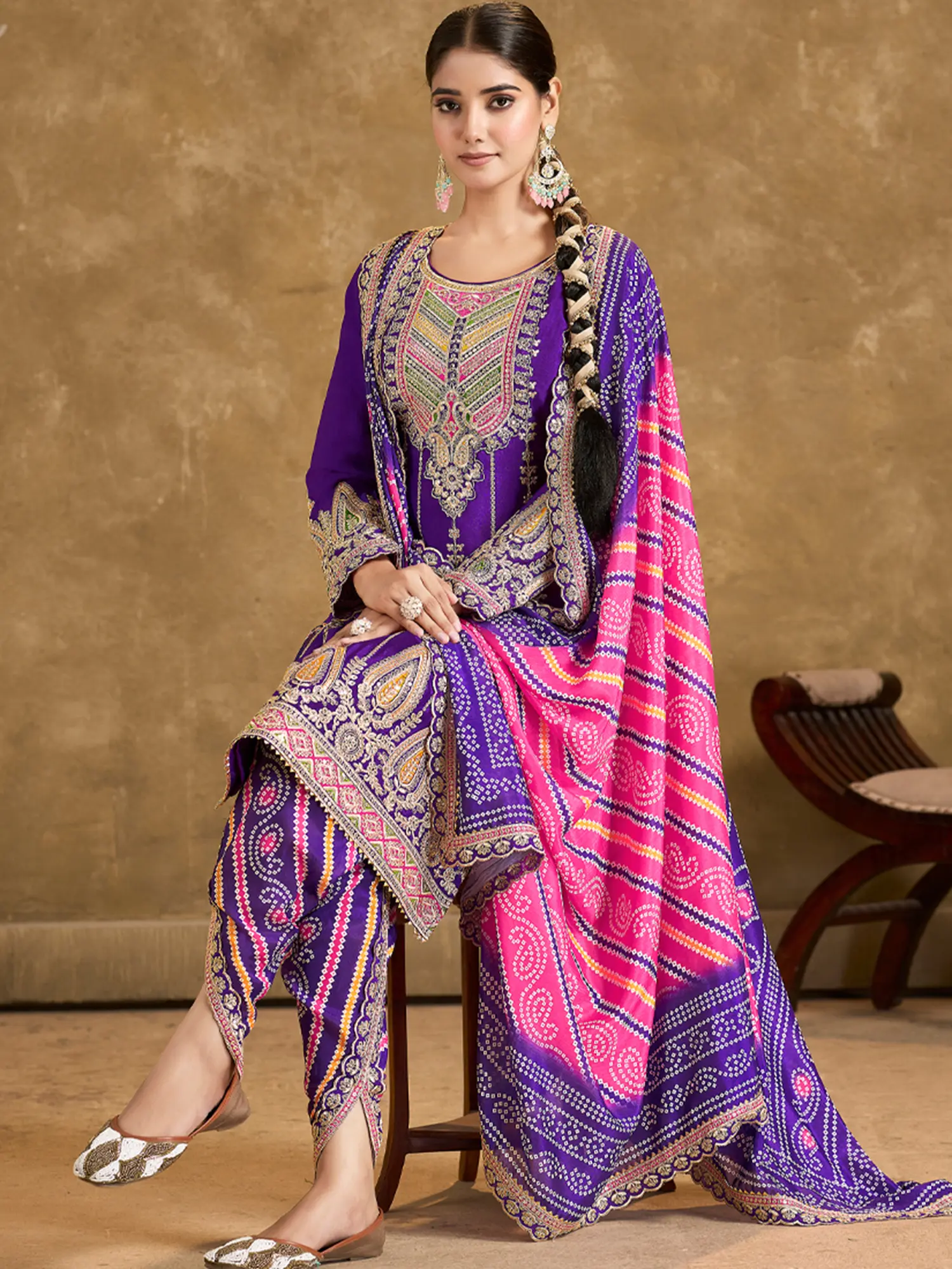 The Bandhani technique, with its roots stretching back centuries, is a celebration of cultural artistry and tradition. This method of dyeing, involving the precise tying of fabric to create intricate patterns, has been passed down through generations. By choosing this ensemble, you embrace a piece of this rich heritage, connecting with an art form that continues to inspire and enchant.
