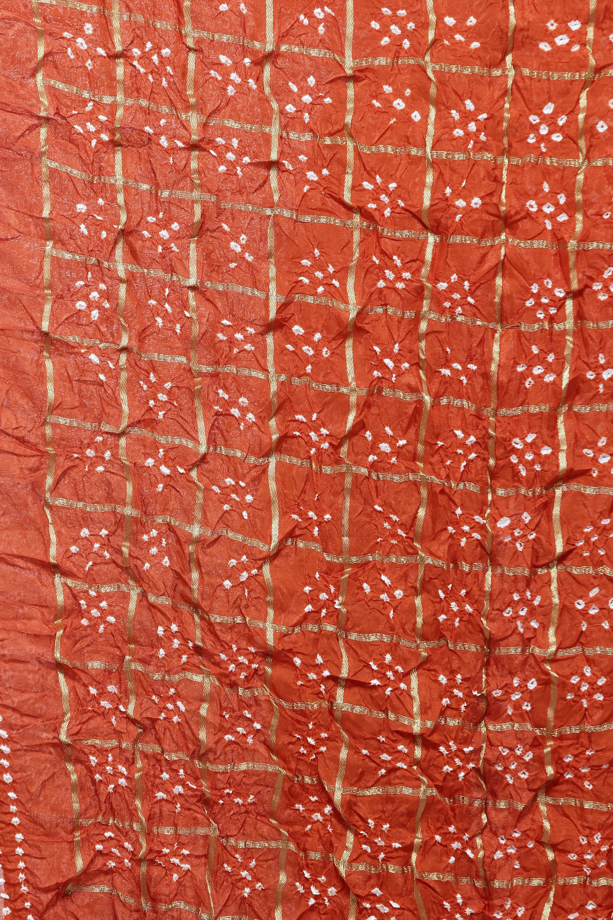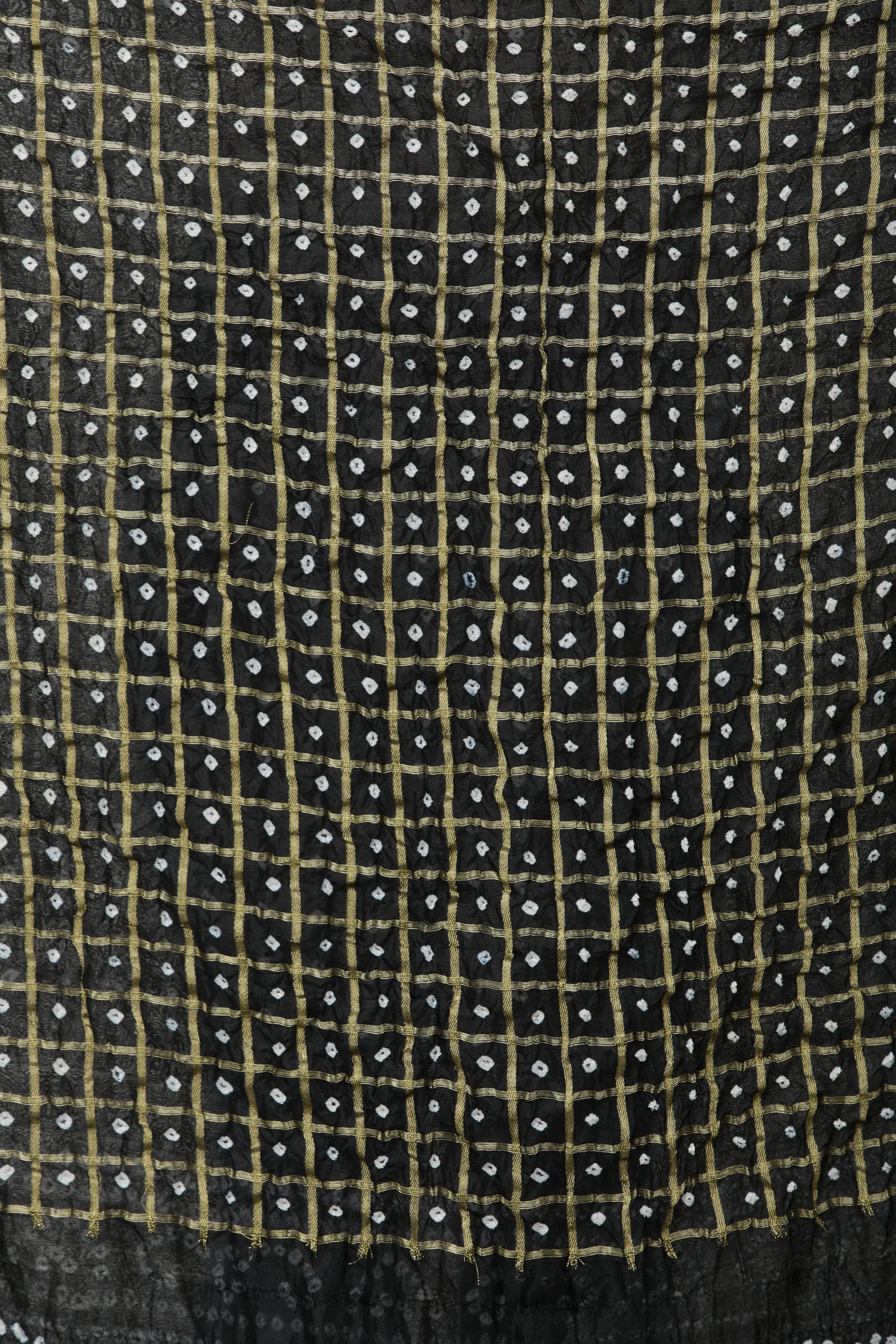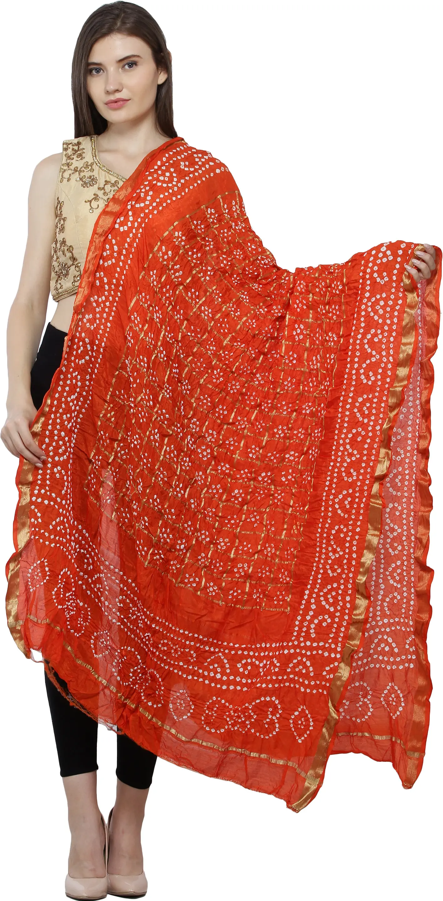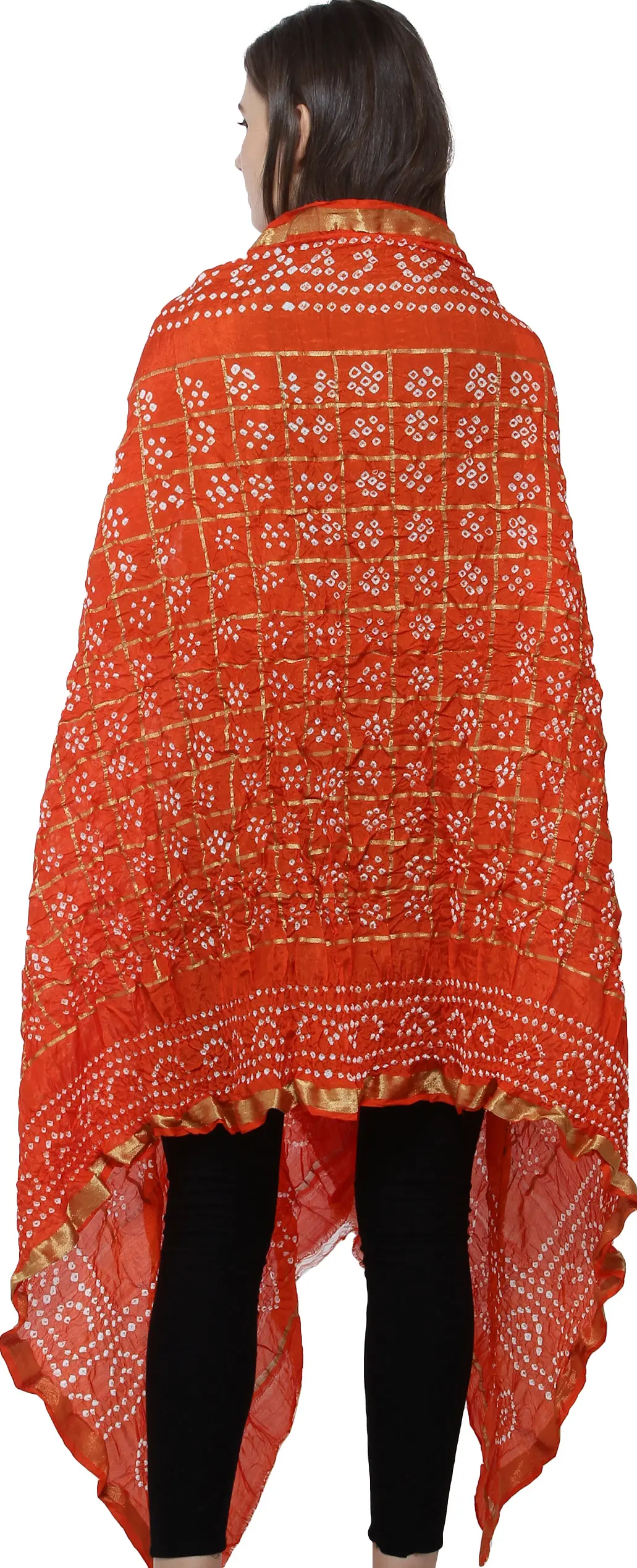 Gharchola- a traditional ladies’ apparel of the Gujarat region in India is a part of women’s wear closely associated with marriage and the welcoming of the bride into her new home. Ghar (home) and Chola (cloth) thus is the garment worn by the lady when she enters her husband’s home. Designed in the traditional style of Gujarat and Rajasthan, with a grid pattern, typical dot pattern of Bandhani, and golden border, this dupatta perfectly captures the beauty of Bandhani. Available colors auspicious and striking, this dupatta can be added to your Indian or Indo-ethnic outfit to instantly add a classic Indian touch to your look.