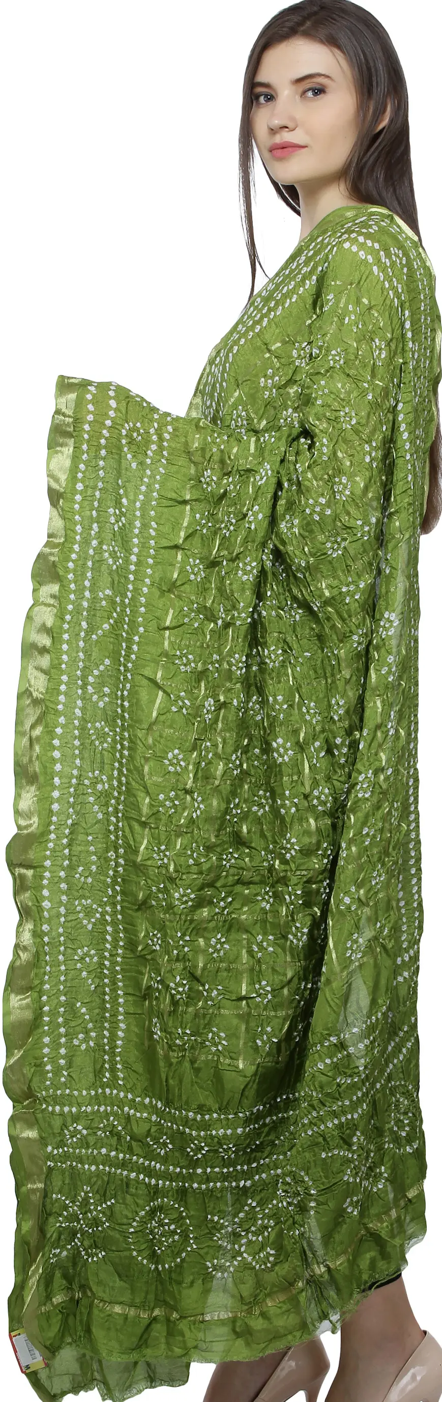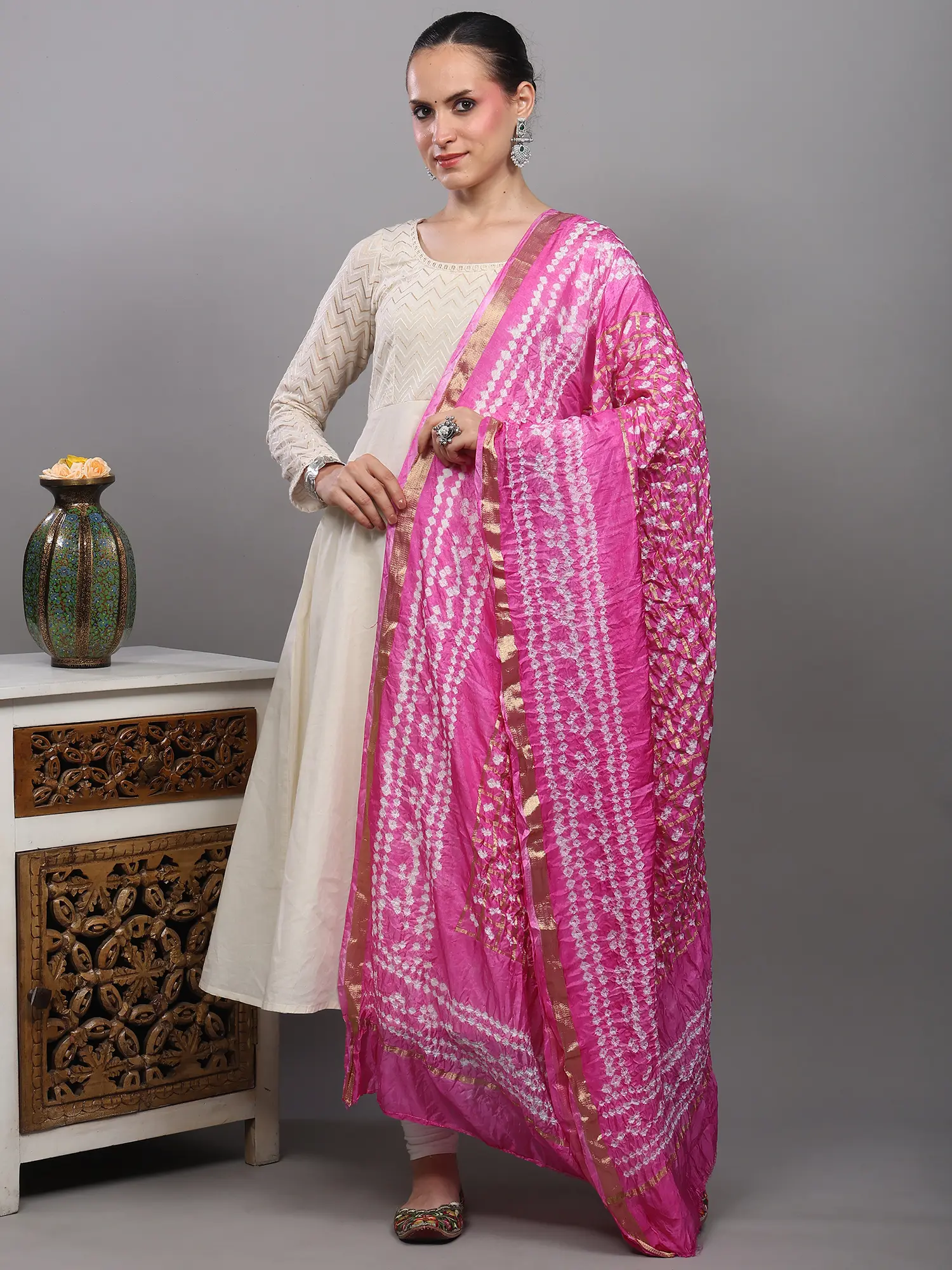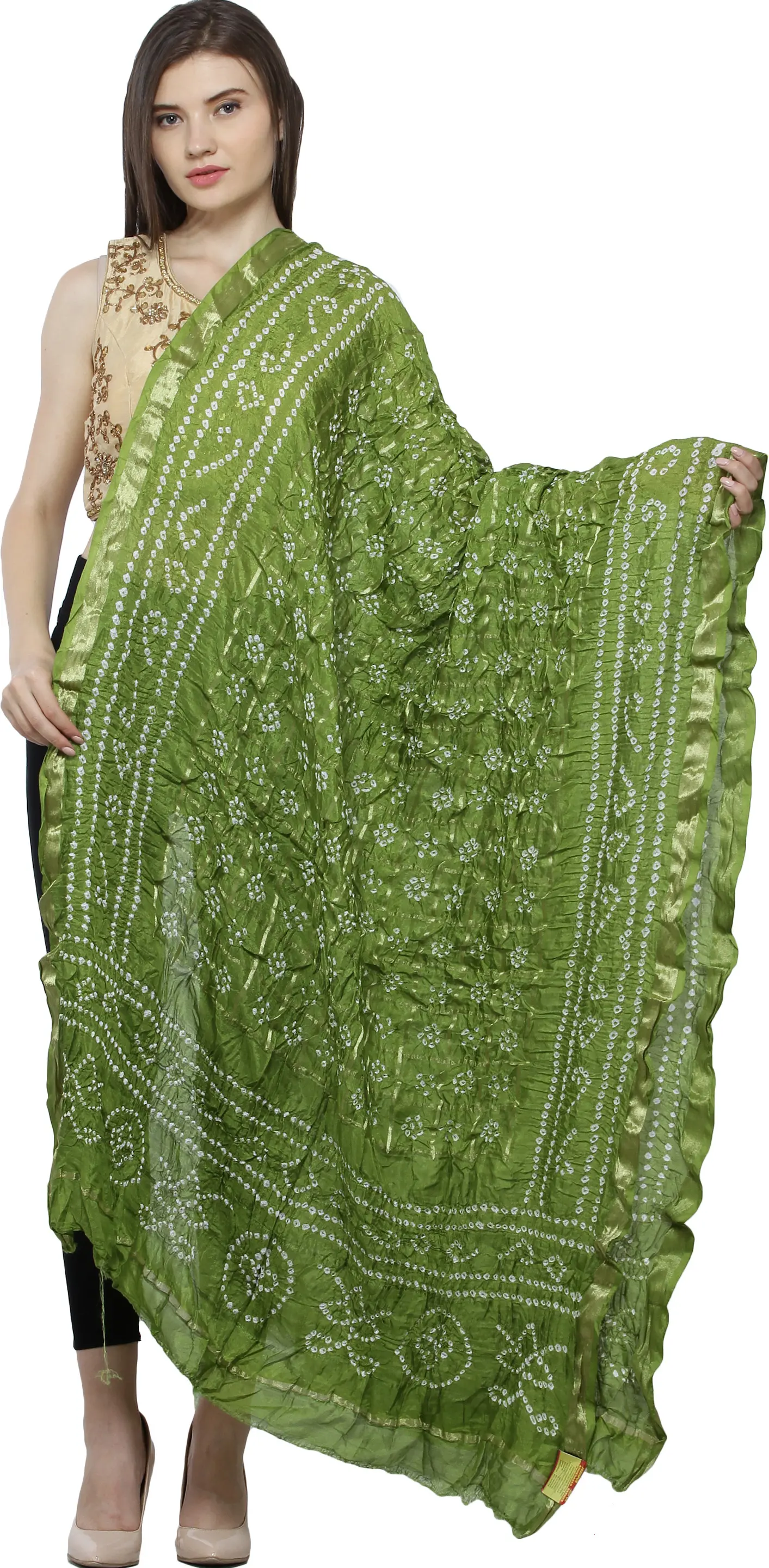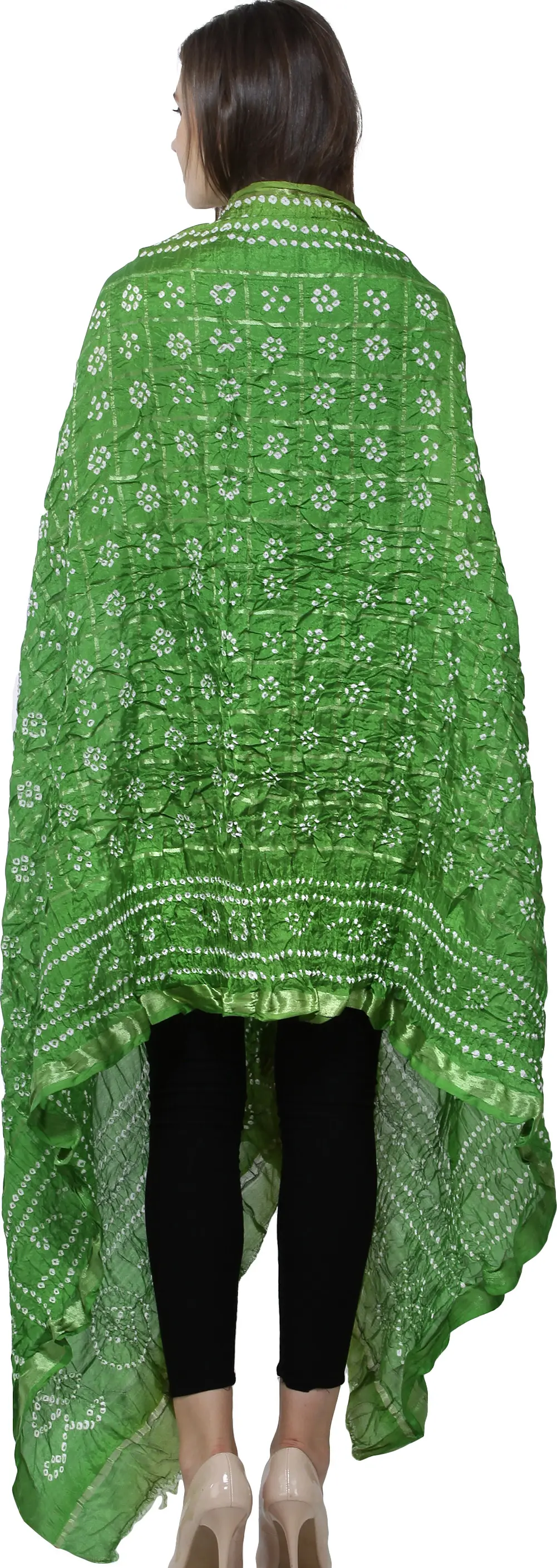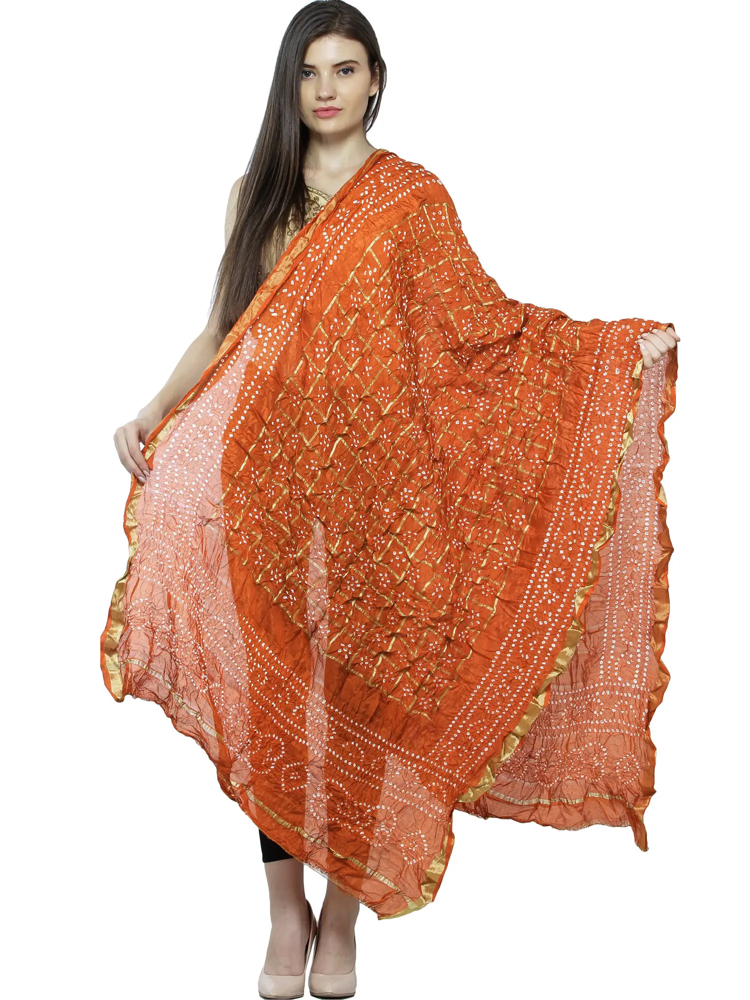 Gharchola- a traditional ladies’ apparel of the Gujarat region in India is a part of women’s wear closely associated with marriage and the welcoming of the bride into her new home. Ghar (home) and Chola (cloth) thus is the garment worn by the lady when she enters her husband’s home. Designed in the traditional style of Gujarat and Rajasthan, with a grid pattern, typical dot pattern of Bandhani, and golden border, this dupatta perfectly captures the beauty of Bandhani. Available colors auspicious and striking, this dupatta can be added to your Indian or Indo-ethnic outfit to instantly add a classic Indian touch to your look.