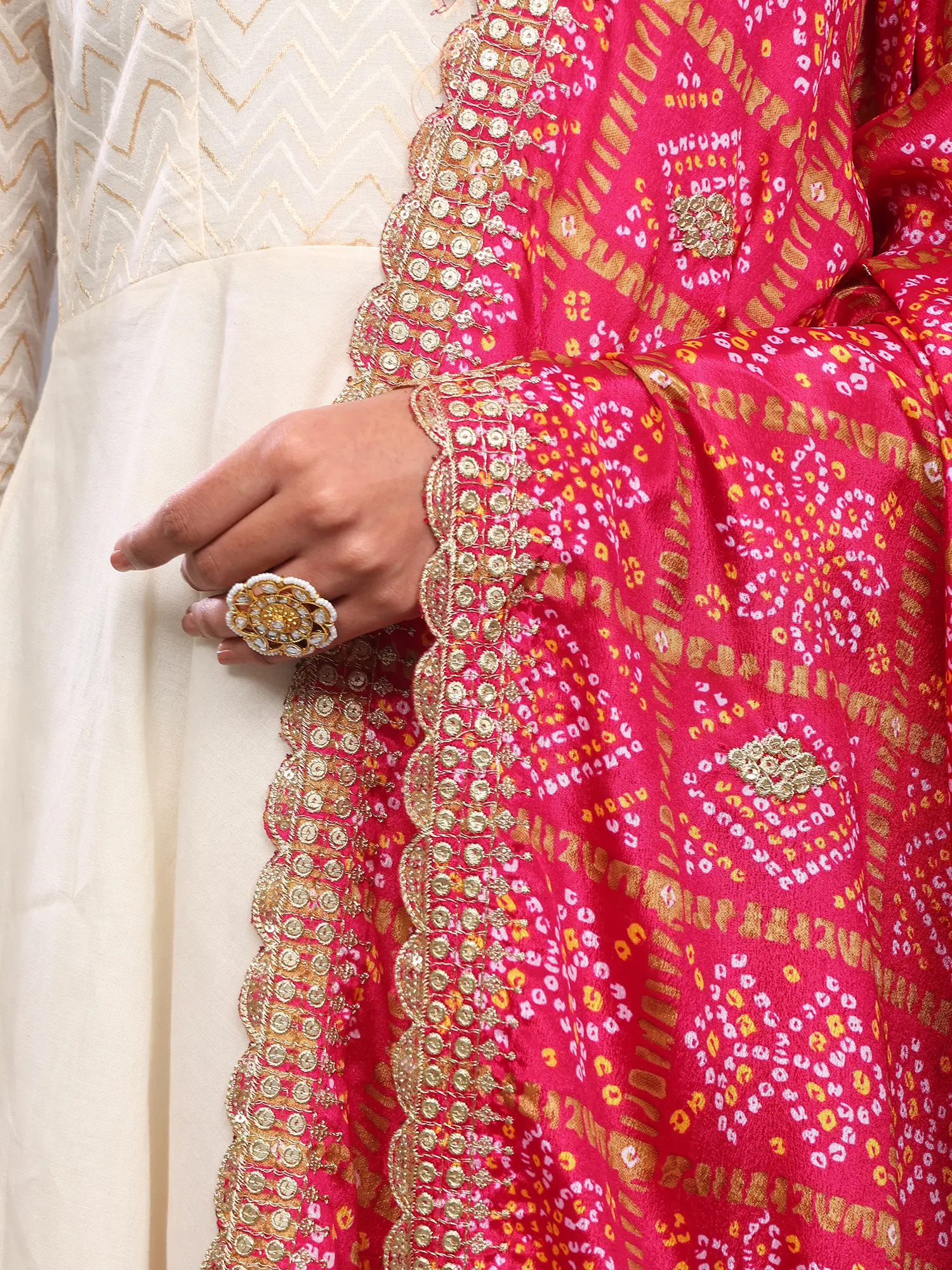 Framing this vibrant canvas is a beautifully crafted scalloped border. This intricate edge treatment adds a refined and finished look, preventing any fraying and enhancing the overall aesthetic. The scalloped design, often rendered with subtle embroidery or metallic thread, lends a graceful, flowing silhouette to the dupatta, ensuring it drapes beautifully and adds a touch of sophistication to any outfit. It's the perfect detail to tie together the traditional artistry of the Bandhani and the modern shimmer of the embellishments.