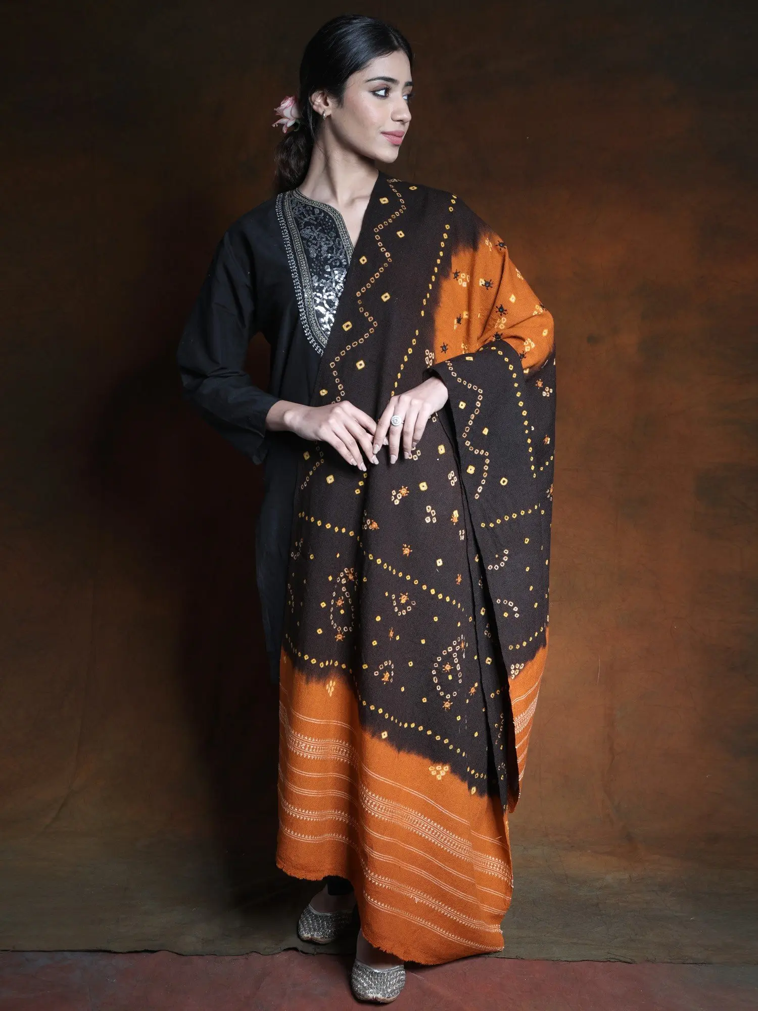 Immerse yourself in the rich artistic heritage of Gujarat with this exquisite pure wool shawl, meticulously crafted in the vibrant region of Kutch. This piece is more than just an accessory; it's a wearable work of art, showcasing the age-old Bandhani tie-dye technique, a craft passed down through generations. The intricate patterns, born from the skilled hands of artisans, tell a story of tradition and cultural richness. Each fold and tie in the Bandhani process creates unique, organic motifs that give this shawl its distinctive character.