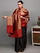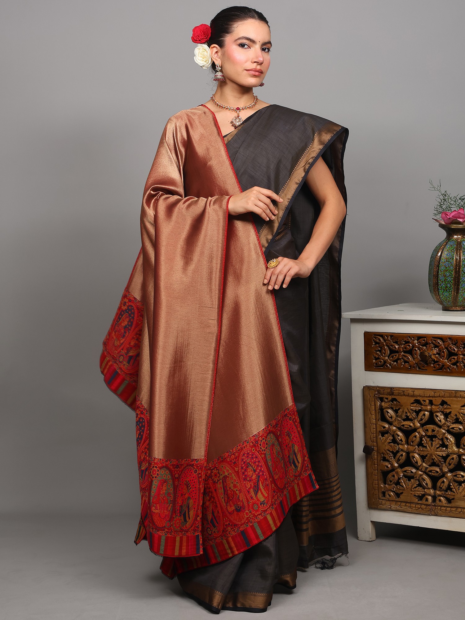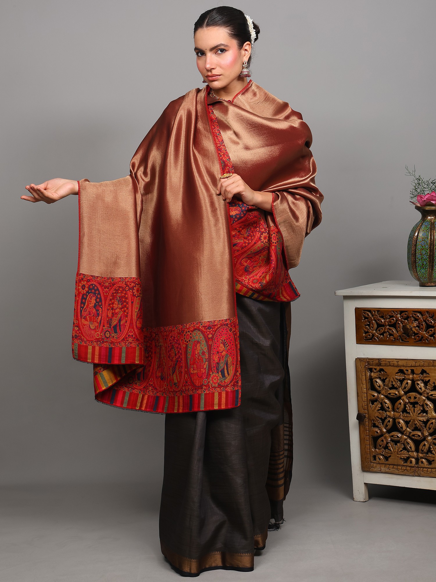 Amber-Green Shimmer Pure Wool Shawl with All-Over Weave in Zari Thread