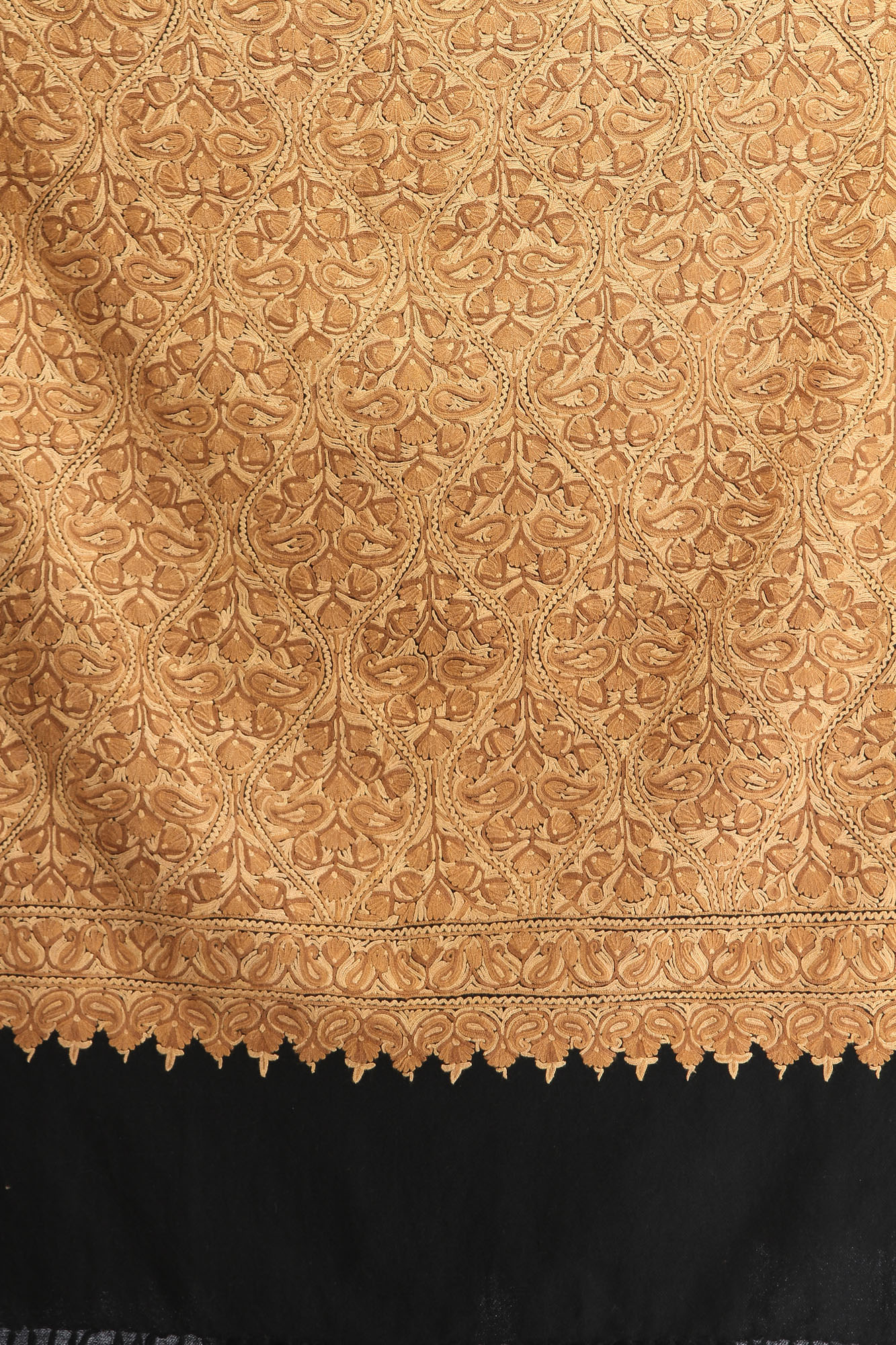 Immerse yourself in the rich heritage of Kashmir with this exquisite stole, a testament to the artistry of Aari hand-embroidery. Crafted from the finest pure wool, this stole promises not only unparalleled warmth but also a luxurious drape that speaks of enduring quality. The captivating design, rendered in warm beige and sophisticated black, showcases a symphony of intricately interwoven floral motifs. Each stitch tells a story of dedication and skill passed down through generations, transforming a simple accessory into a wearable piece of art. The delicate Aari embroidery, characterized by its fine needlework and raised texture, creates a visually stunning pattern that flows across the entire stole. The harmonious contrast between the earthy beige and the deep black further accentuates the intricate detailing, making this piece a true showstopper. Whether draped elegantly over your shoulders for a formal occasion or wrapped casually for a touch of refined style on a cool evening, this stole is designed to elevate any ensemble. Its generous size ensures versatile styling options, allowing you to experiment with different looks and find the perfect way to showcase its beauty. ––––––––––––––––––––