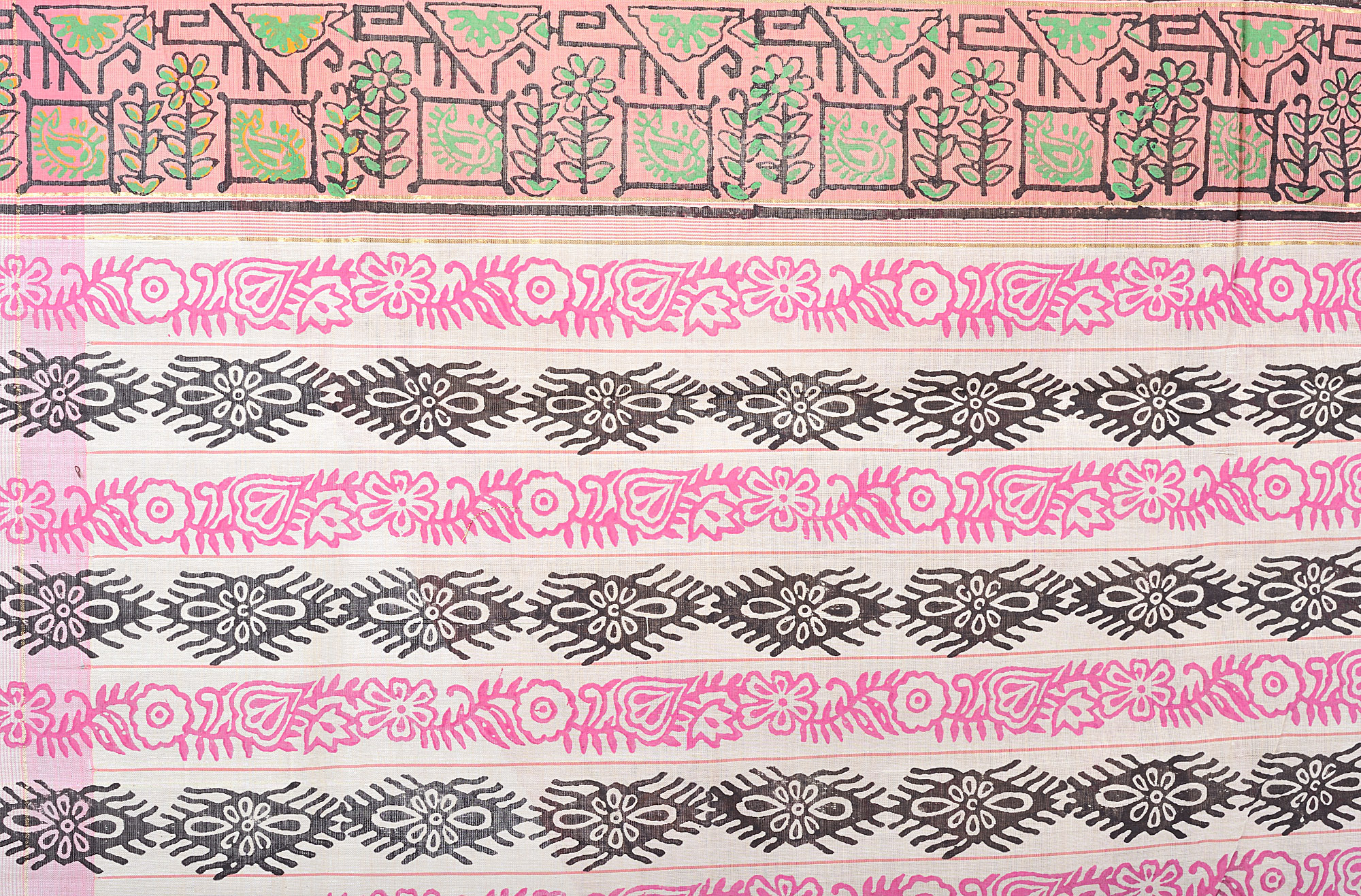 The beauty of this sari is further enhanced by its intricately designed borders. A thin pink band gracefully frames the edges, leading into a more substantial border that features a captivating block-printed design. This decorative band is a symphony of geometric patterns and floral elements, rendered in earthy tones of black, orange, and pink, adding a touch of sophisticated detail. However, the true highlight of this creation is its aanchal, the decorative end piece of the sari. Here, the artistry takes a turn towards painting, with a unique and captivating design that sets this sari apart. This painted aanchal is a conversation starter, a unique artistic expression that adds a personalized touch to this already stunning garment.