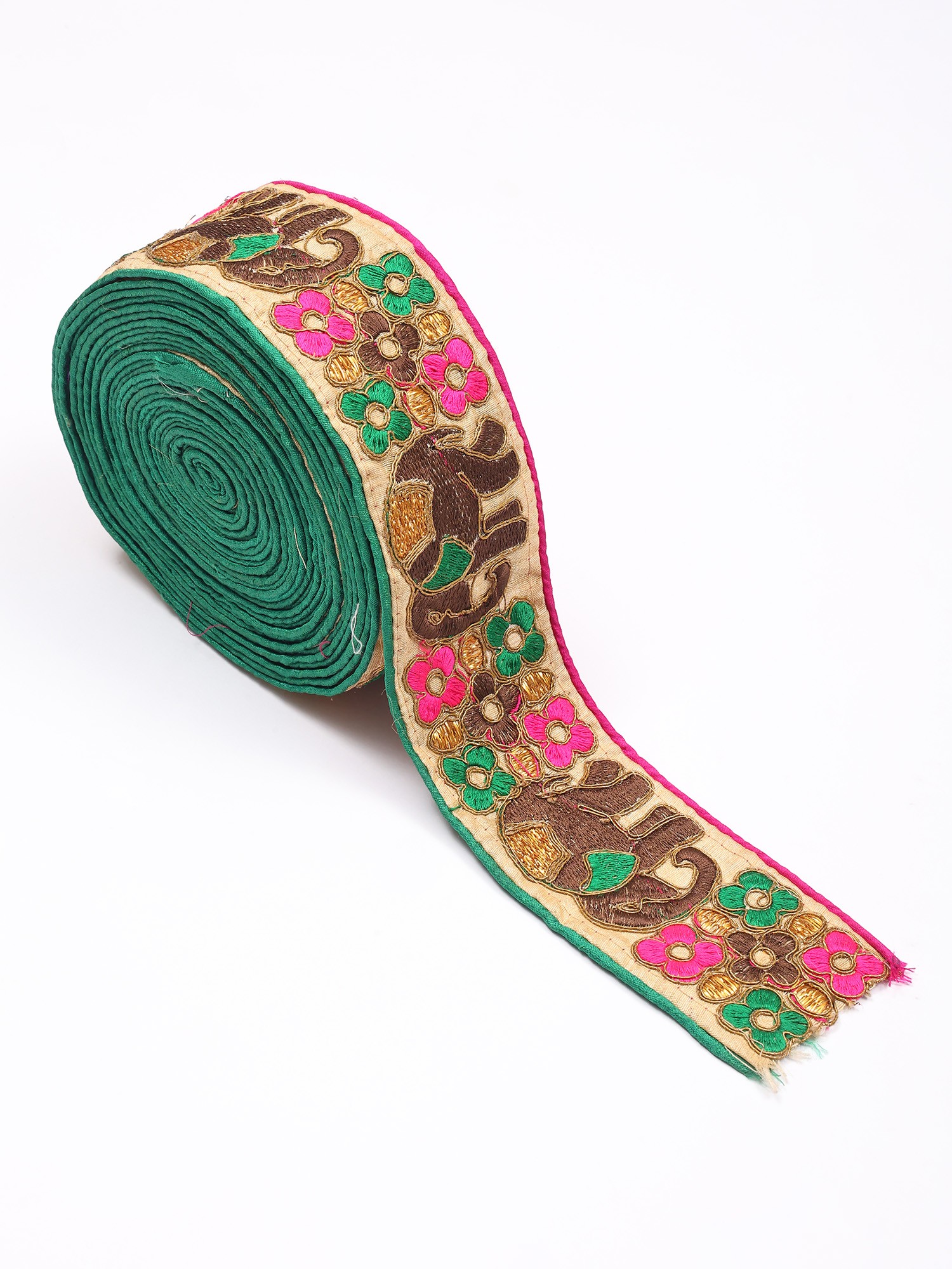 Beige Zari-Embroidered Fabric Border with Green Flowers