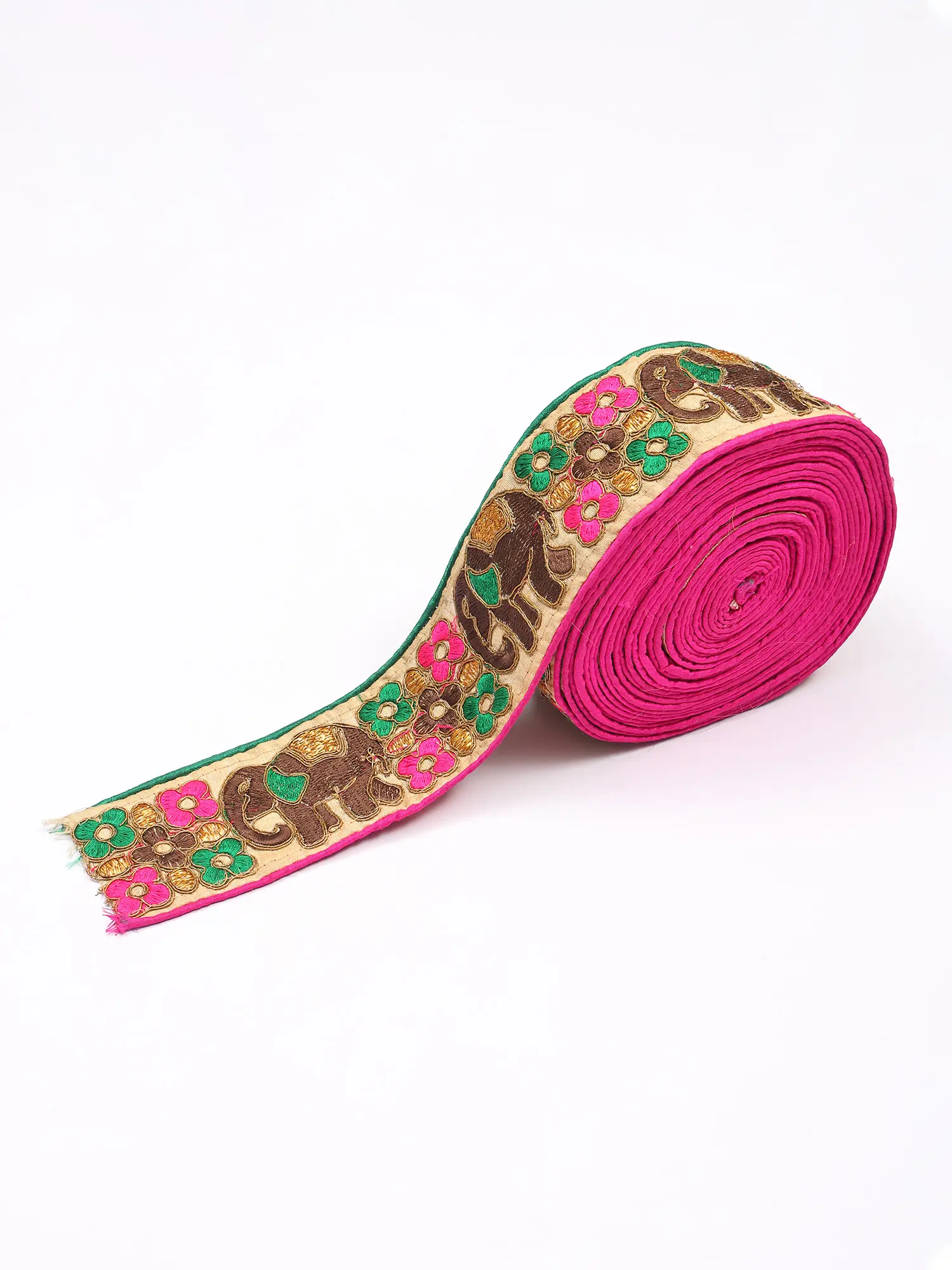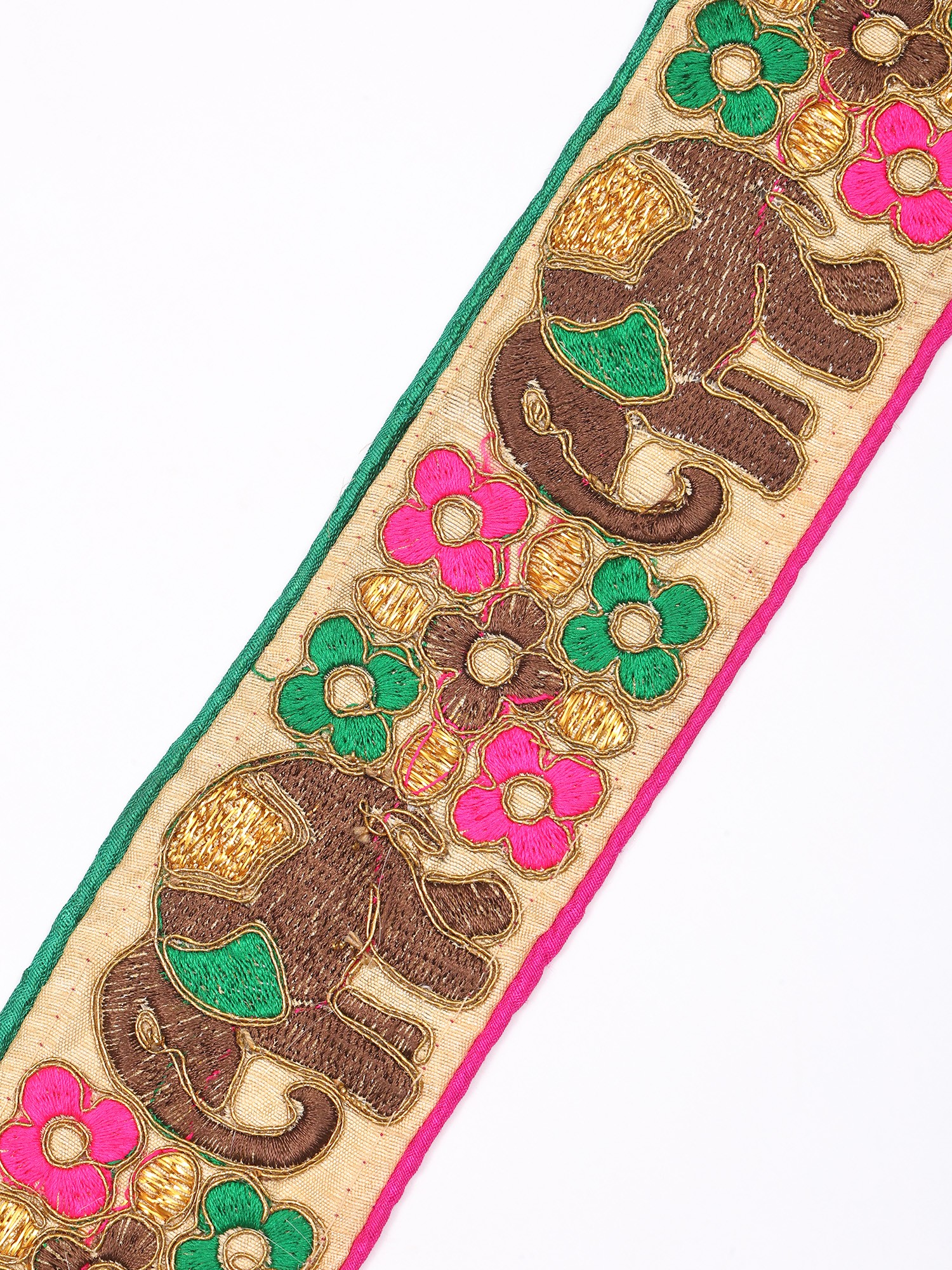The design itself is a captivating tableau, featuring elegantly rendered elephants interspersed with blooming flowers. The detailed embroidery captures the gentle power of the elephants and the delicate beauty of the flora, rendered in a palette of warm browns, vibrant pinks, and refreshing greens. This trim measures 2.8 inches (7.1 cm) in width, offering a substantial presence that is neither overwhelming nor understated, perfect for making a statement.