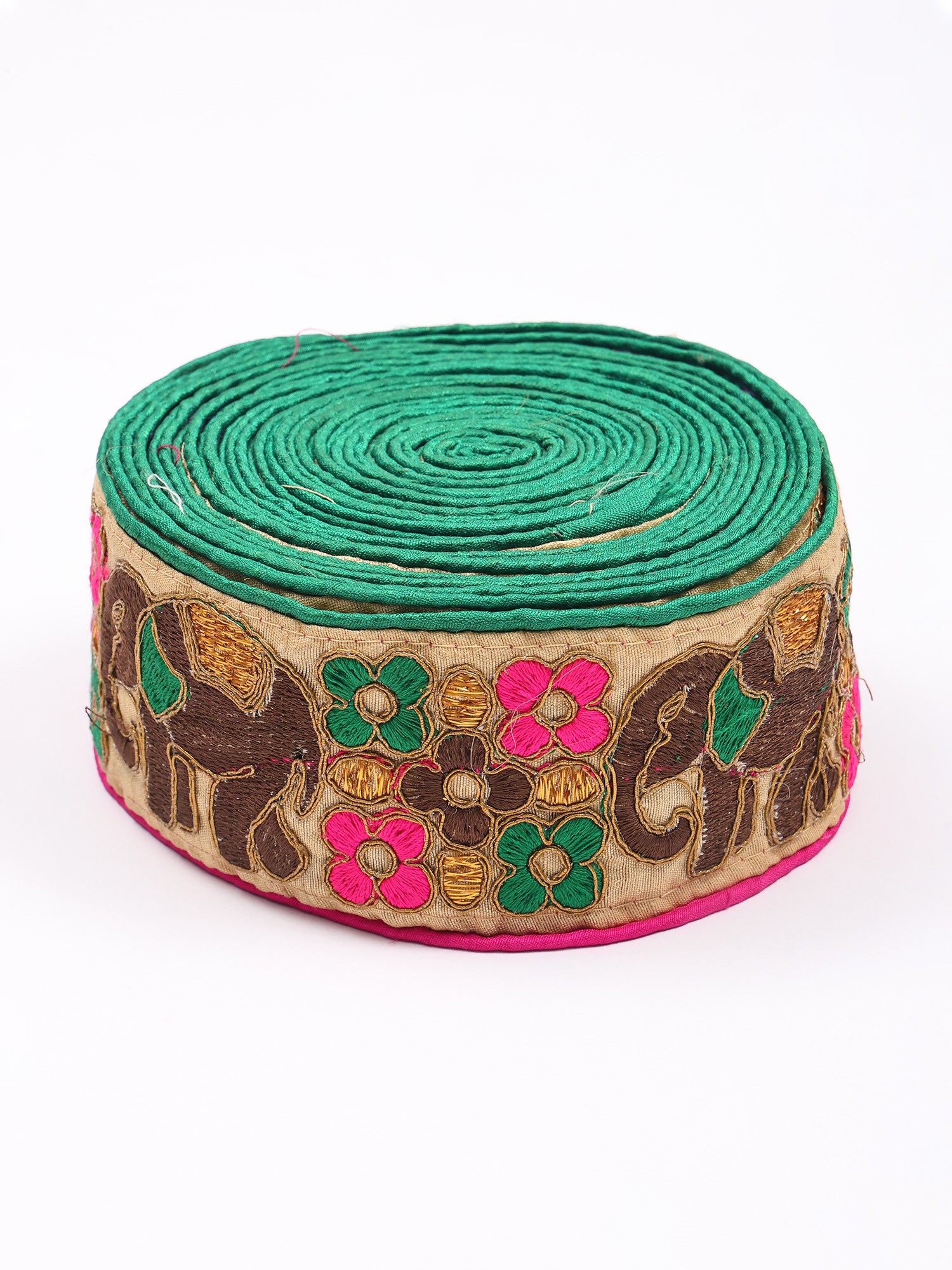 Witness the culmination of meticulous craftsmanship in every inch. Woven from lustrous art silk, the base fabric provides a luxurious foundation for the rich embroidery that adorns it. Skilled artisans have painstakingly stitched each motif, ensuring a depth and texture that speaks to hours of dedicated labor. You'll appreciate the precision and care that has gone into creating a trim that feels as substantial as it looks.