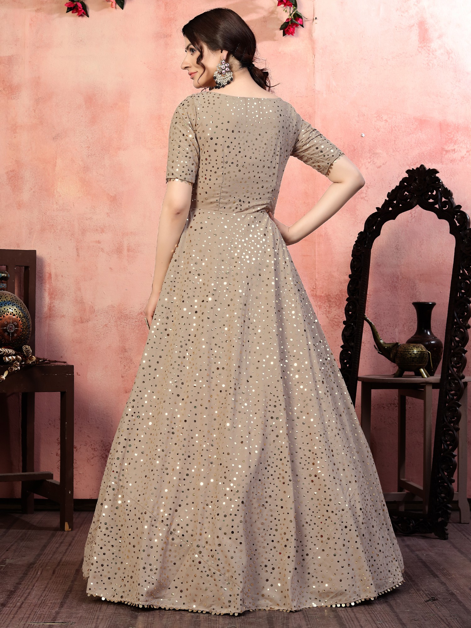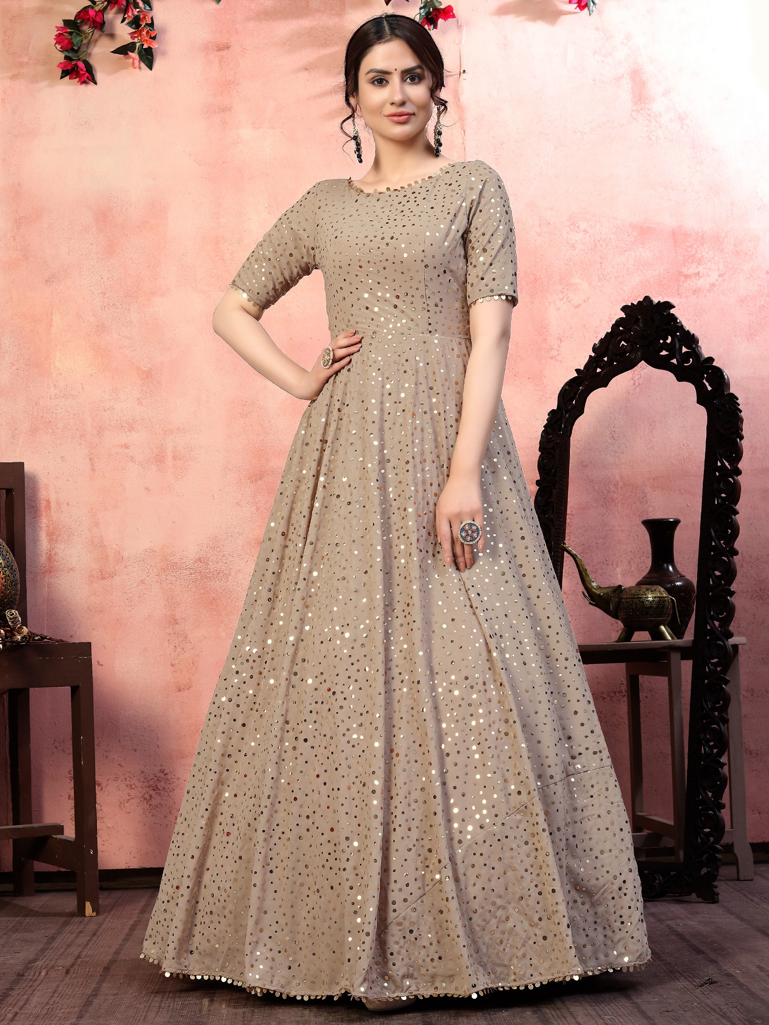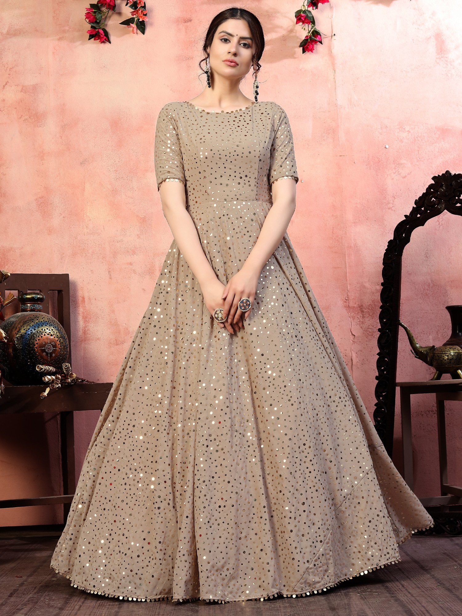 The muted beige shade of this georgette gown speaks the language of grace and style. The beautiful flow of the gown lends you a fashionable and effortless charm, which is amplified by the shimmering sequins all over. With a fit tailored for lovers of Indo-western dresses, this gown is a piece that will always be loved with the air of elegance that surrounds it.