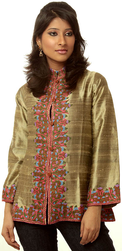 Beige Jacket from Kashmir with Crewel Embroidered Paisleys by Hand