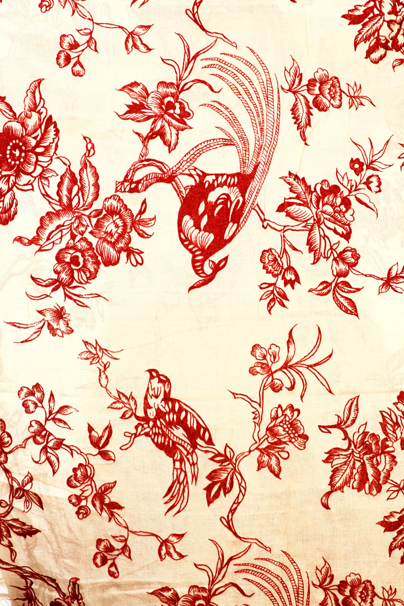The stole is adorned with a stunning all-over print featuring a harmonious interplay of flora and fauna. Deep crimson motifs of gracefully rendered birds, captured mid-flight or perched amongst branches, are interwoven with abundant blooming flowers and lush foliage. The classic toile-inspired design lends a vintage charm, while the detailed linework adds a sophisticated depth. This print is not merely decorative; it tells a story of nature's artistry, bringing a touch of natural wonder to your everyday wear.
