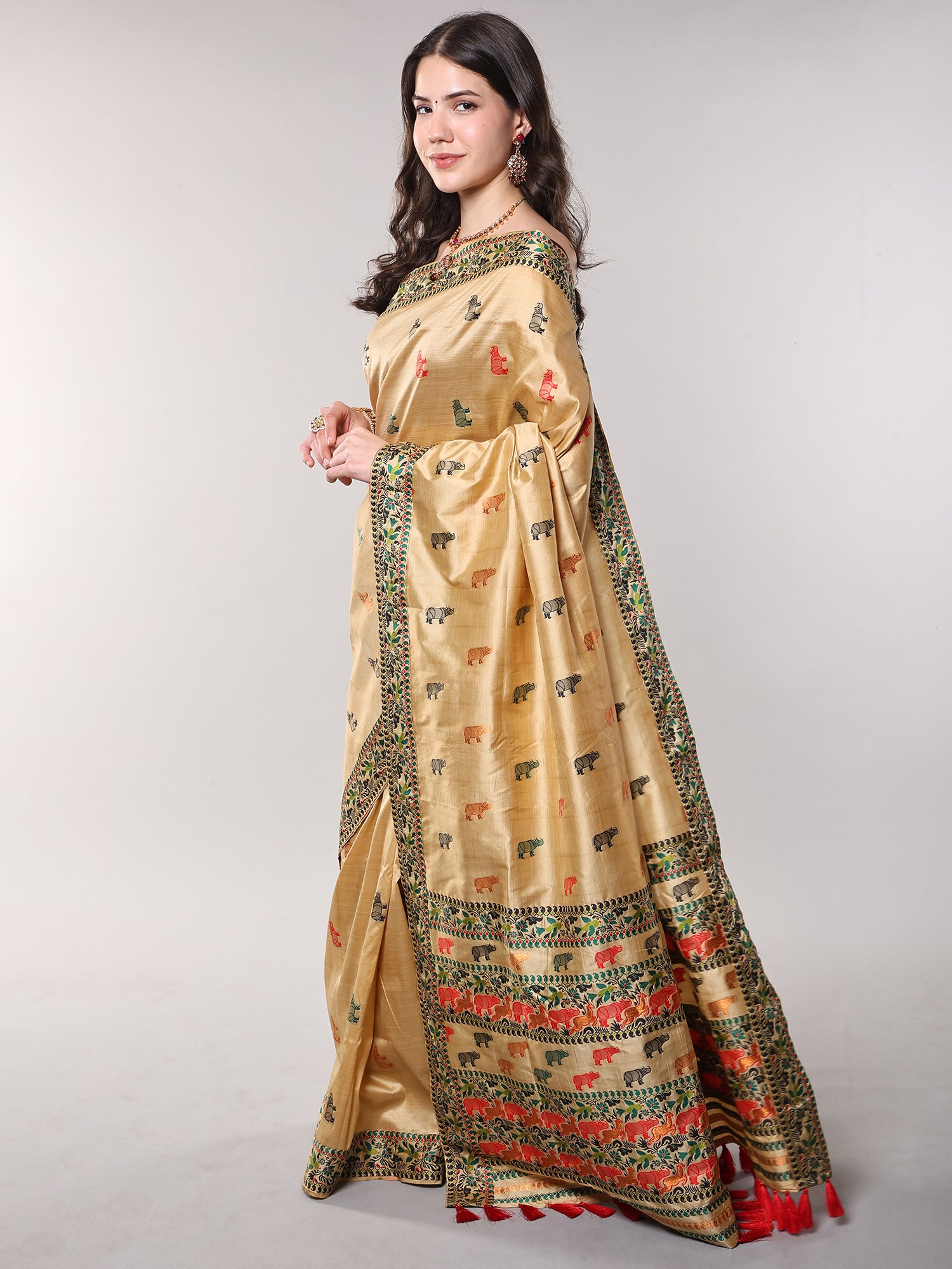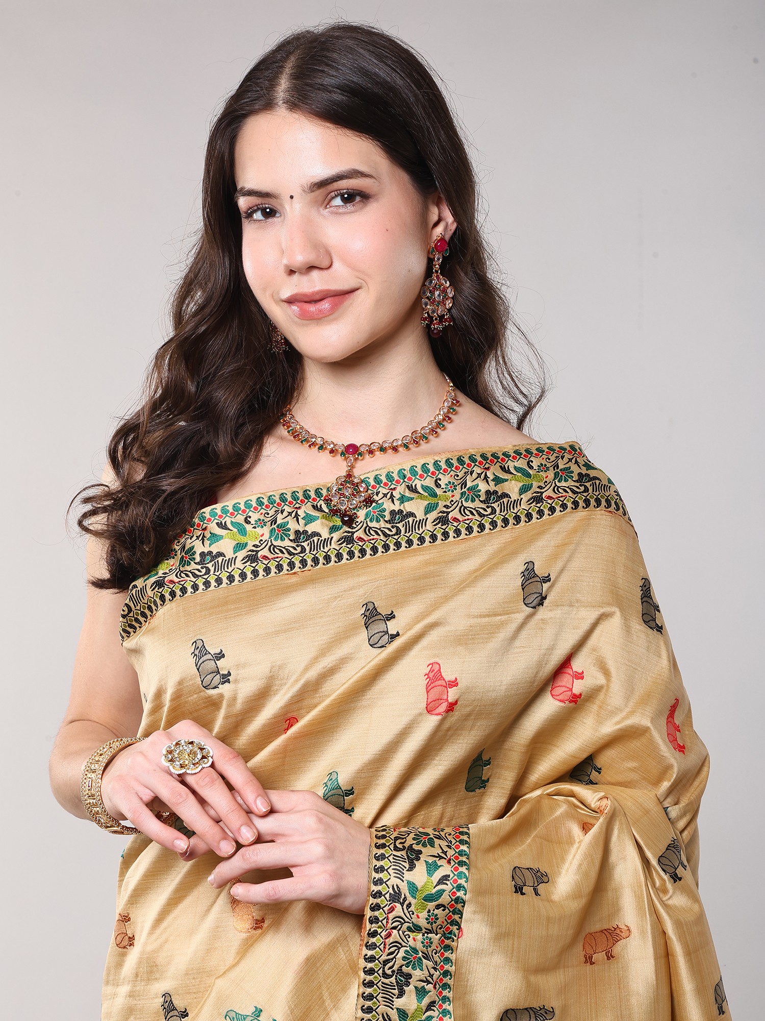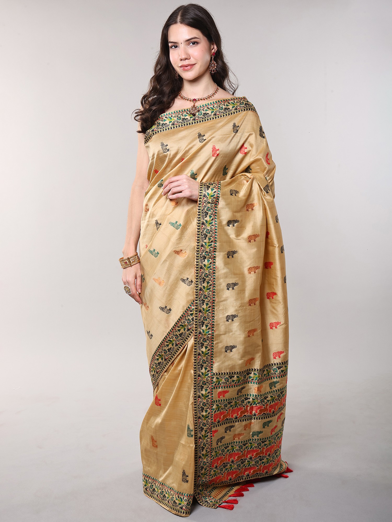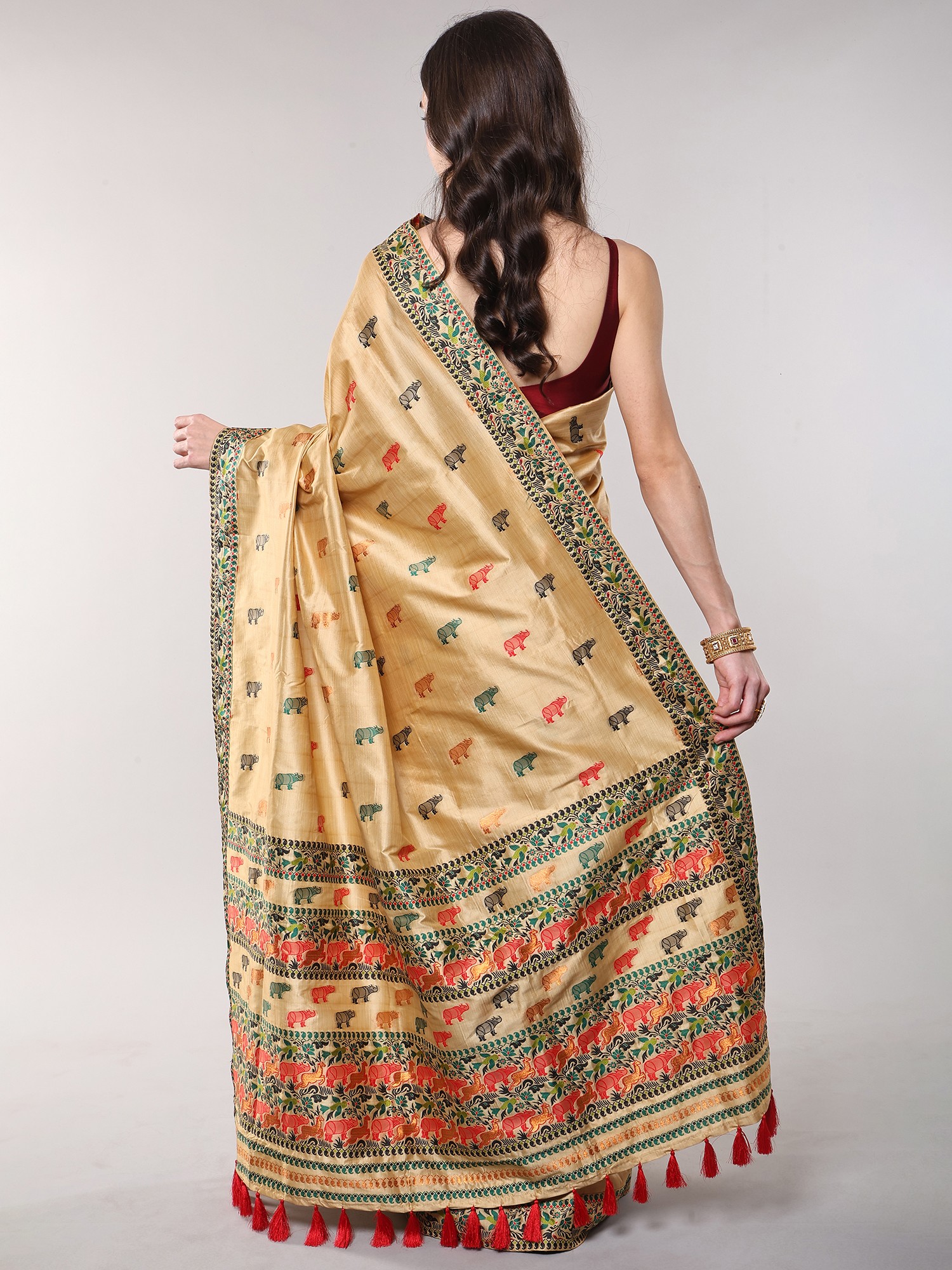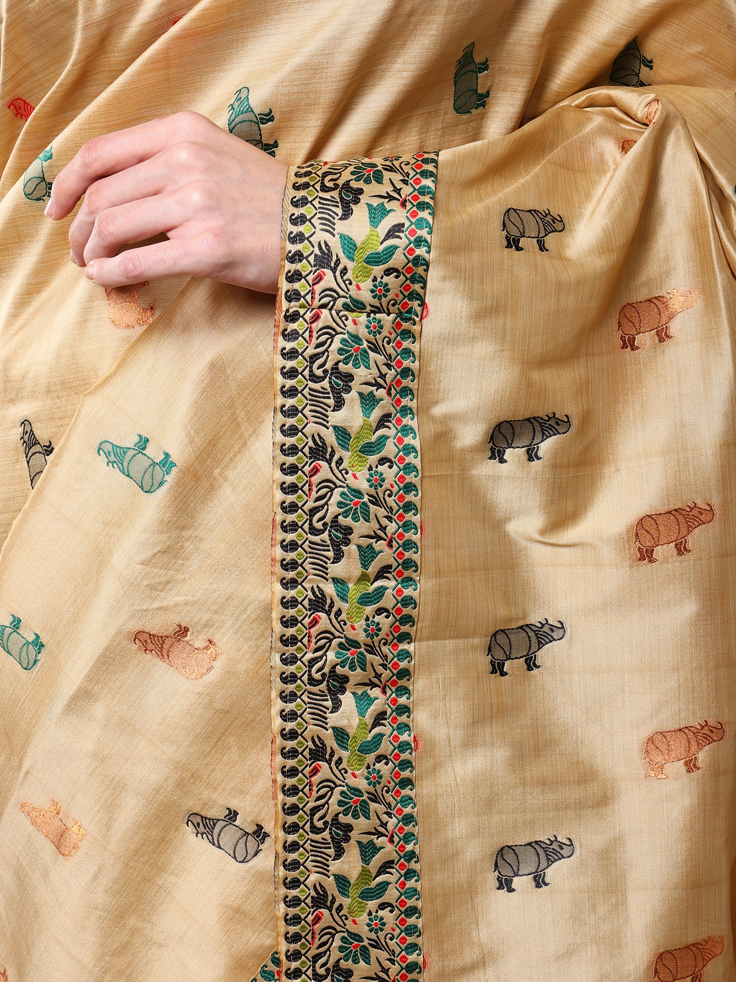 Beige Tussar Silk Saree with Woven Rhinos All-Over and Parrots Border from Assam