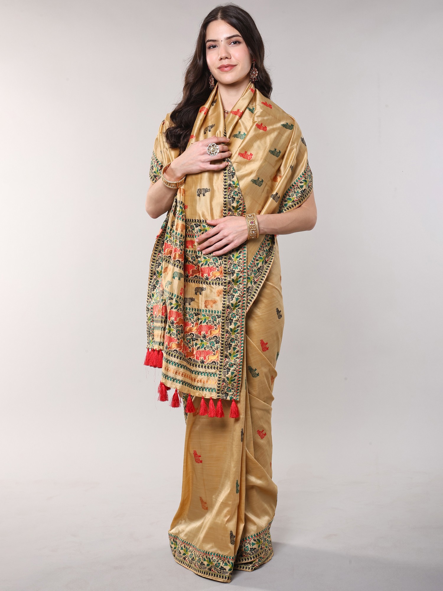 The soft, neutral beige of the Tussar silk serves as a stunning backdrop for a captivating all-over weave of playful rhinos, their forms rendered with charming detail. Framing this captivating scene is a vibrant border, alive with the colorful flight of parrots and intricate floral patterns, each element thoughtfully integrated to create a harmonious visual symphony. This piece arrives with a tailored blouse and underskirt, ensuring a perfect fit and a seamless ensemble.