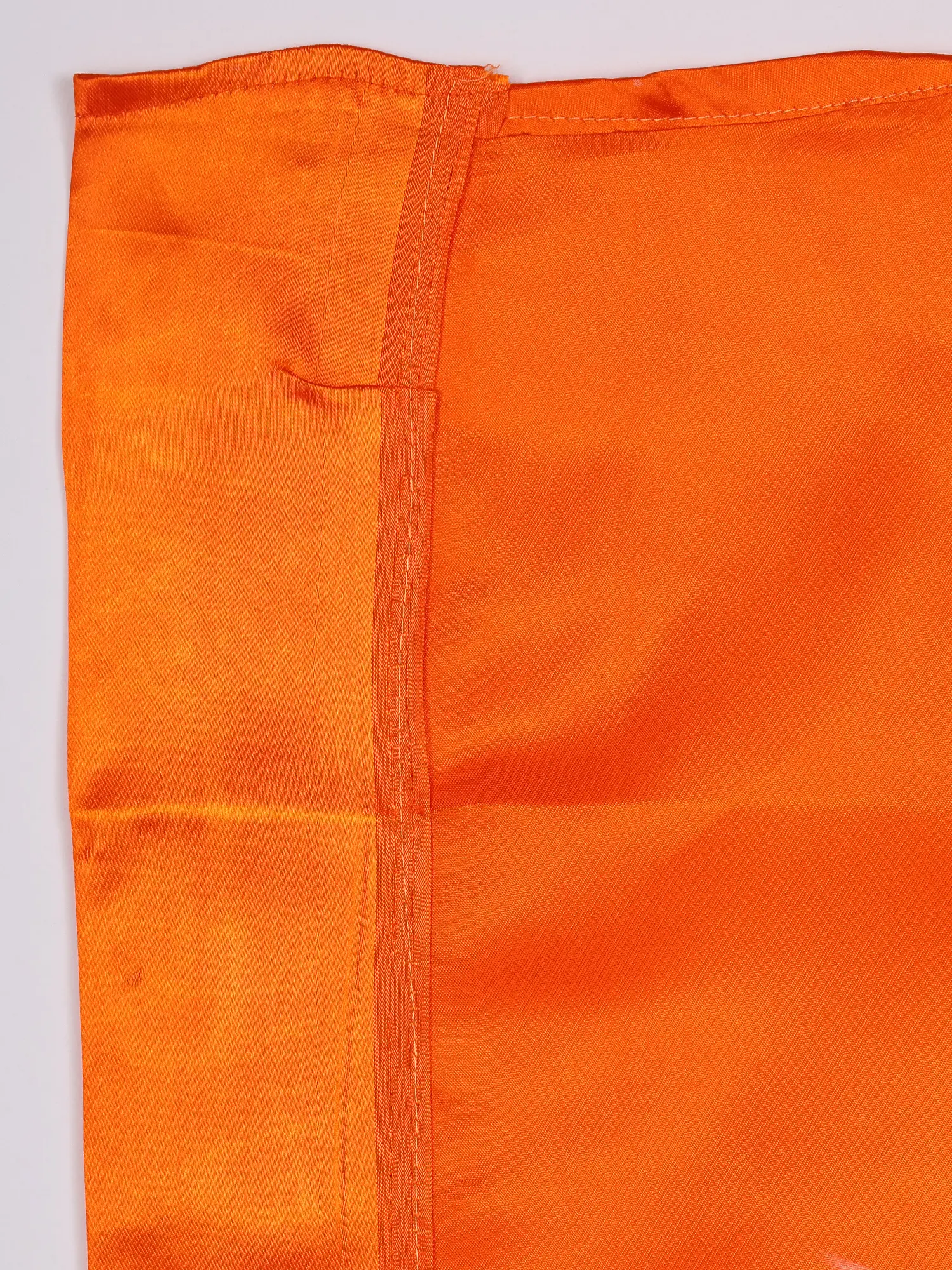 The rich, auspicious saffron hue serves as a backdrop for the iconic "Om" symbol, rendered in a crisp, contrasting white. This powerful motif, radiating with stylized sun rays, is thoughtfully placed to command attention. The generous dimensions, measuring approximately 42 inches in length by 28 inches in width, ensure it makes a significant and graceful statement wherever it is displayed.