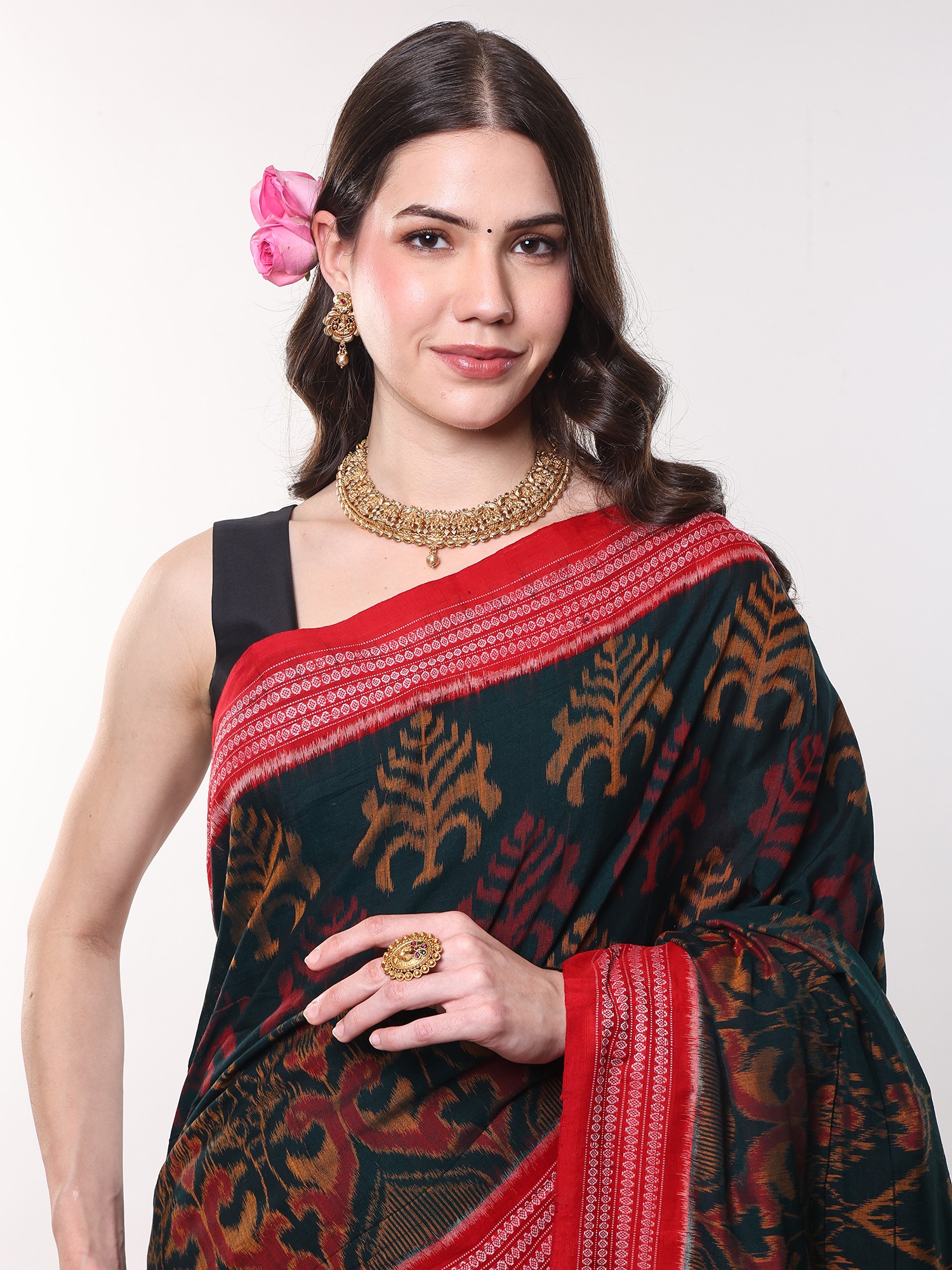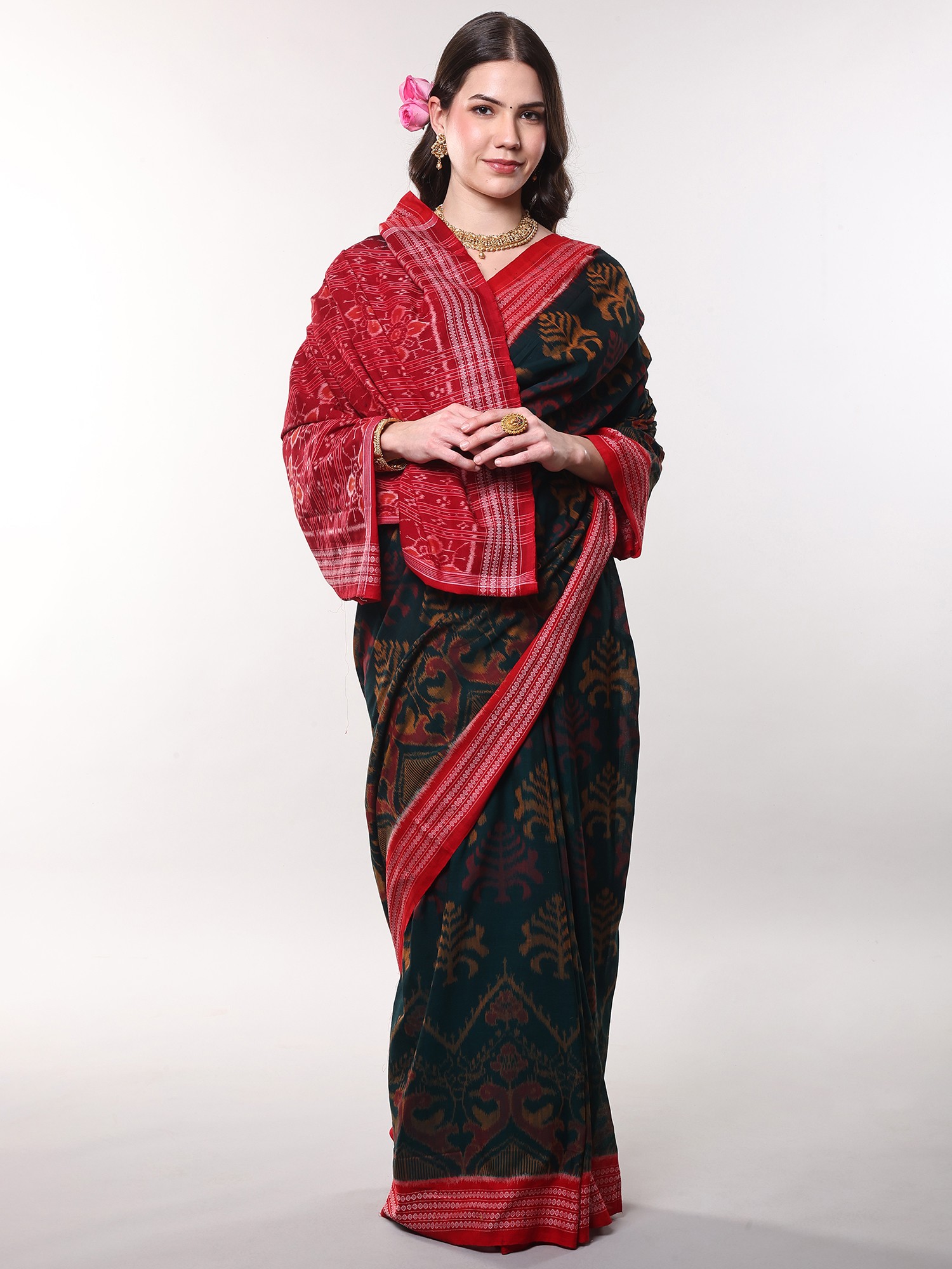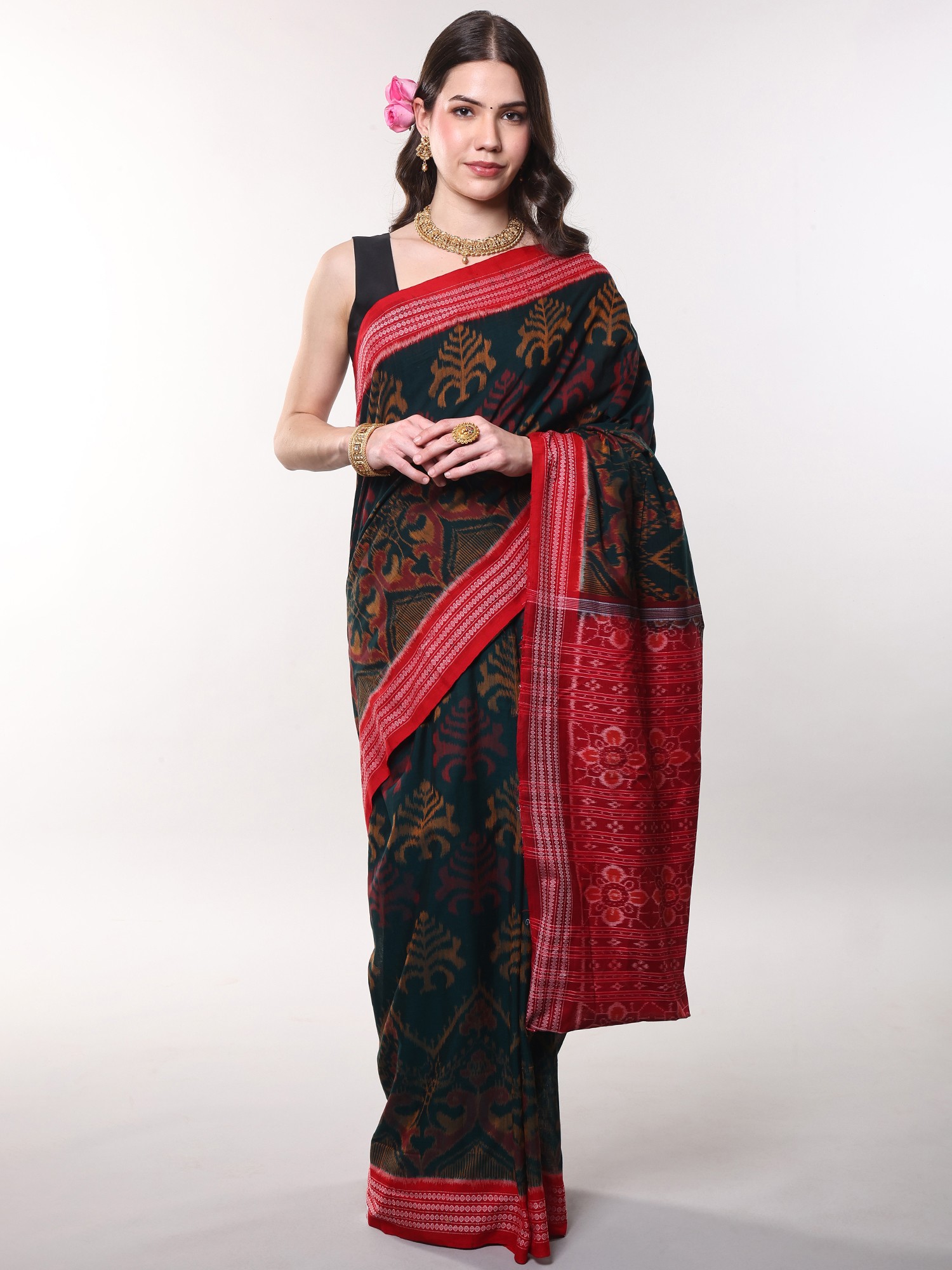 Pure Cotton Sambhalpuri Saree with Ikat Woven Pallu and Temple Border