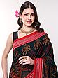 The deep, sophisticated bistro-green hue serves as the perfect backdrop for the captivating motifs, creating a mesmerizing visual rhythm. You’ll appreciate the striking contrast offered by the vibrant red border, beautifully embellished with a delicate Rudraksha pattern, adding a subtle yet distinct spiritual undertone. The pallu, with its bold floral accents within the striped border, offers a stunning focal point, making each fold a work of art. The entire piece unfolds as a masterpiece of color and design.